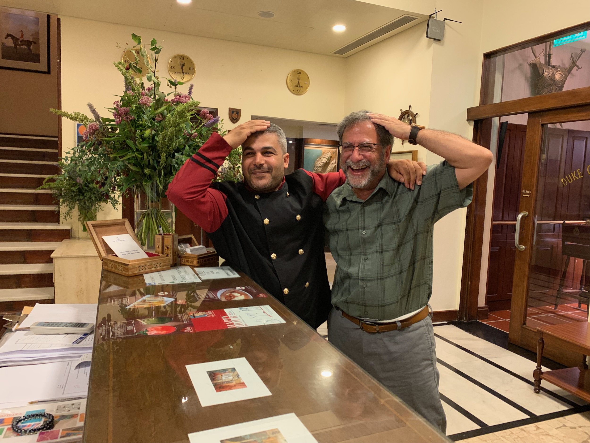 David and his buddy showing us the hotel shorthand for "At Your Service".