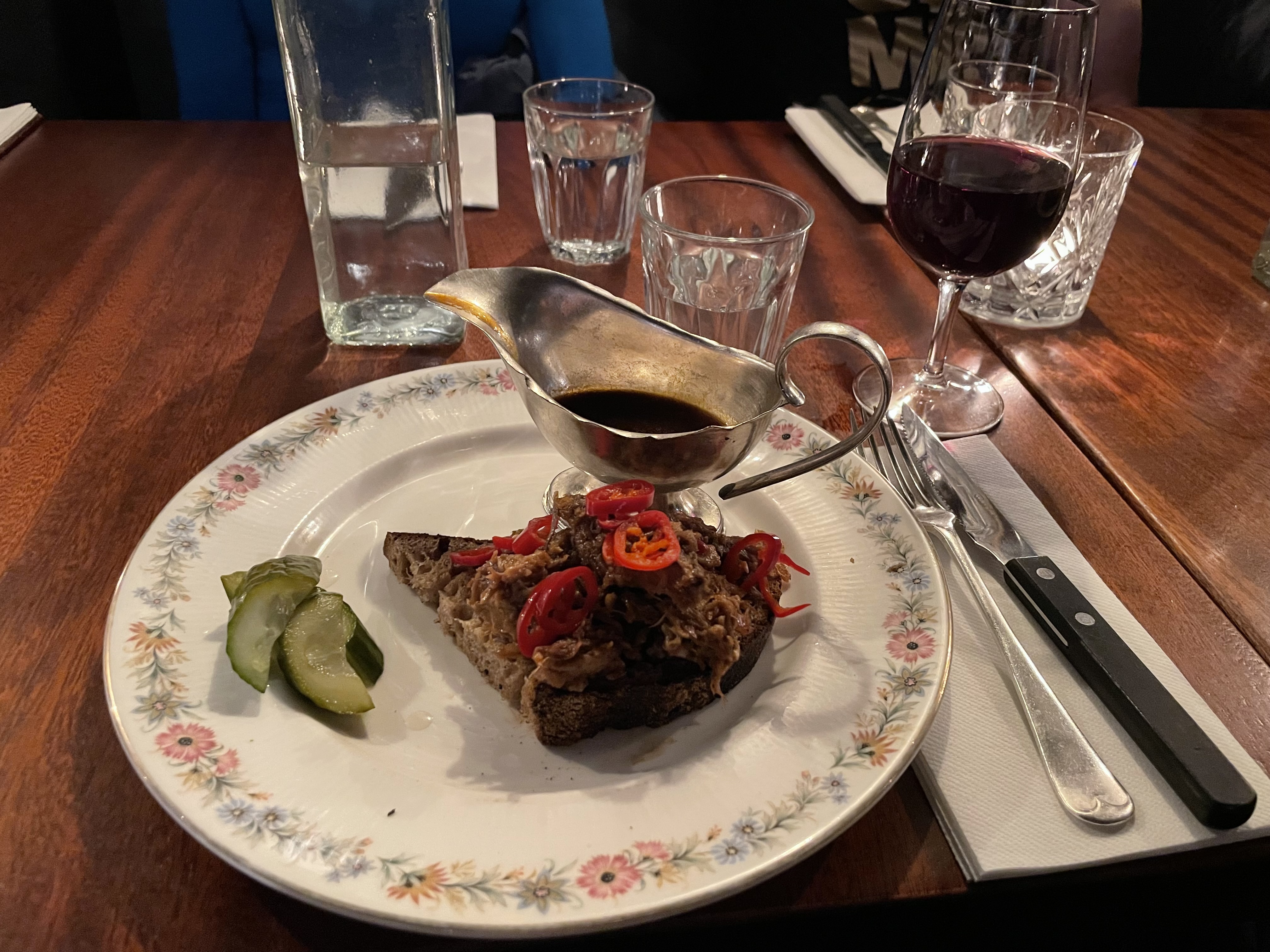 Our first food stop served us croquettes with vermouth. While eating, we noticed a large, energetic, and buzzing group of people moving down the alley next to the restaurant. It was a very famous F-1 driver, his entourage, and a ton of fans trying to get selfies. Our second stop was a restaurant in an old brothel and strip club. We tried pig cheek on toast with red peppers and red wine. This particular restaurant is known for allowing its animals to die naturally before butchering. As an in-between, we stopped by a liquor seller to try Genever, Old Tom gin, and London dry gin. We made our way to Chinatown and were served Indonesian Beef Rendang and roti with a Singapore sling. Continuing in Chinatown we tried beef bao buns followed by Chinese French toast. All of these stops had long lines and we were able to get right in as a group. I am sure those waiting in the queue were not happy. We finished the night with a beer at a pub with a couple from our food tour. Turns out they are co-owners of Wooden Robot and Elsewhere, a popular brewery and bar in Charlotte. It is a crazy small world.