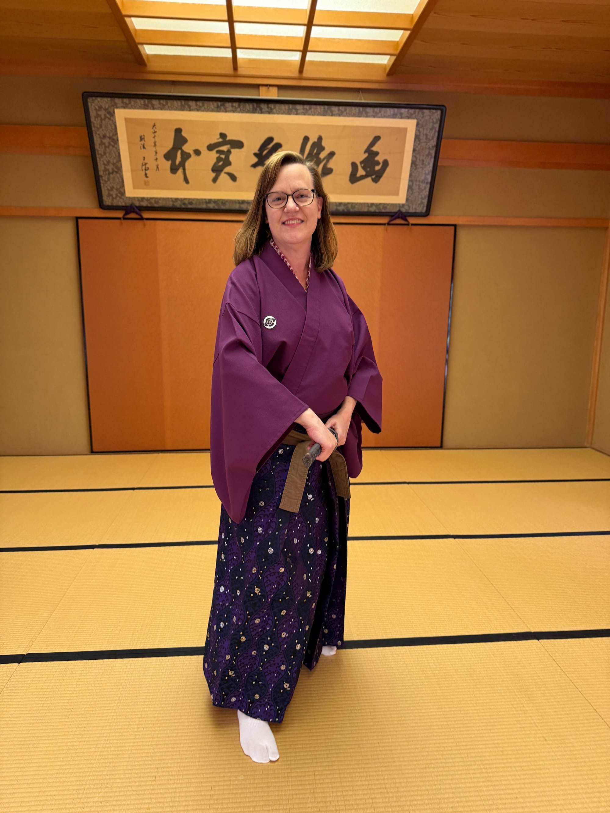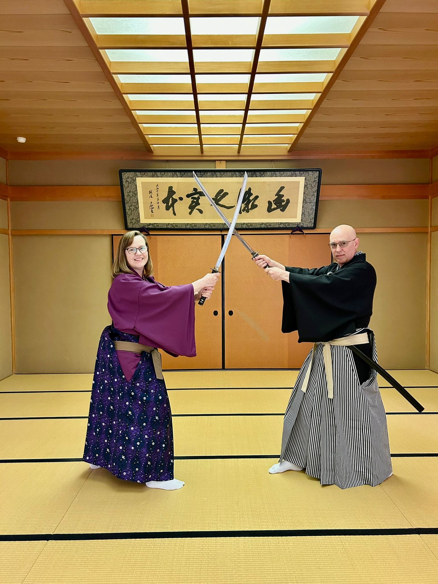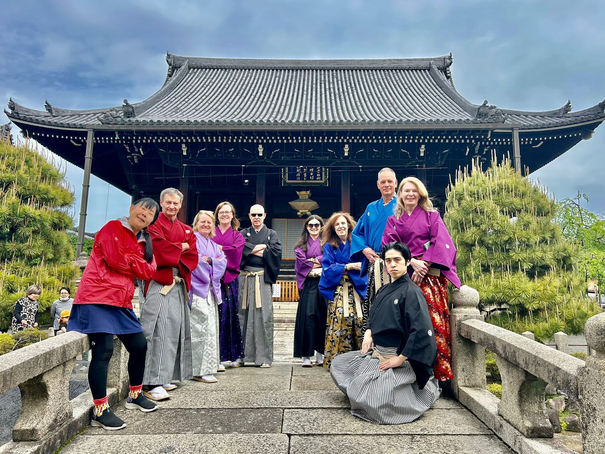 Our planned activities for the day were more on the Zen spectrum. We started the day with a Samurai experience where we learned some facts about how the Samurai lived and then we were dressed up in traditional Samurai clothing and were given lessons on proper sword technique, folding fan technique, and other Kabuki theatre movements. All of this was held in one of the central Kyoto Buddhist temples, in their dojo.