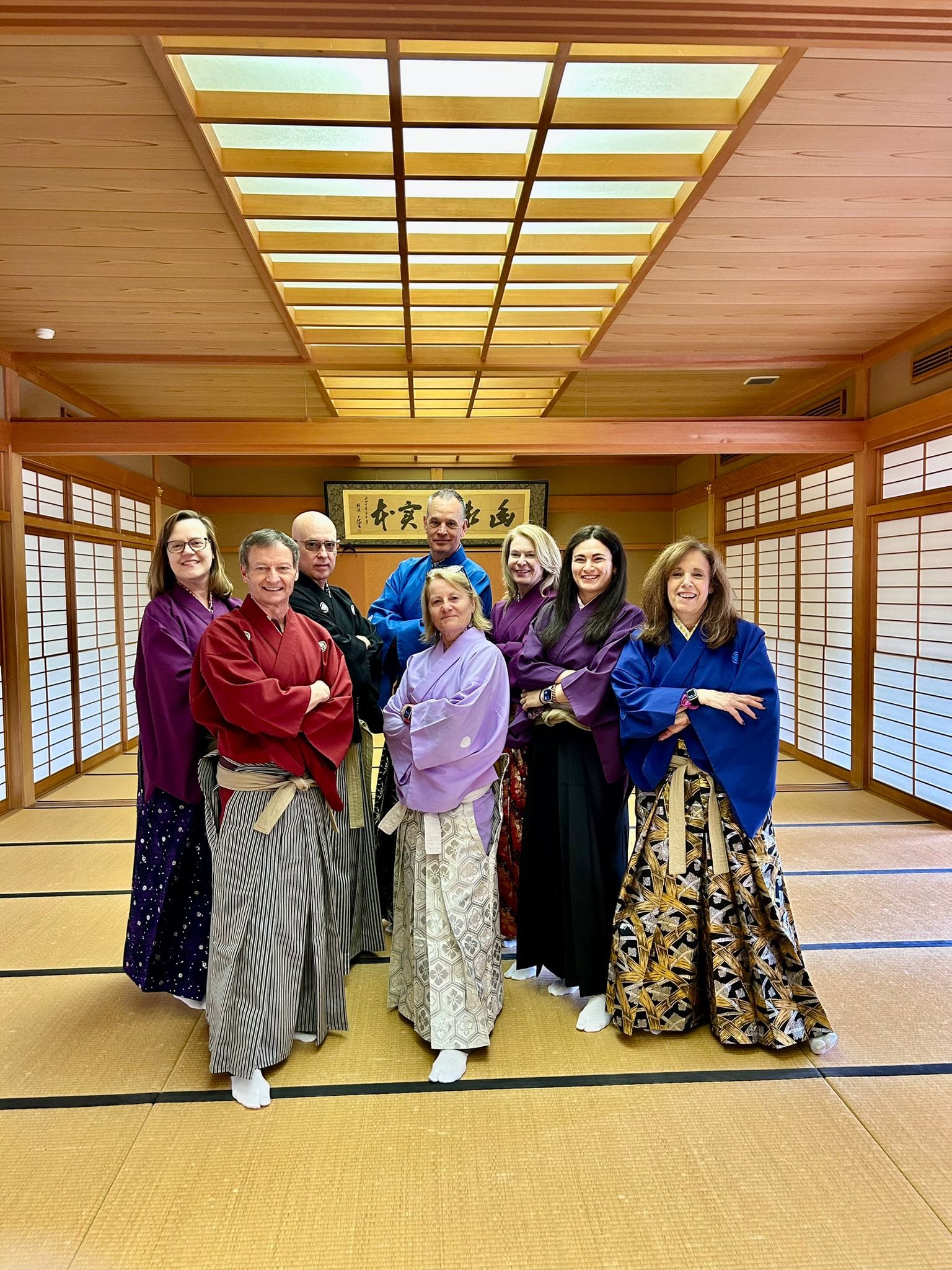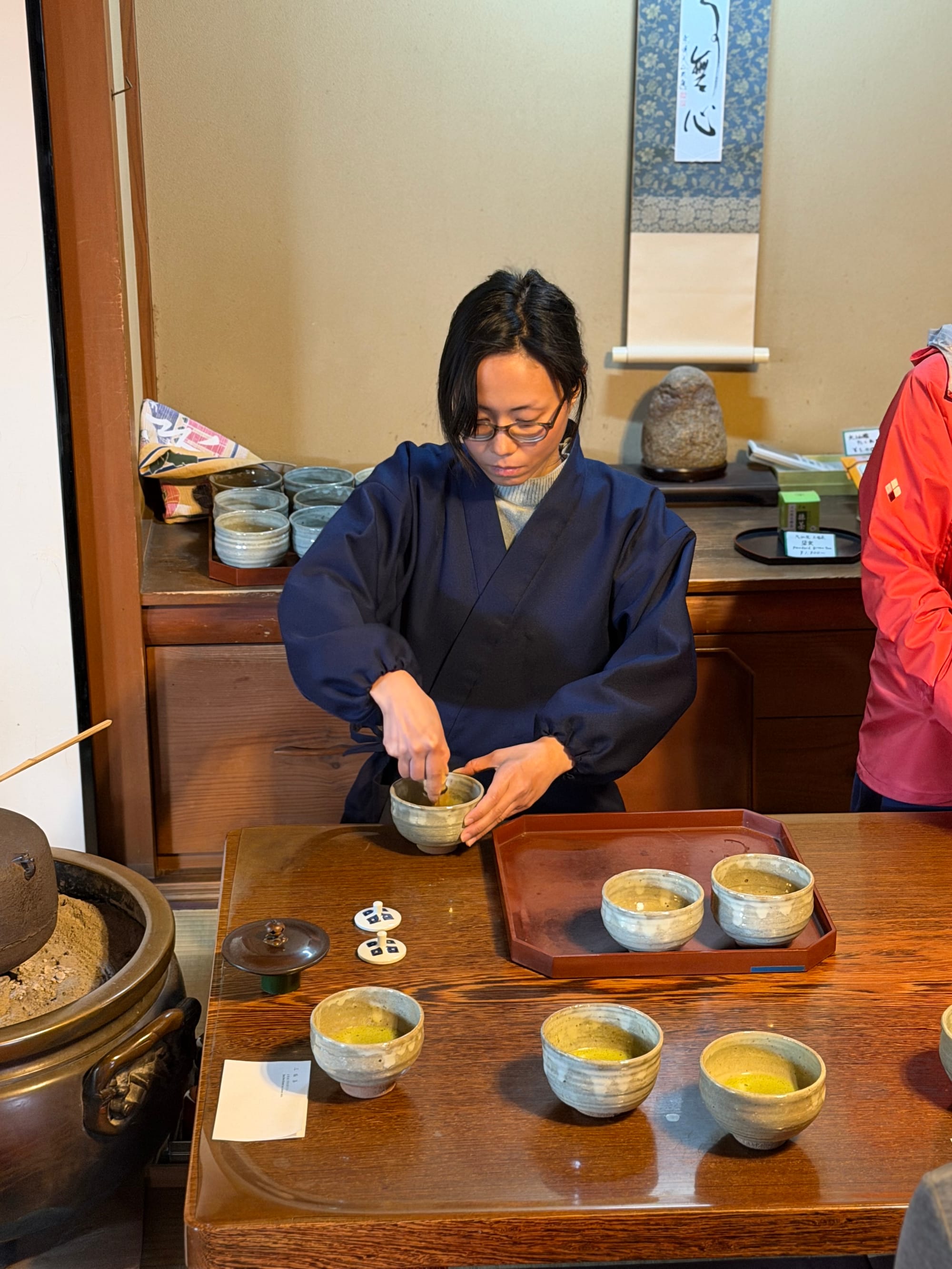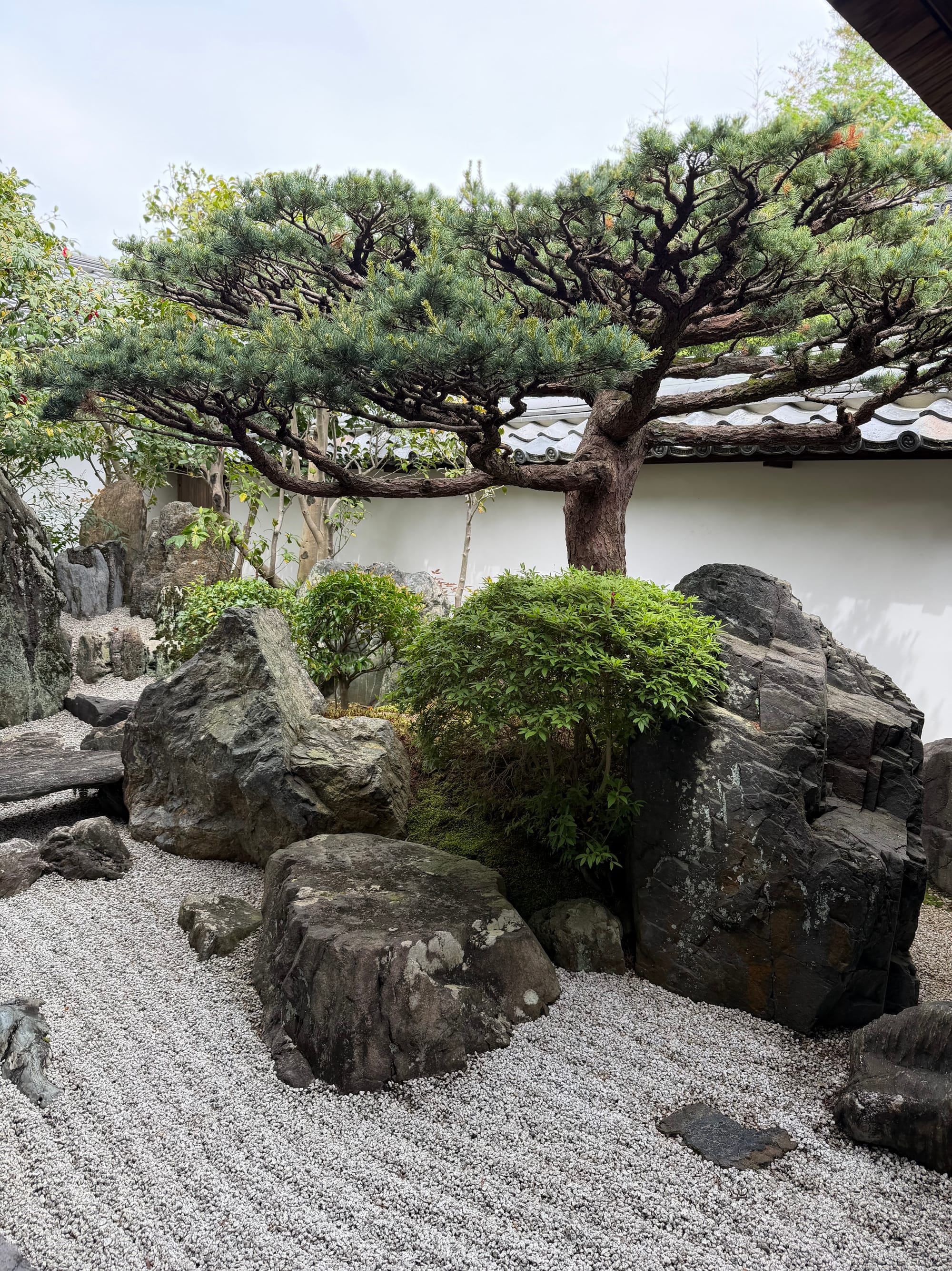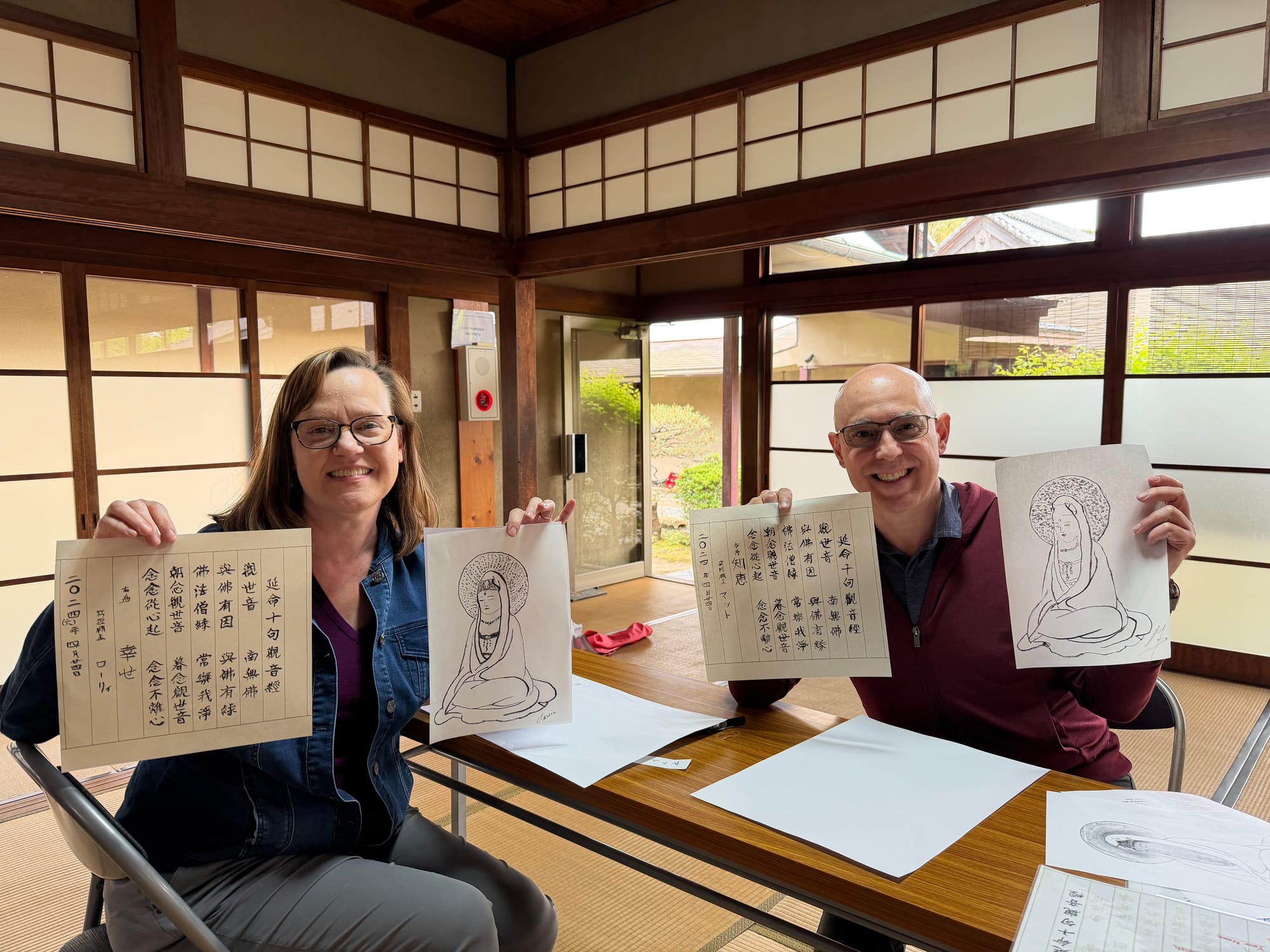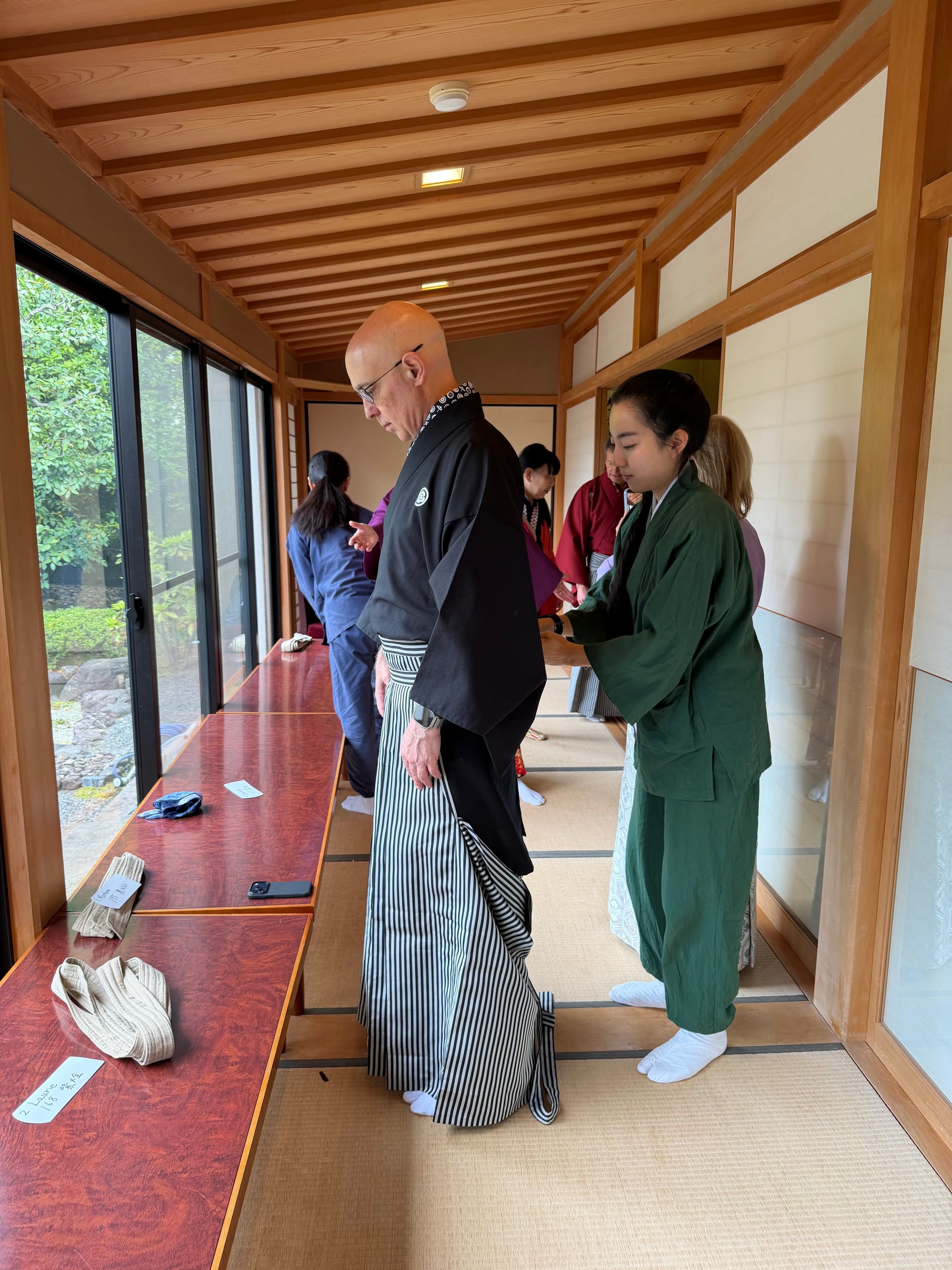 The next visit of the day was at a Buddhist temple. We did a Zen meditation session with one of the monks from the temple. We completed a full 25 minute session that felt like only 10 minutes. After meditation, we practiced Sutra calligraphy. Sutra is a meditative Buddhist practice of transcribing sacred texts with focus and devotion. This practice fosters concentration, calmness, and mindfulness, often using a brush, ink, and traditional paper to copy sutras like the Heart Sutra. Both experiences were both calming and informative. On our way through the temple after meditation we were shown their Zen garden and learned about the story of the garden and what it represented. To finish the experience, we enjoyed a small tea ceremony with our guide. This particular temple was where the monk that created the tea ceremony lived for many years. This temple is still the original build from the 15th century. The tea room we visited was the same room and view as experienced by the monks in the 15th century. Even though you are in the middle of Kyoto, there are no modern builds visible.