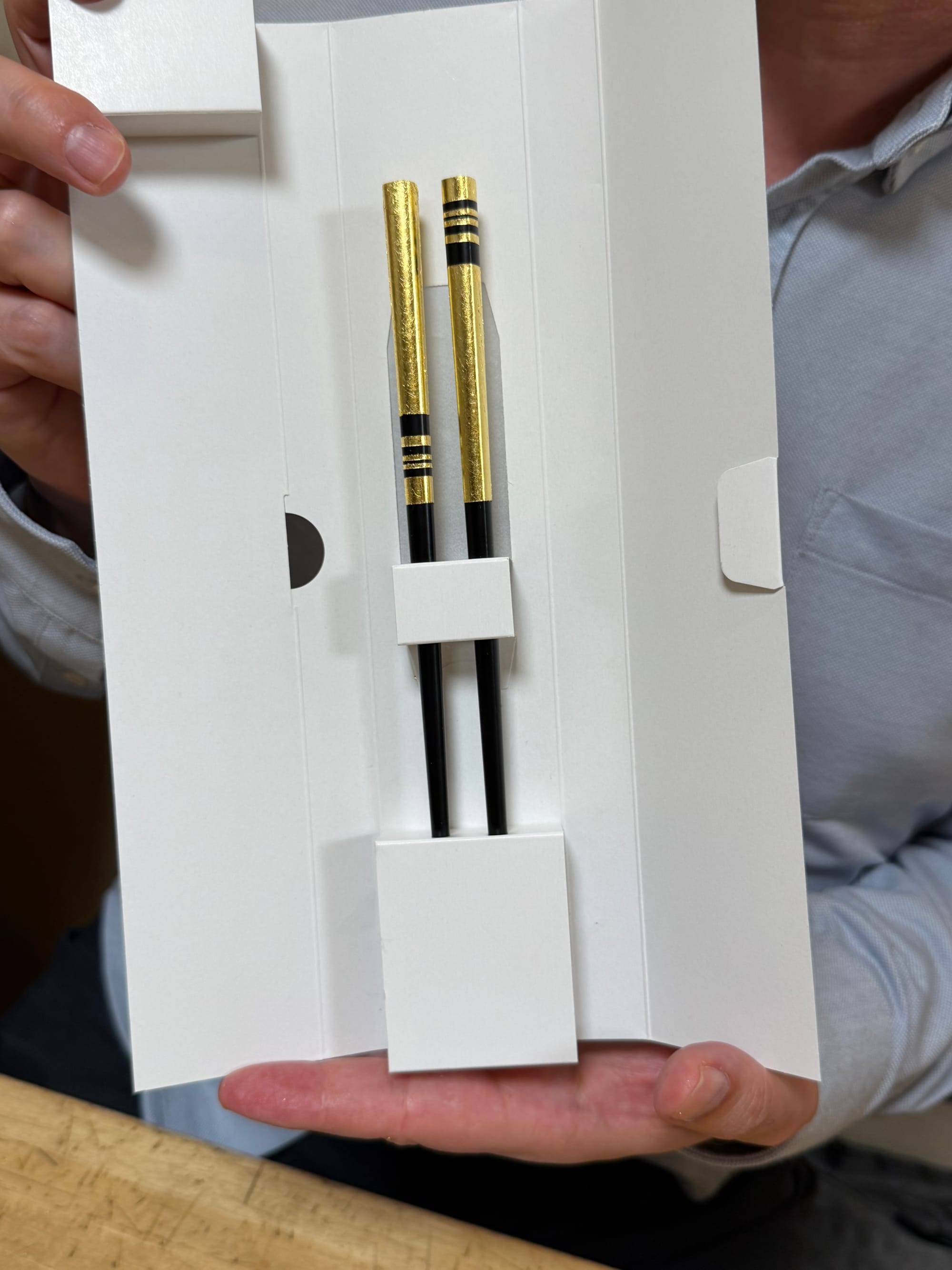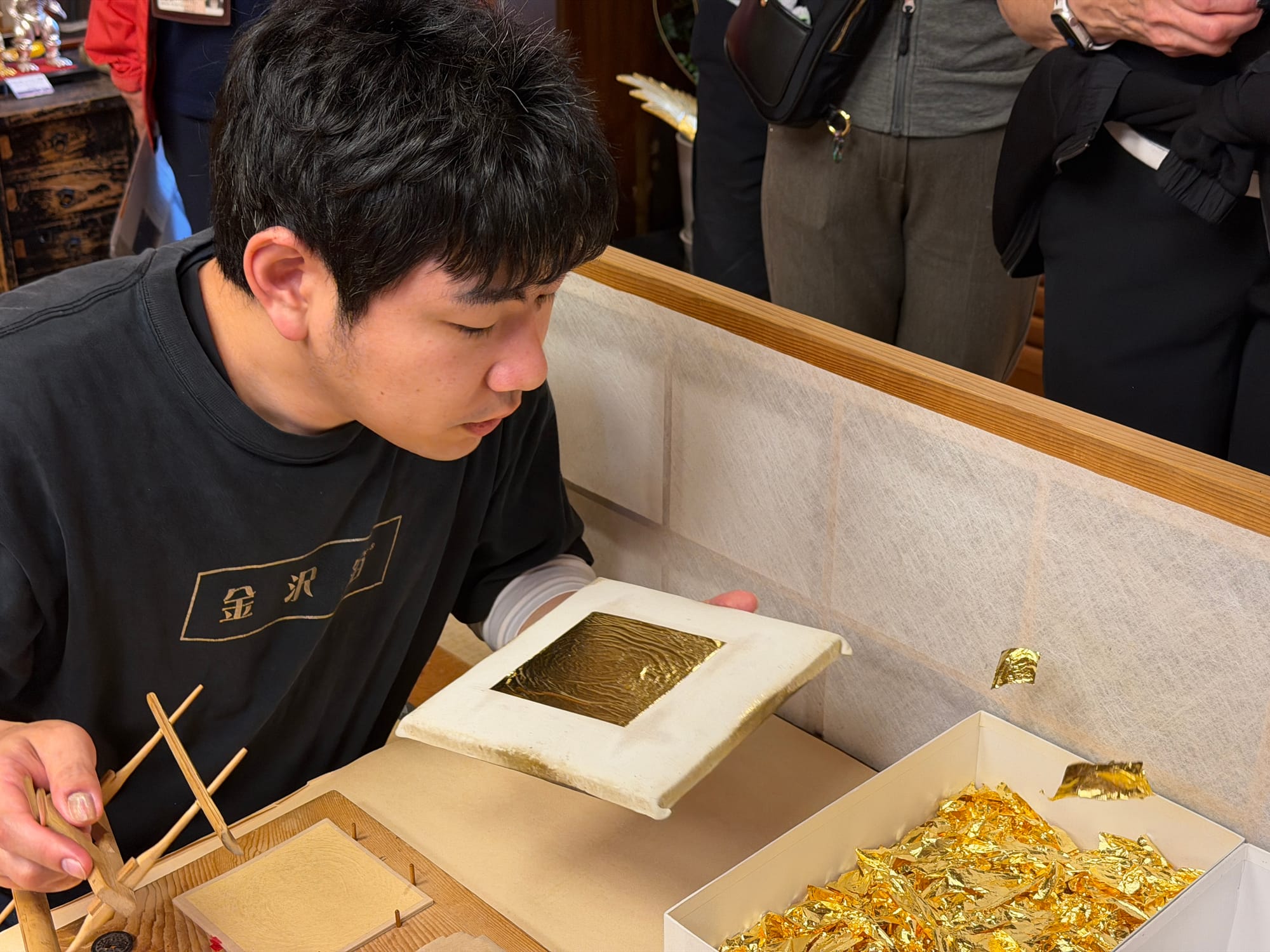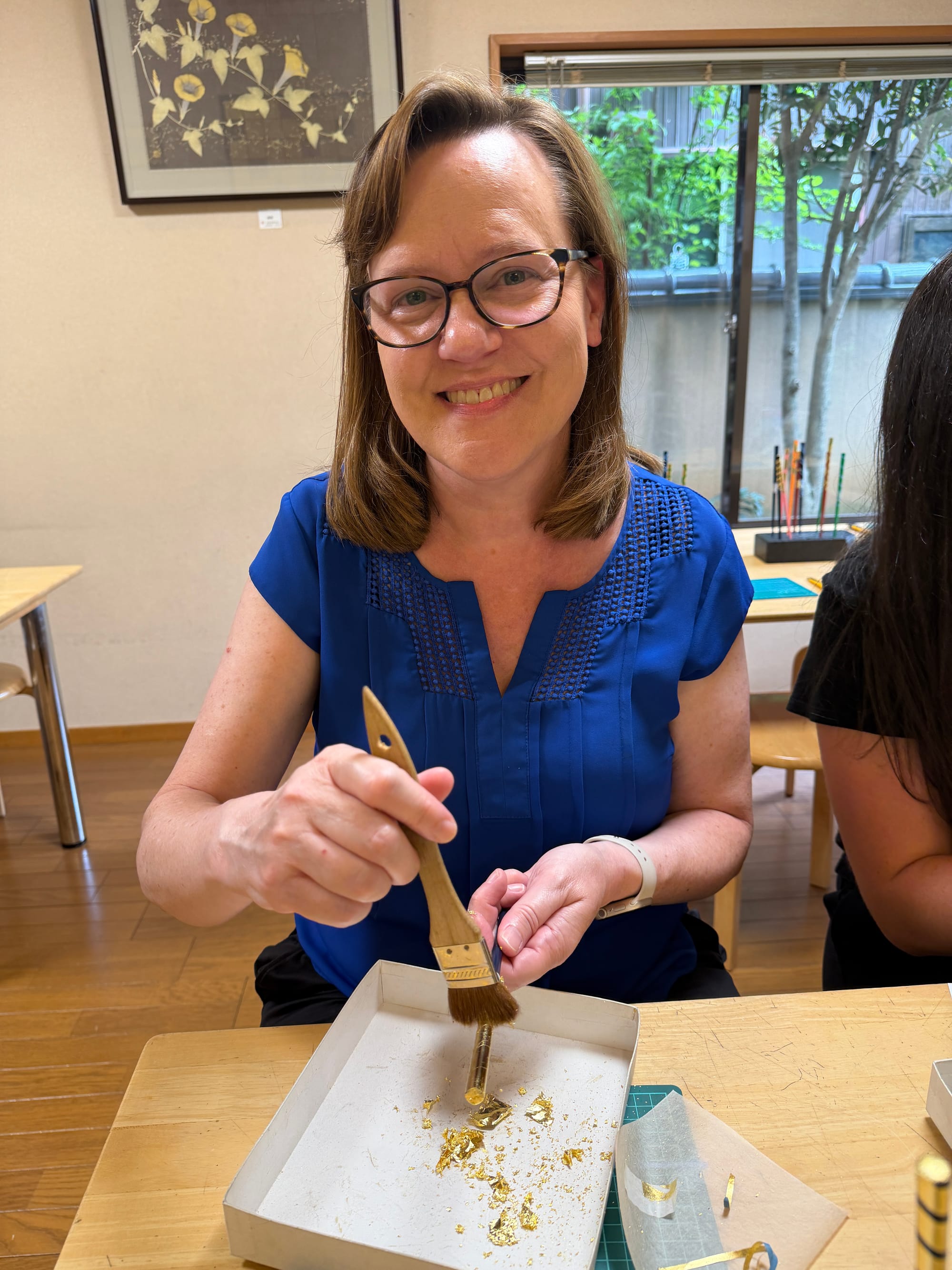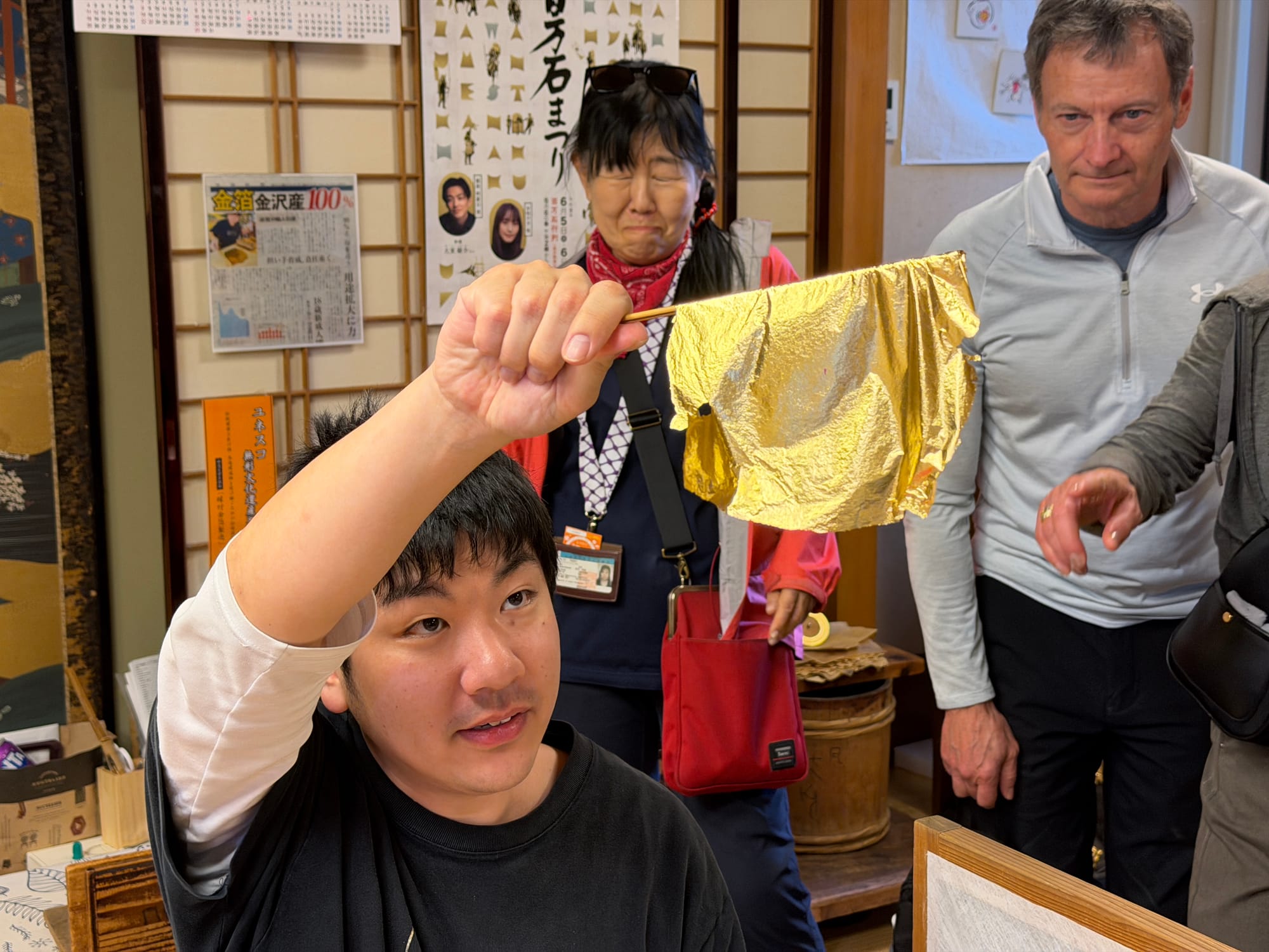 We had a planned gold leaf activity this afternoon. Kanazawa is known for gold leaf because it produces 99% of Japan's gold leaf. Gold leaf is used not only for decoration such as at the famous Kinkakuji Temple in Kyoto (we will visit later in our trip), but now also in cooking and sweets. Soft-serve ice cream wrapped in a whole sheet of gold leaf is unique to Kanazawa. We were able to experience working with gold leaf by creating a design on a set of chopsticks and then using gold leaf to decorate our chopsticks with that design. After some walking around and browsing the gold leaf shops, we took the local bus back to the hotel.