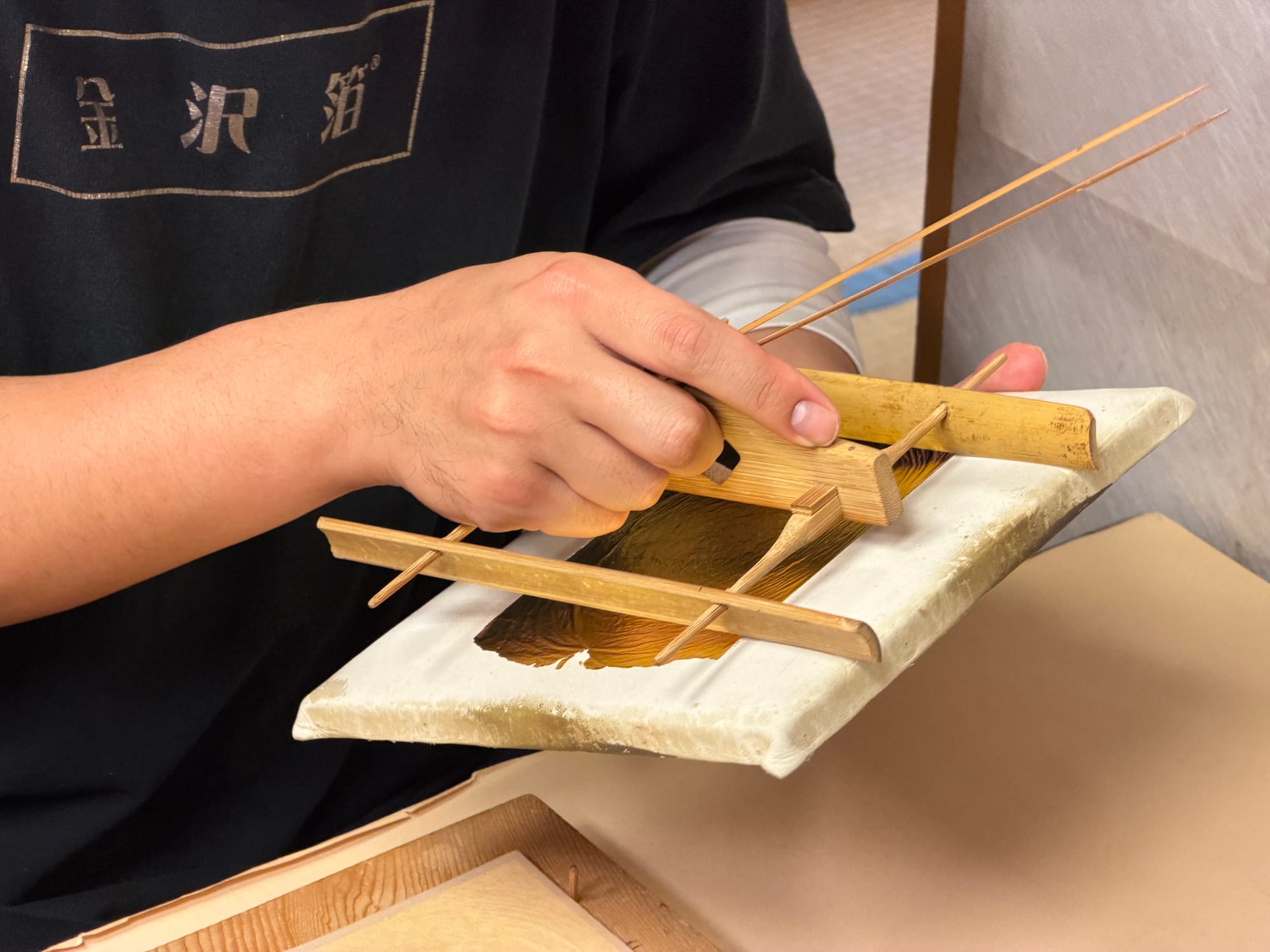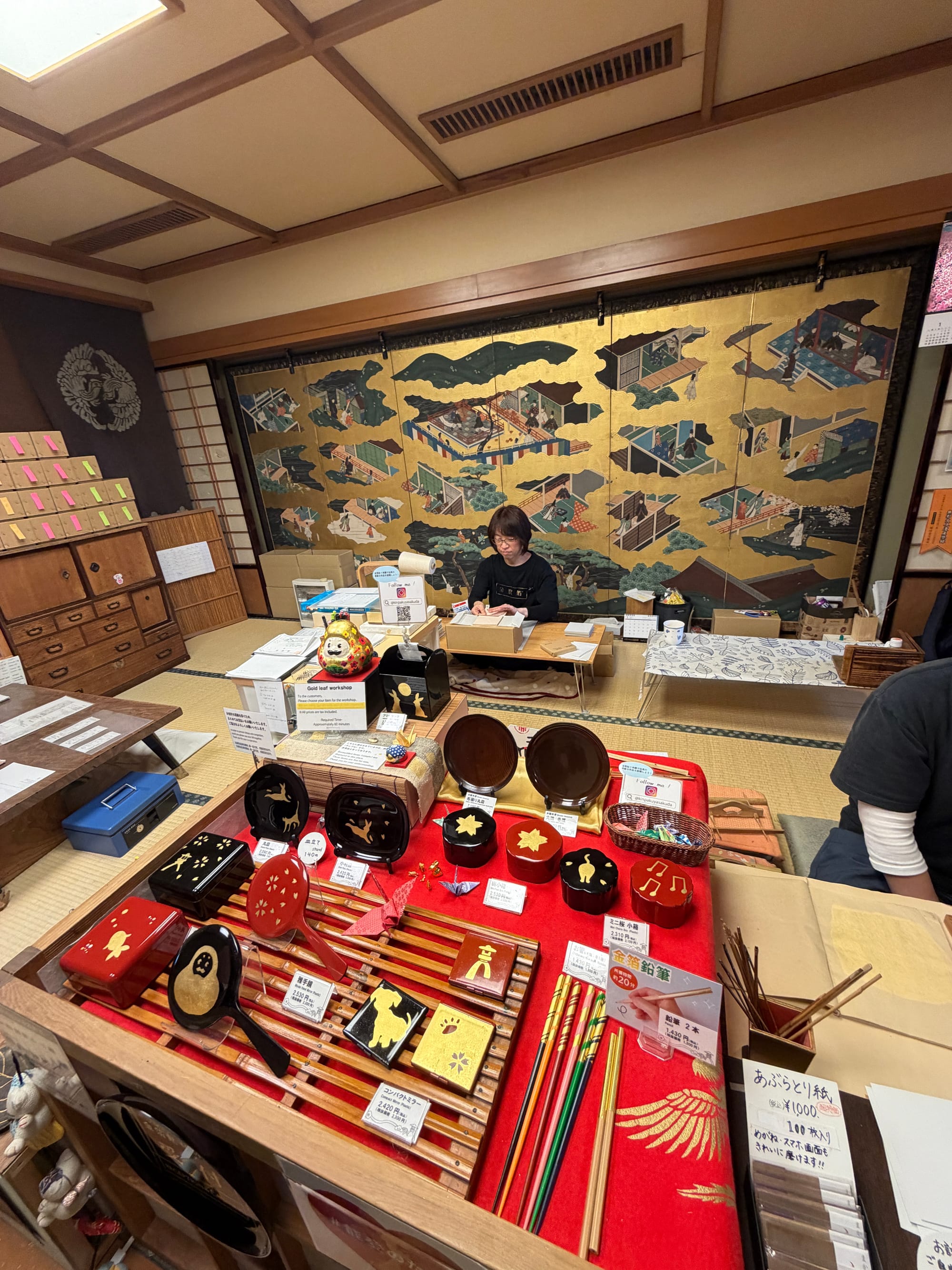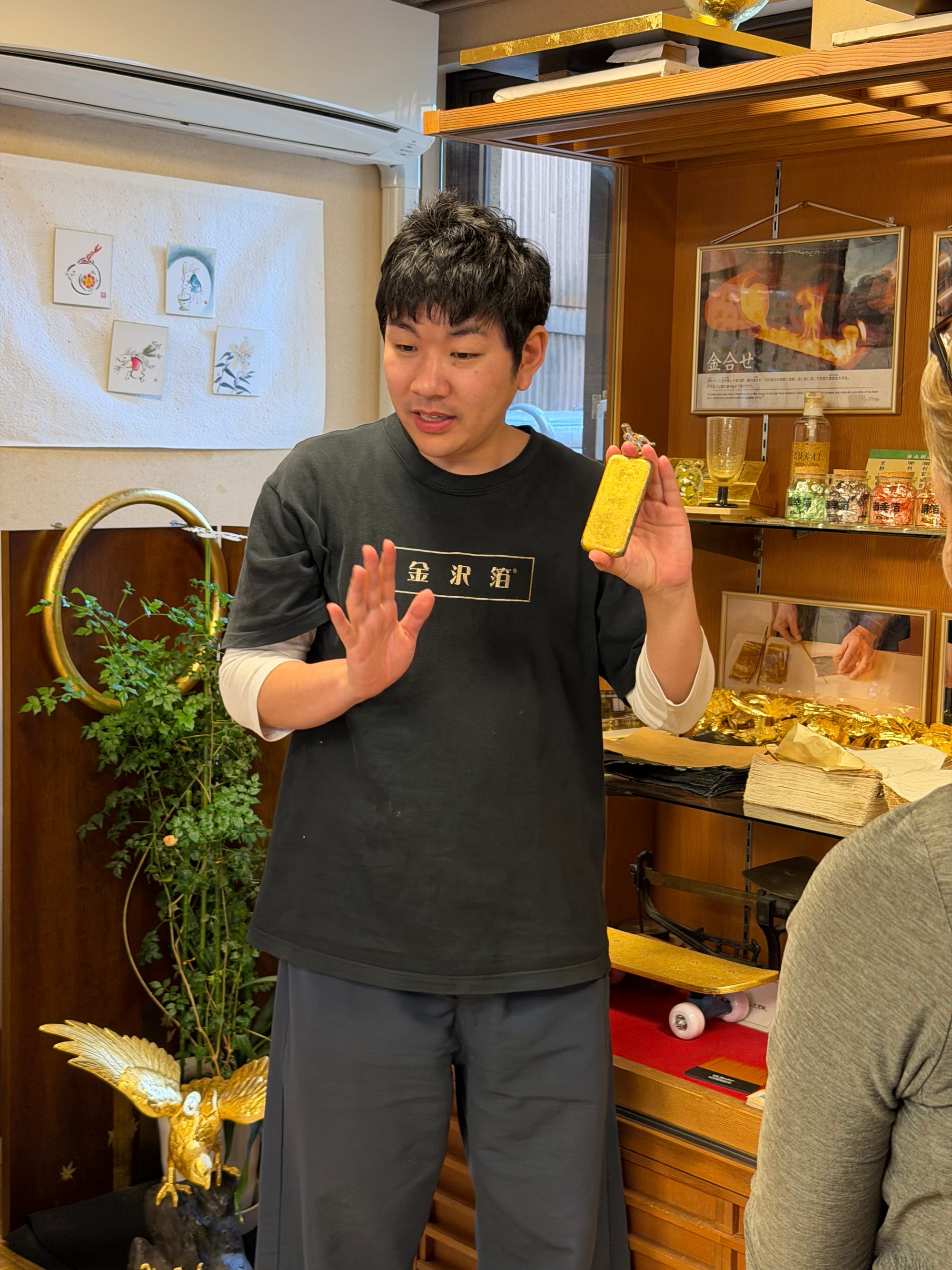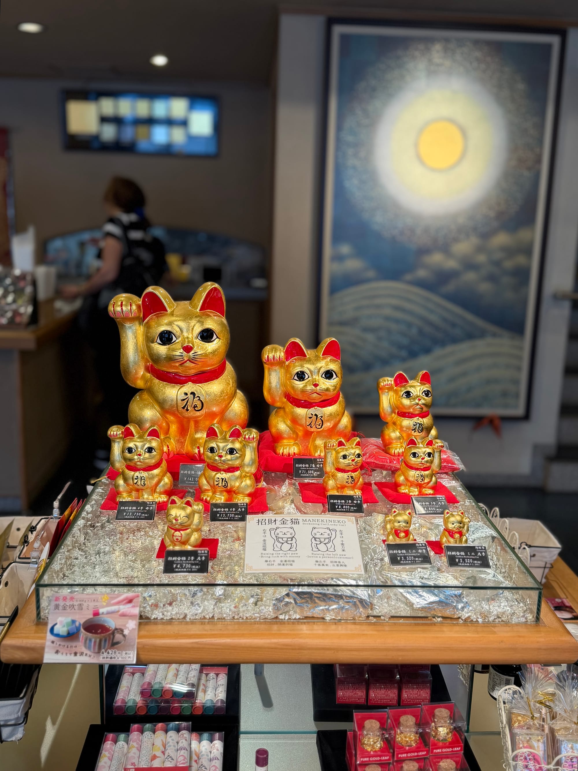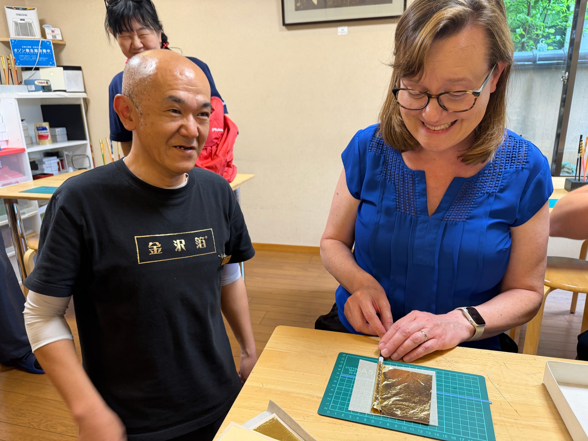 We had a planned gold leaf activity this afternoon. Kanazawa is known for gold leaf because it produces 99% of Japan's gold leaf. Gold leaf is used not only for decoration such as at the famous Kinkakuji Temple in Kyoto (we will visit later in our trip), but now also in cooking and sweets. Soft-serve ice cream wrapped in a whole sheet of gold leaf is unique to Kanazawa. We were able to experience working with gold leaf by creating a design on a set of chopsticks and then using gold leaf to decorate our chopsticks with that design. After some walking around and browsing the gold leaf shops, we took the local bus back to the hotel.