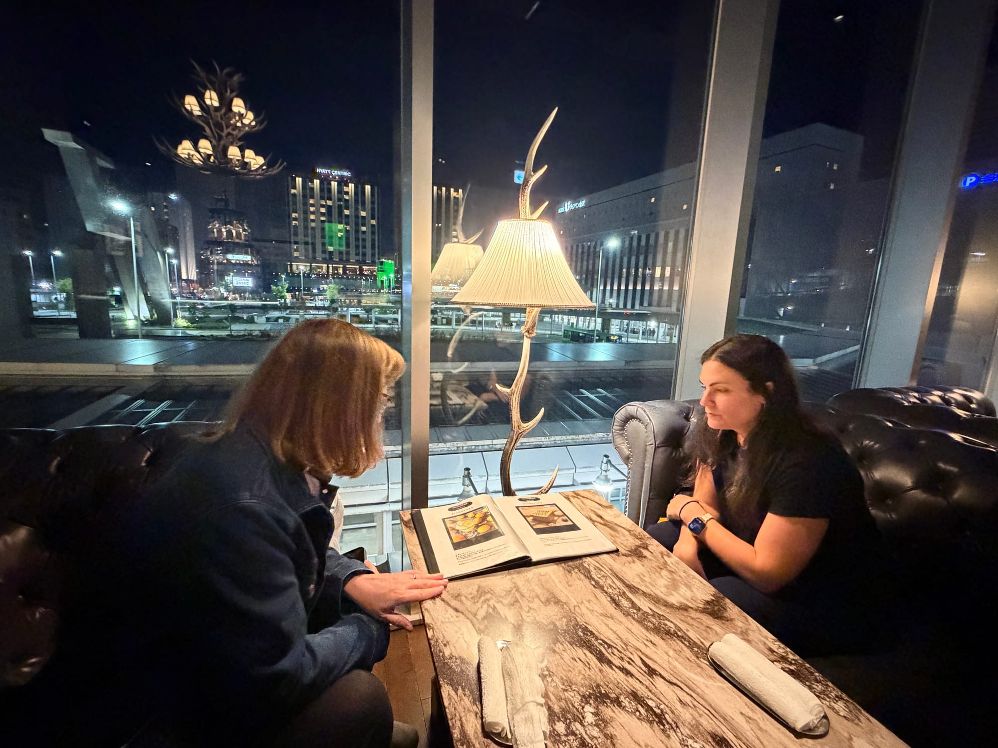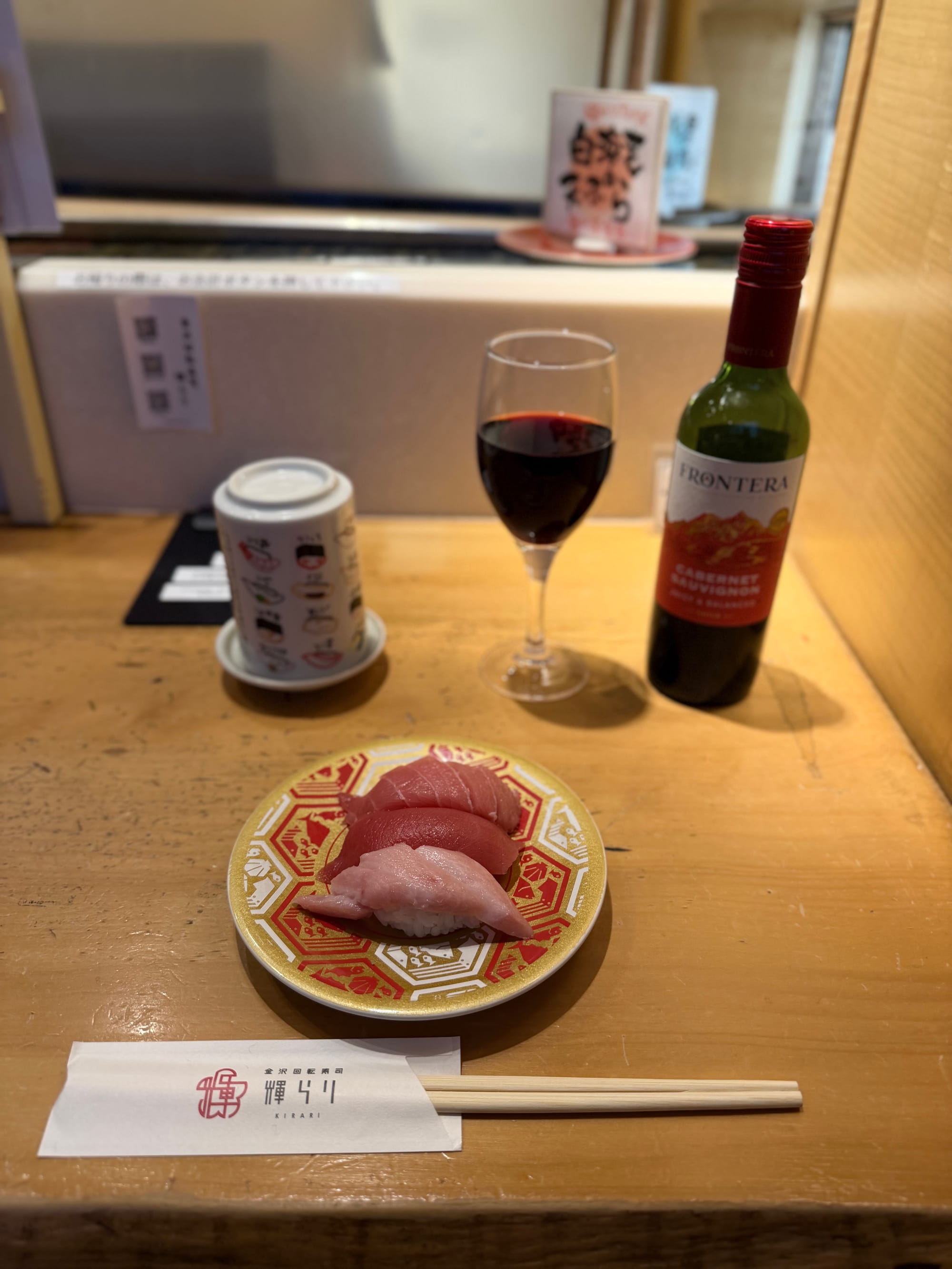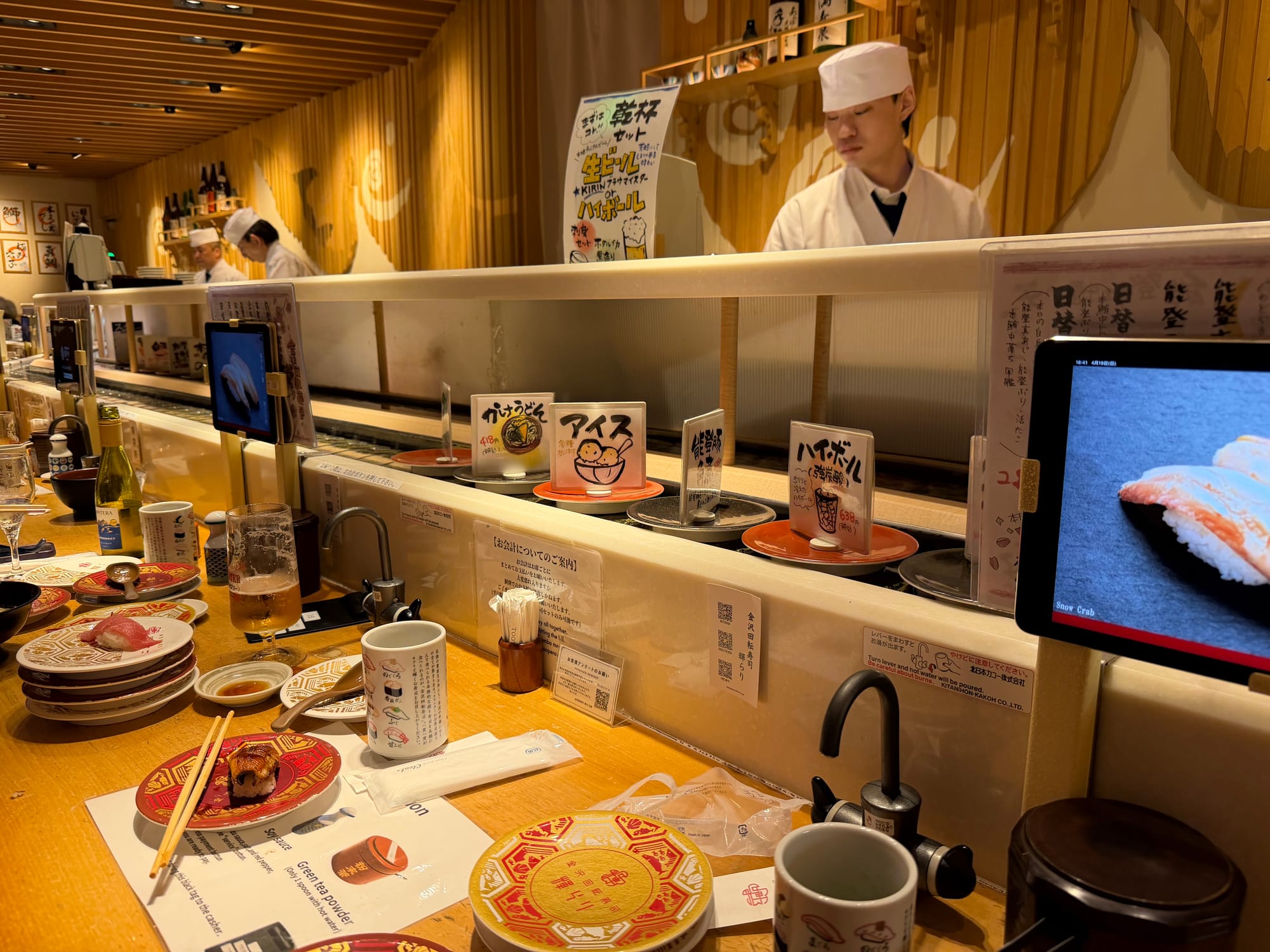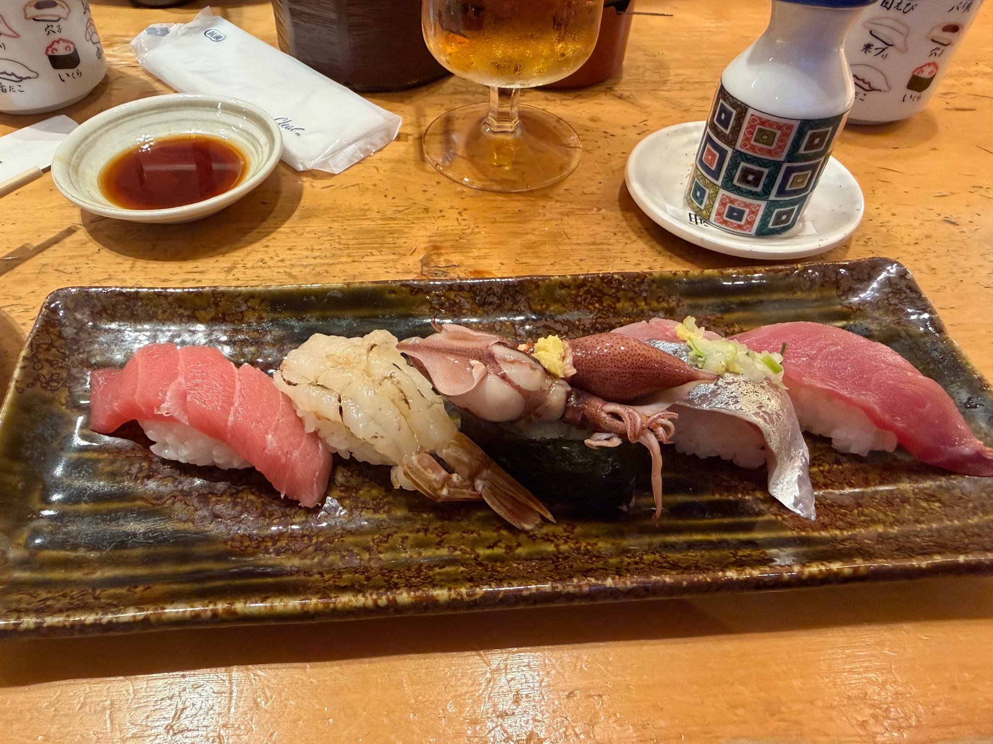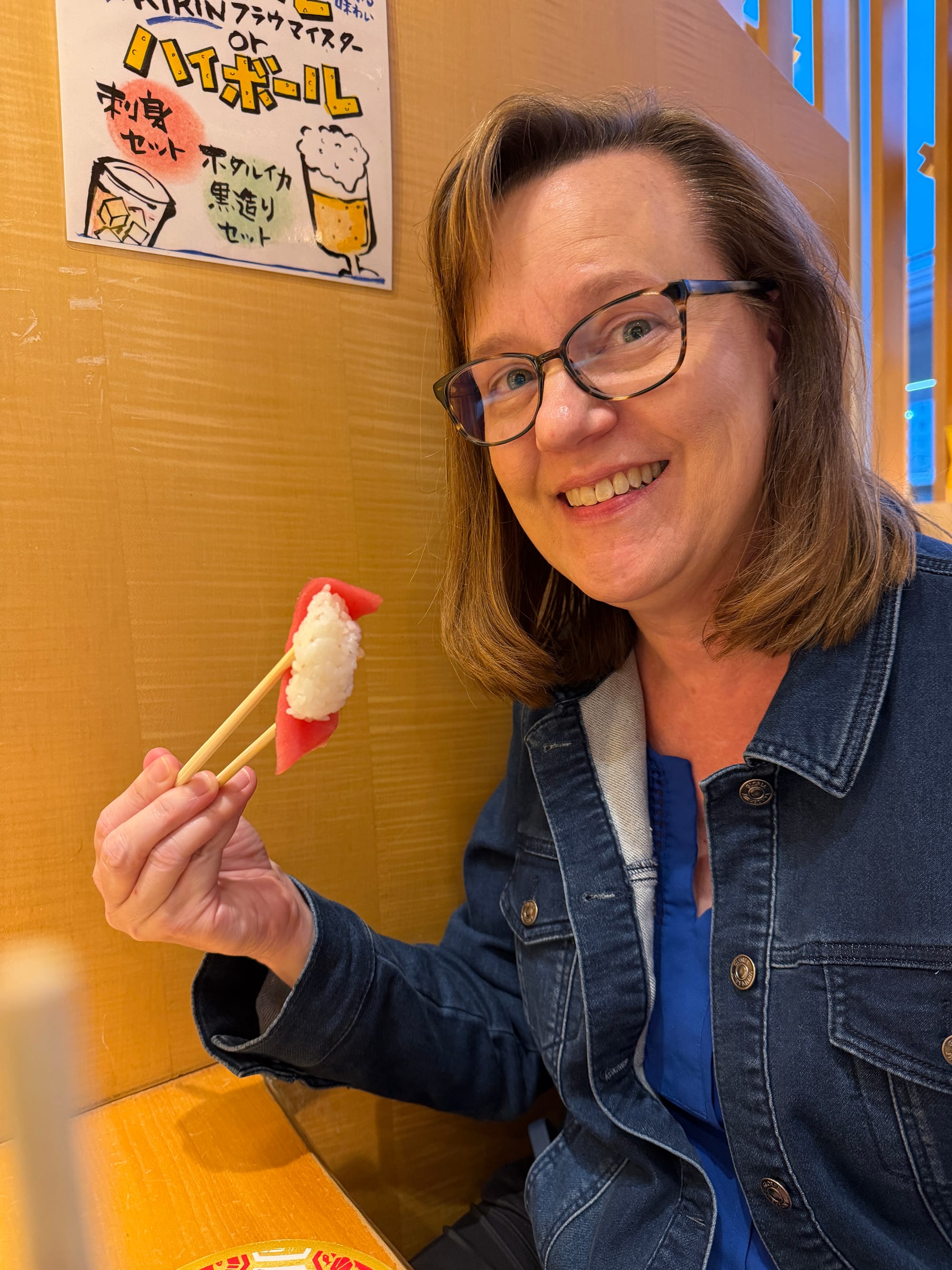 Our dinner was a at a conveyor belt sushi restaurant with some of our fellow travelers. Unfortunately, the conveyor belt was not delivering our selections and the chefs handed them directly to us. Laurie actually tried some sushi based on what she liked during our sushi making class. Of course she had to get her daily ration of noodles in addition to her sushi. We finished the night with a drink at a bar that overlooked the train station.