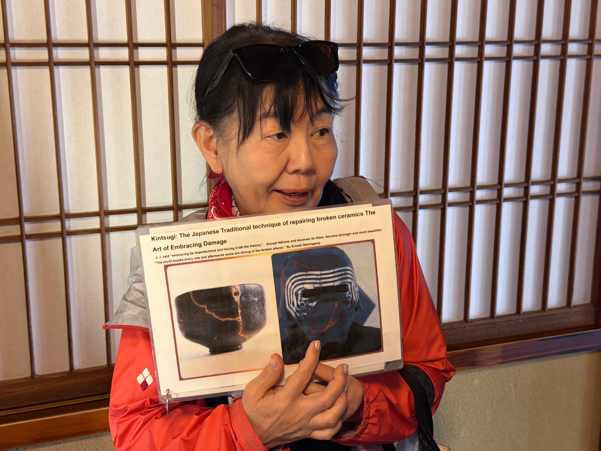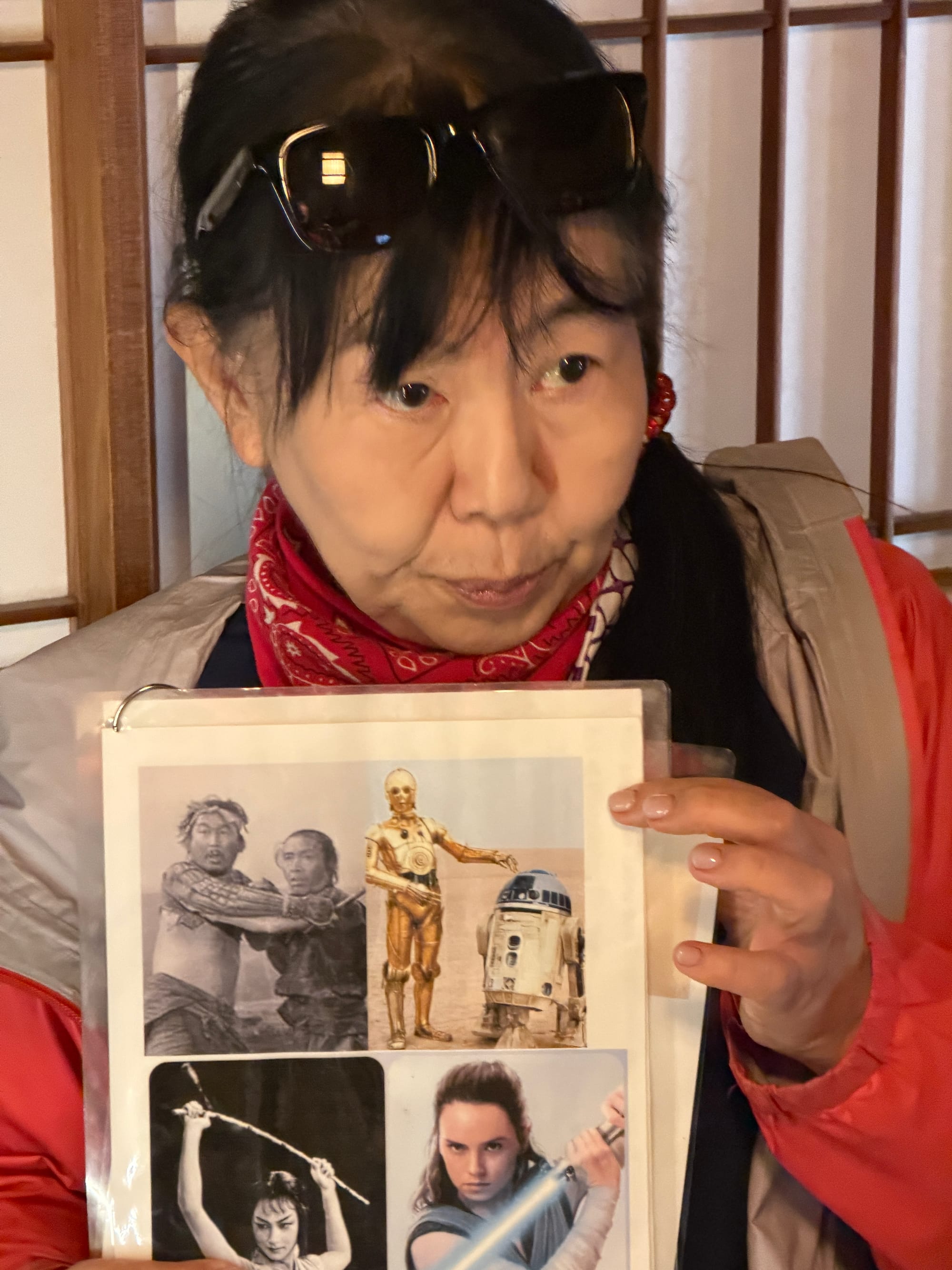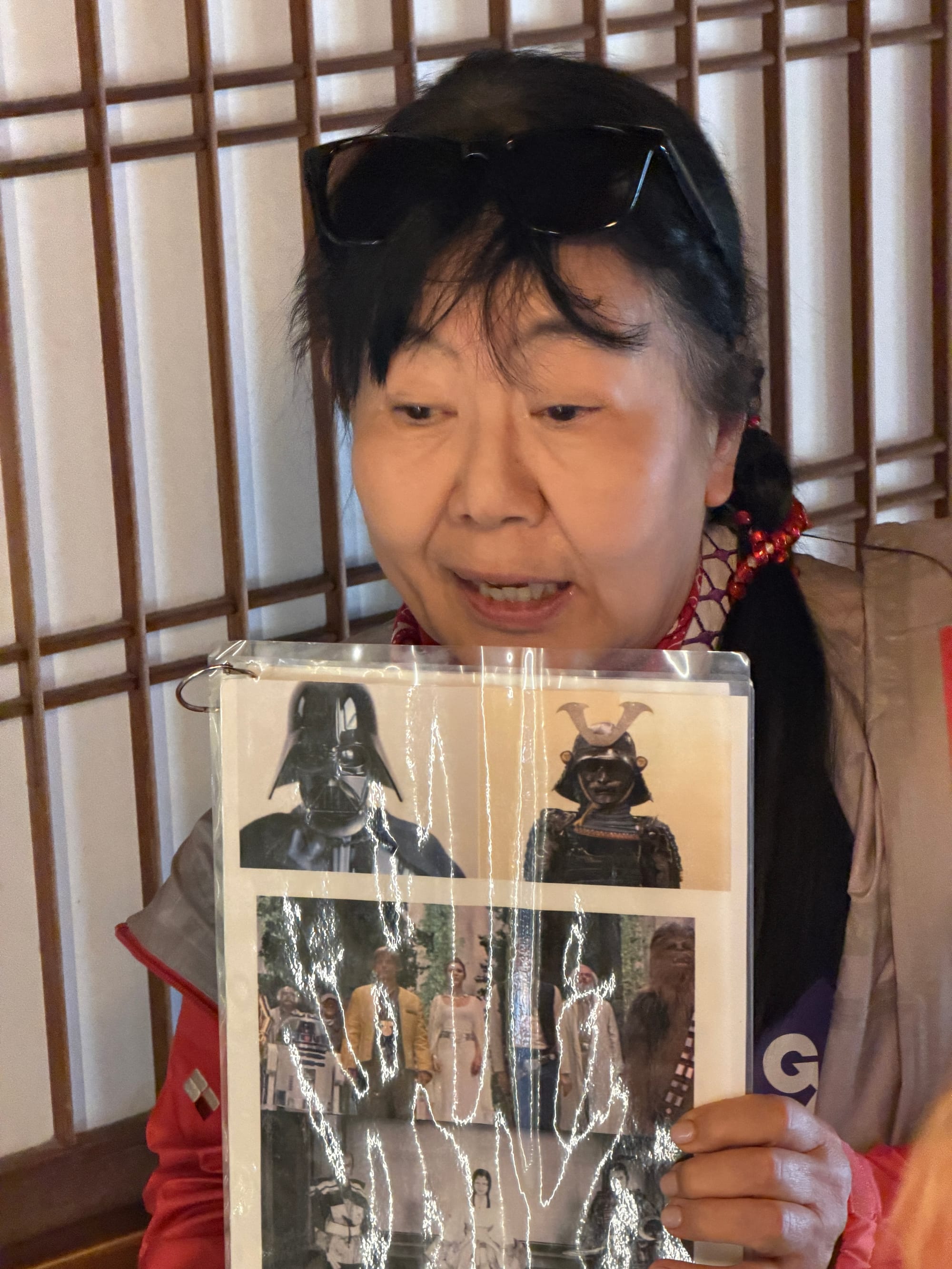 After the temple we walked to the Nomura Samurai House. It is an historic home and garden in Nagamachi, a very well preserved district to the west of Kanazawa Castle. Nagamachi was formerly the area where the samurai of Kanazawa lived with their families. Today the area looks pretty much the same as it did in the Edo Era, with canals and cobbled streets that run between tile-topped walls. While viewing some of the Samurai exhibits, our tour guide explained how the movie Star Wars was a remake of the movie The Hidden Fortress, by famous Japanese director Kurosawa. She explained the thesis of a report she worked on while in school on the similarities between the Samurai and Jedi codes.