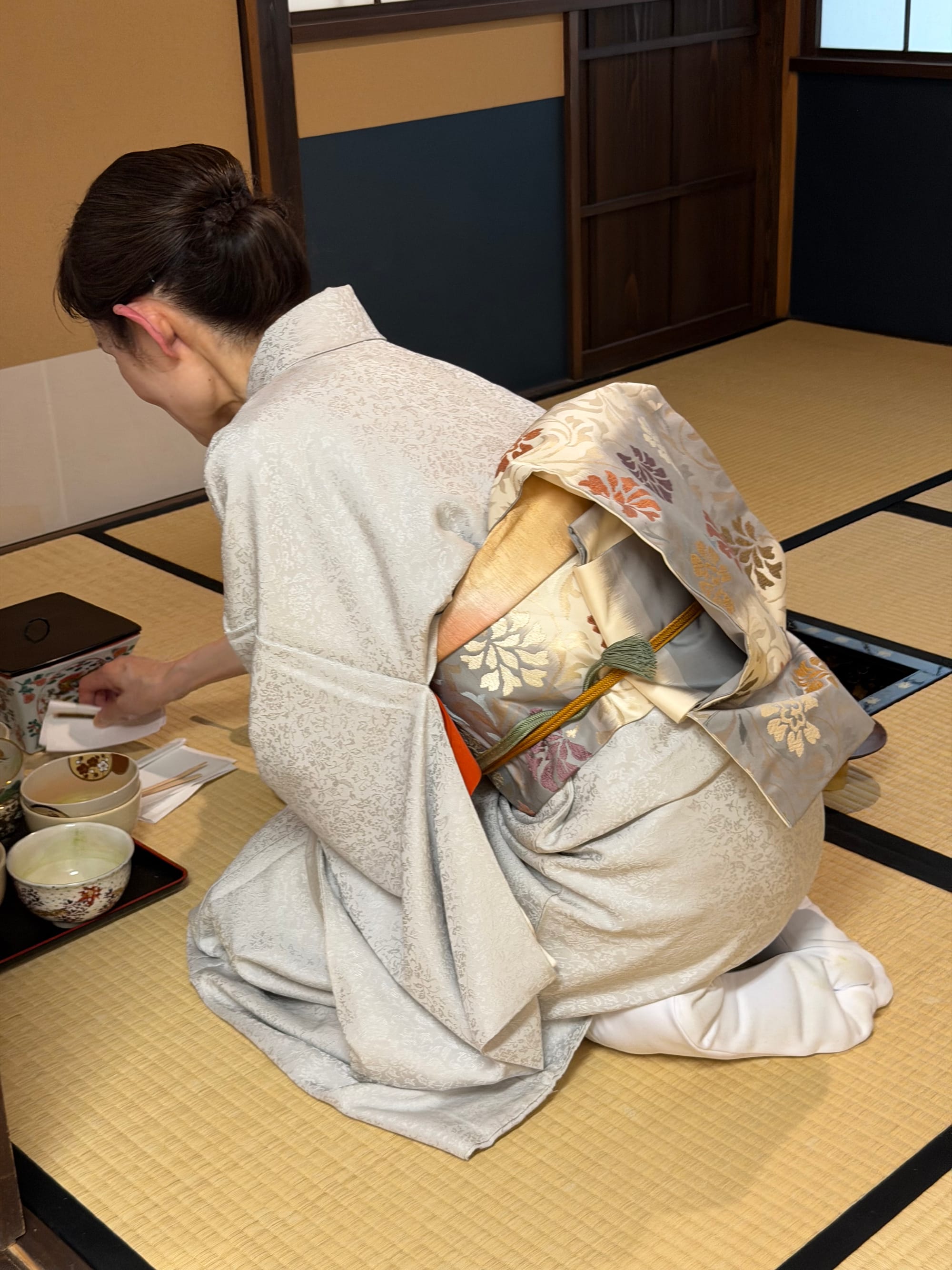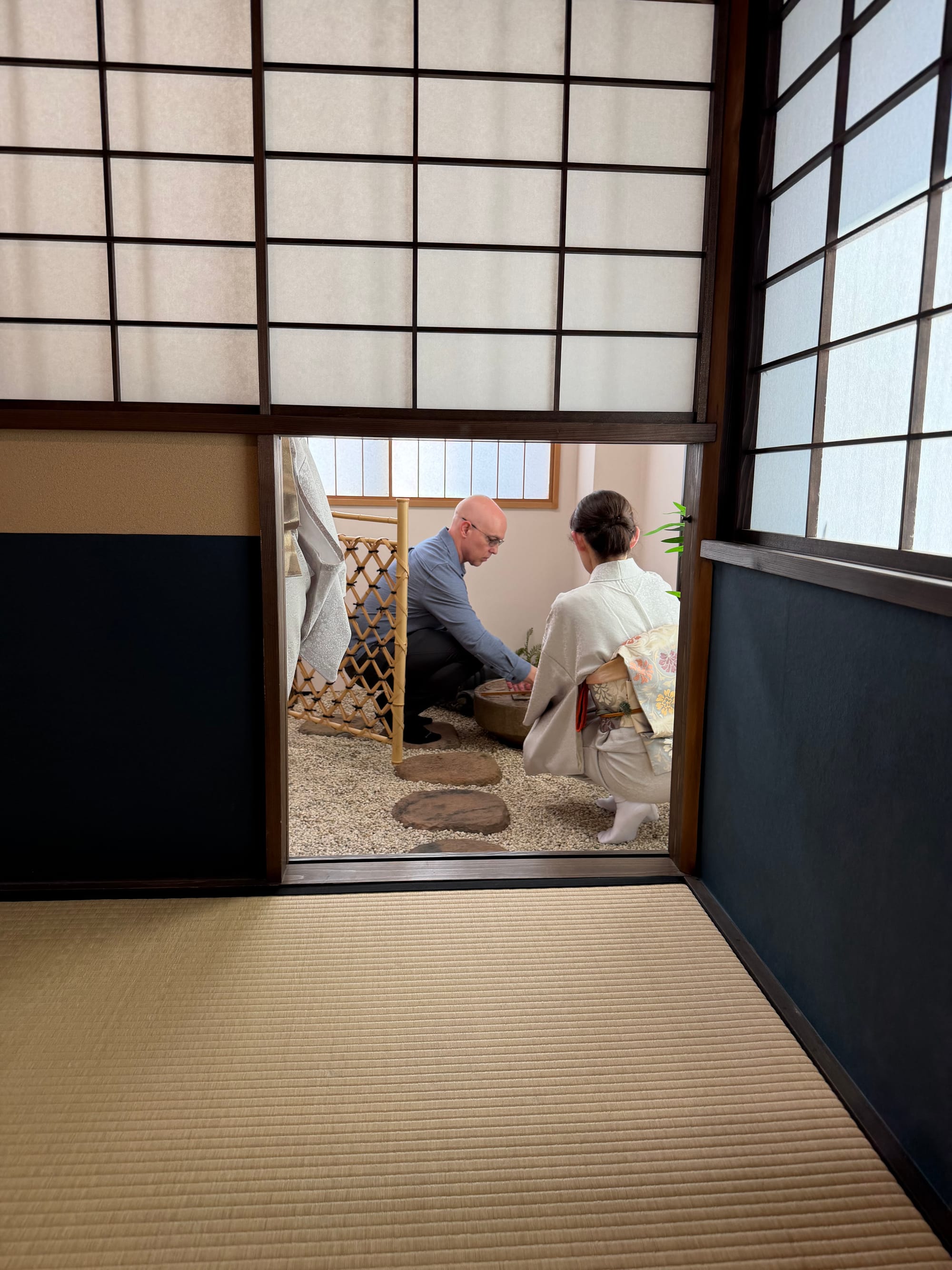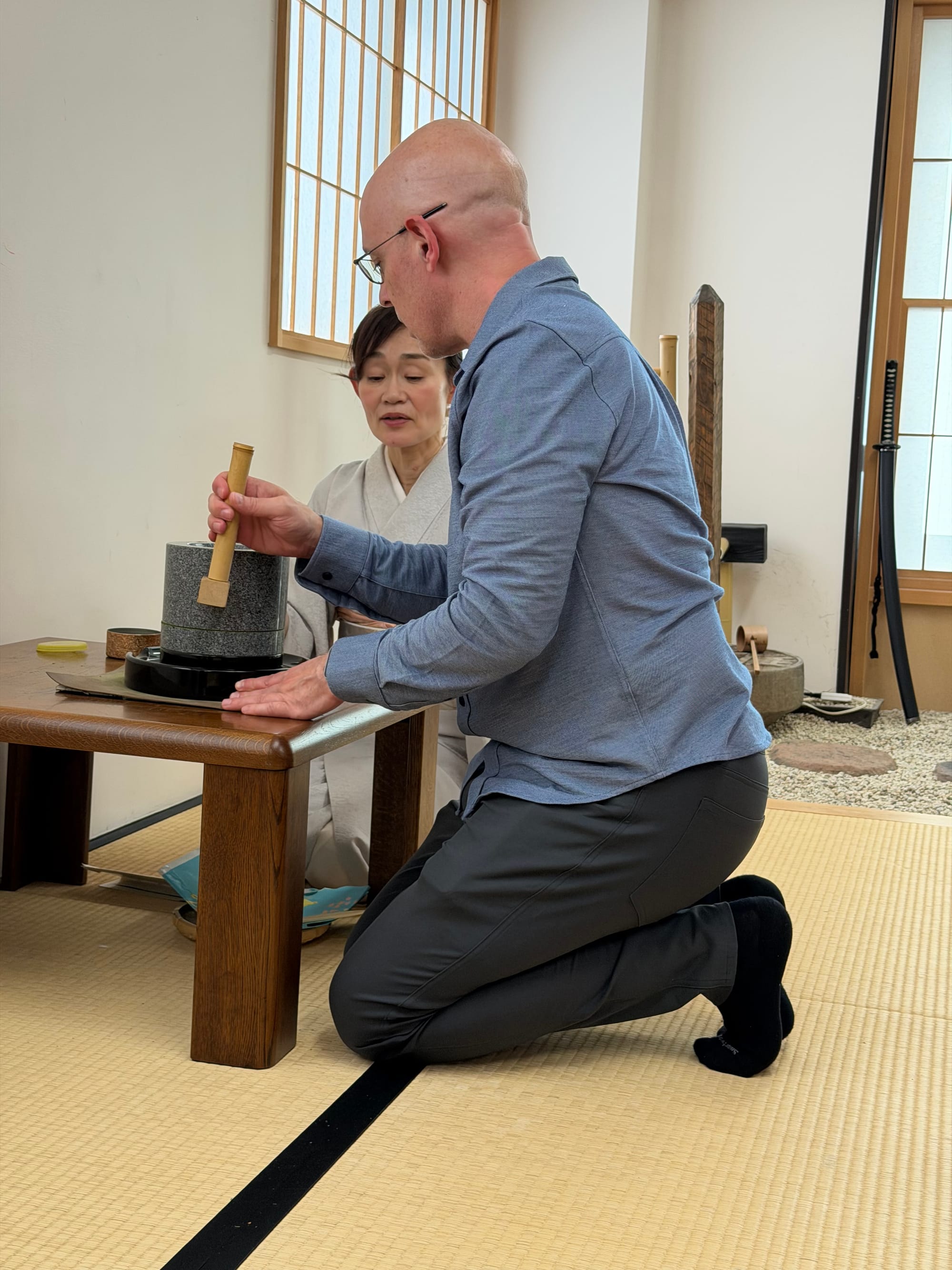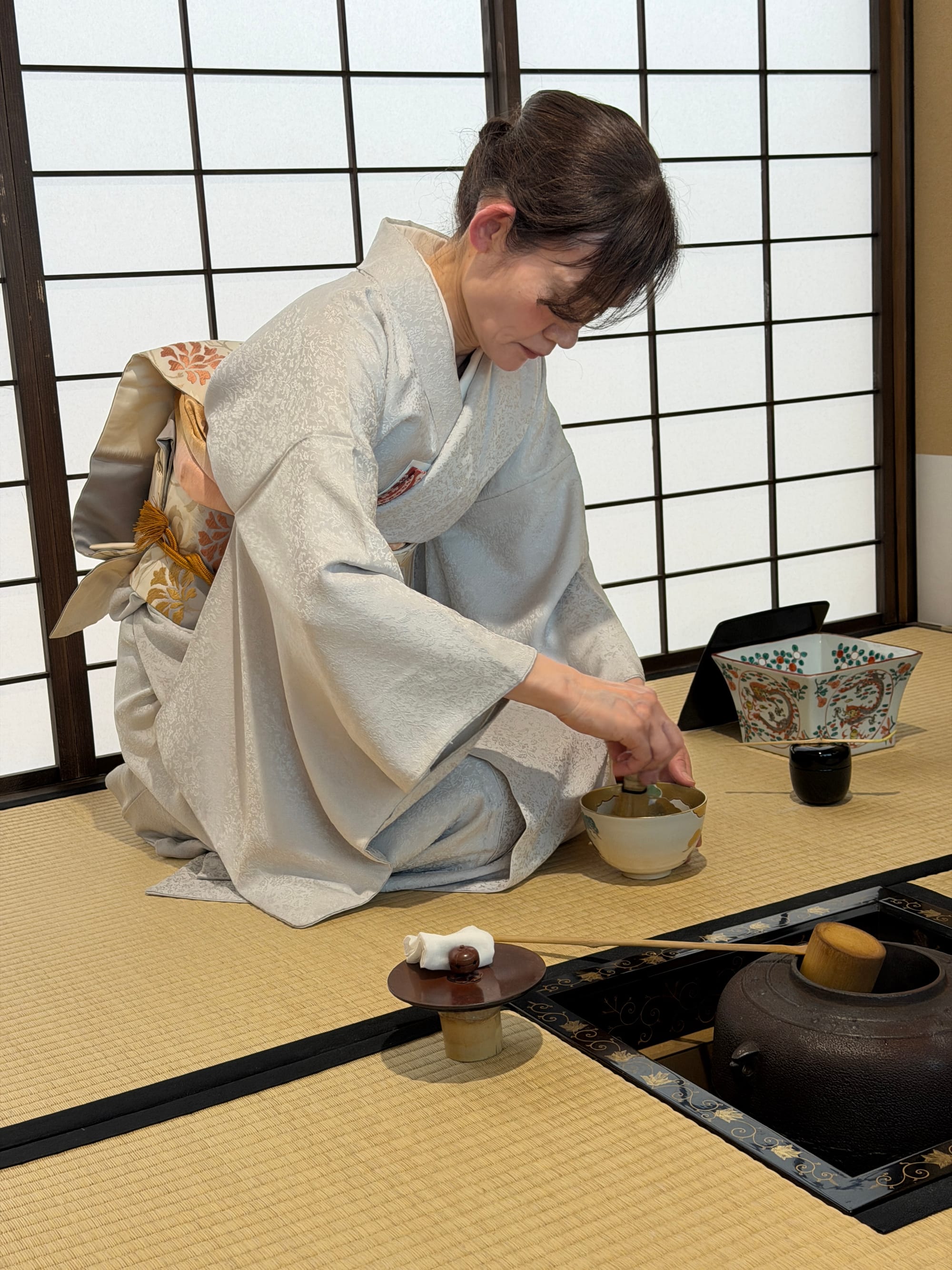 Each of us in the group booked a private tea ceremony experience. We were taught the history of the tea ceremony, how matcha tea is grown and made, as well as a quick try at grinding some matcha ourselves. After the introduction, we were taken into the small tea room for the ceremony itself. The entrance door to the tea room is about 60 cm x 65 cm (23.6 in x 26.5 in). The door is small to imply that everyone is equal and to prove that the samurais who enter the room do not have weapons. Everyone who enters the room is an equal once in the room, no matter their social status outside of the room.
