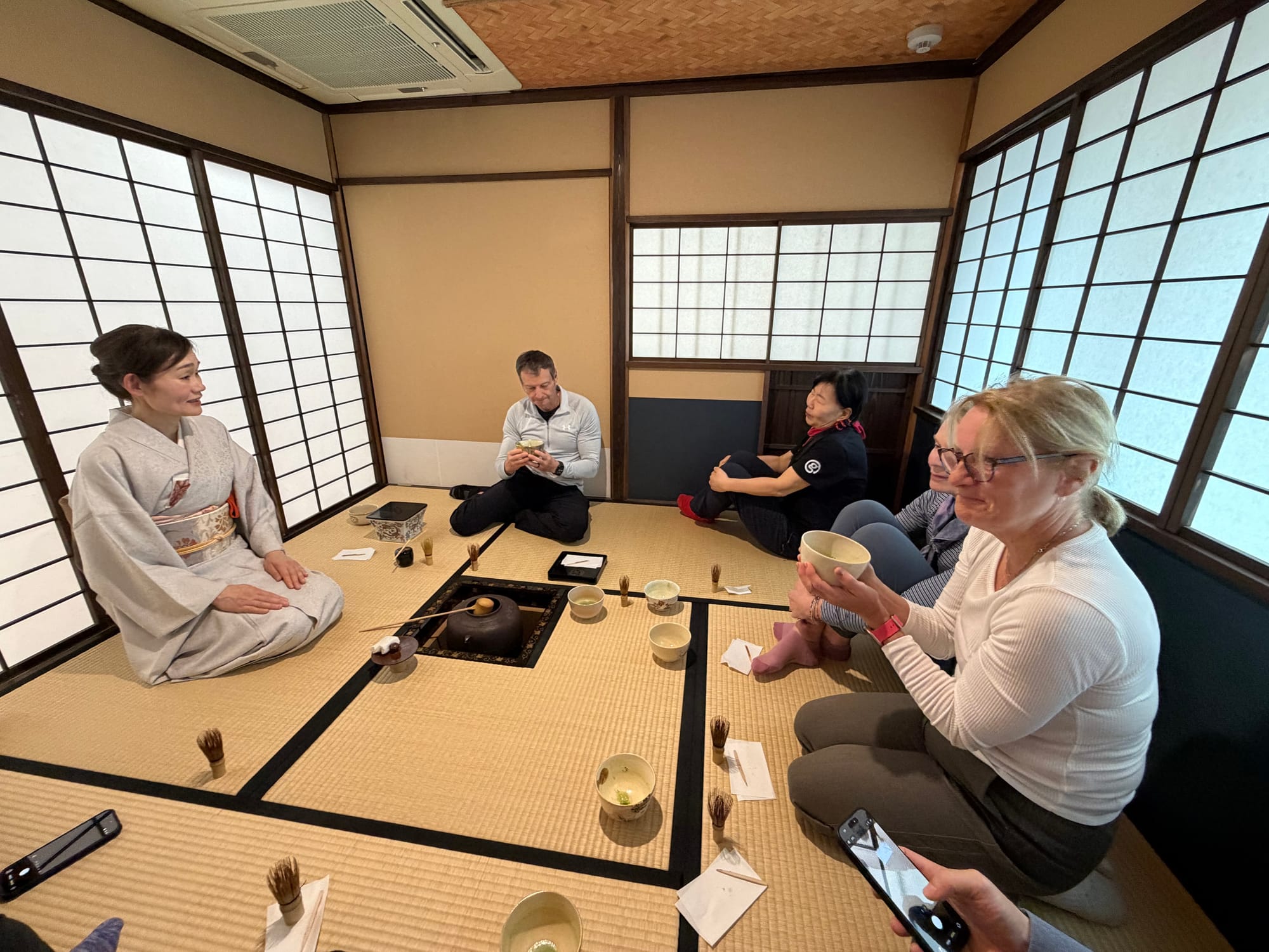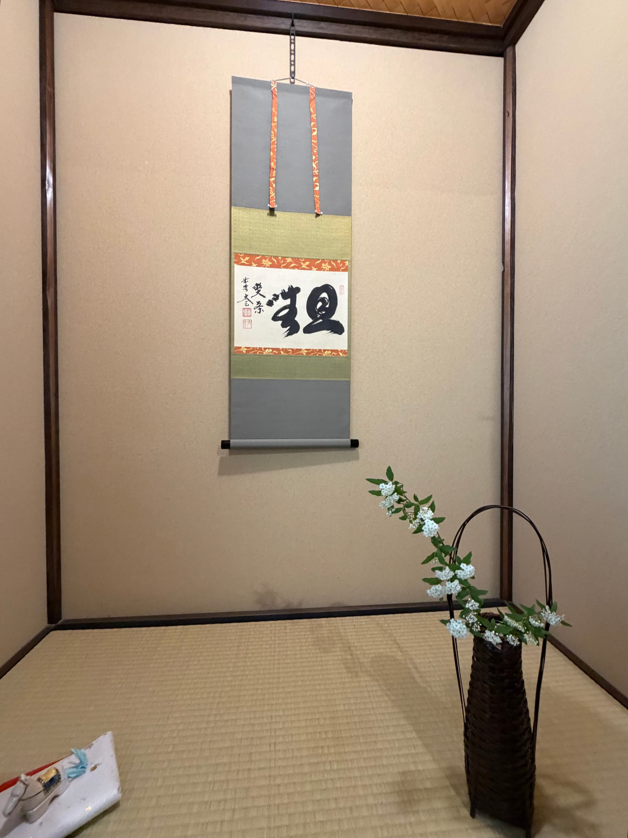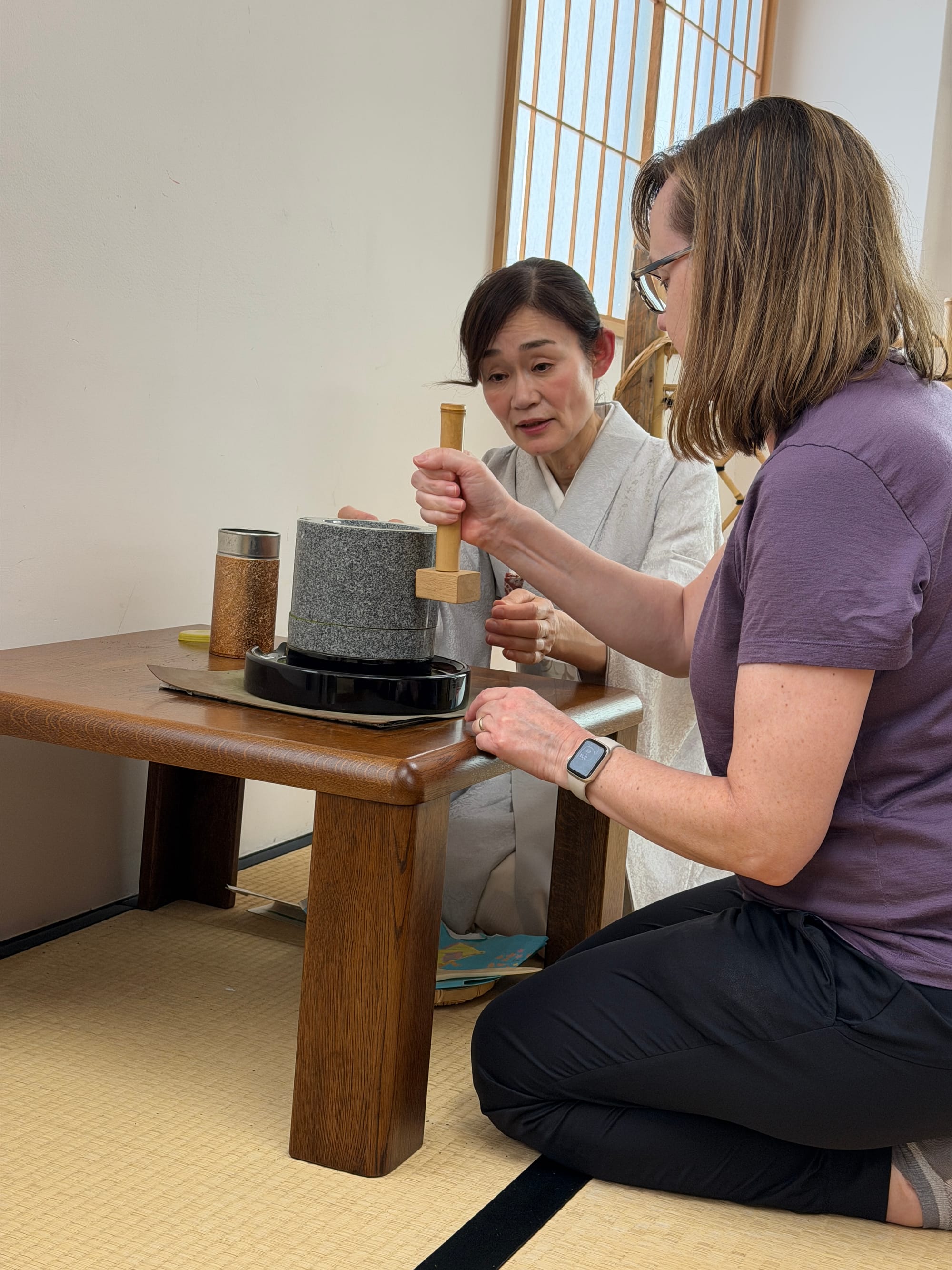 Each of us in the group booked a private tea ceremony experience. We were taught the history of the tea ceremony, how matcha tea is grown and made, as well as a quick try at grinding some matcha ourselves. After the introduction, we were taken into the small tea room for the ceremony itself. The entrance door to the tea room is about 60 cm x 65 cm (23.6 in x 26.5 in). The door is small to imply that everyone is equal and to prove that the samurais who enter the room do not have weapons. Everyone who enters the room is an equal once in the room, no matter their social status outside of the room.