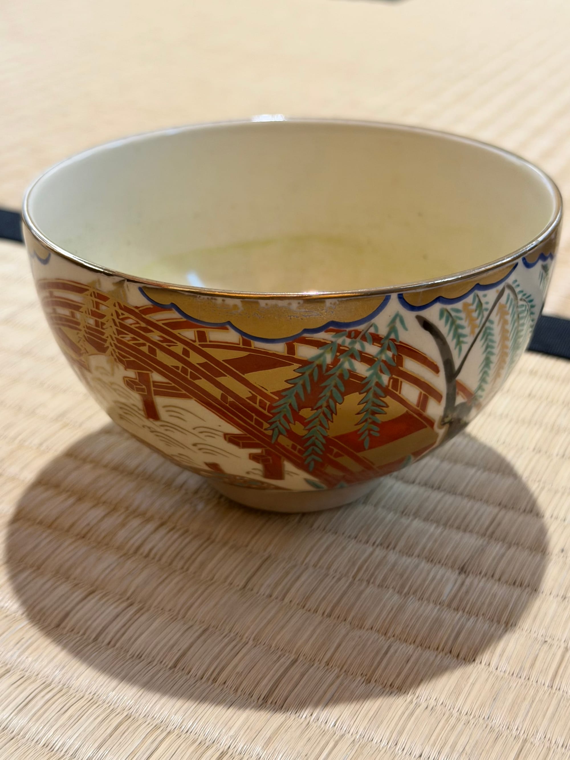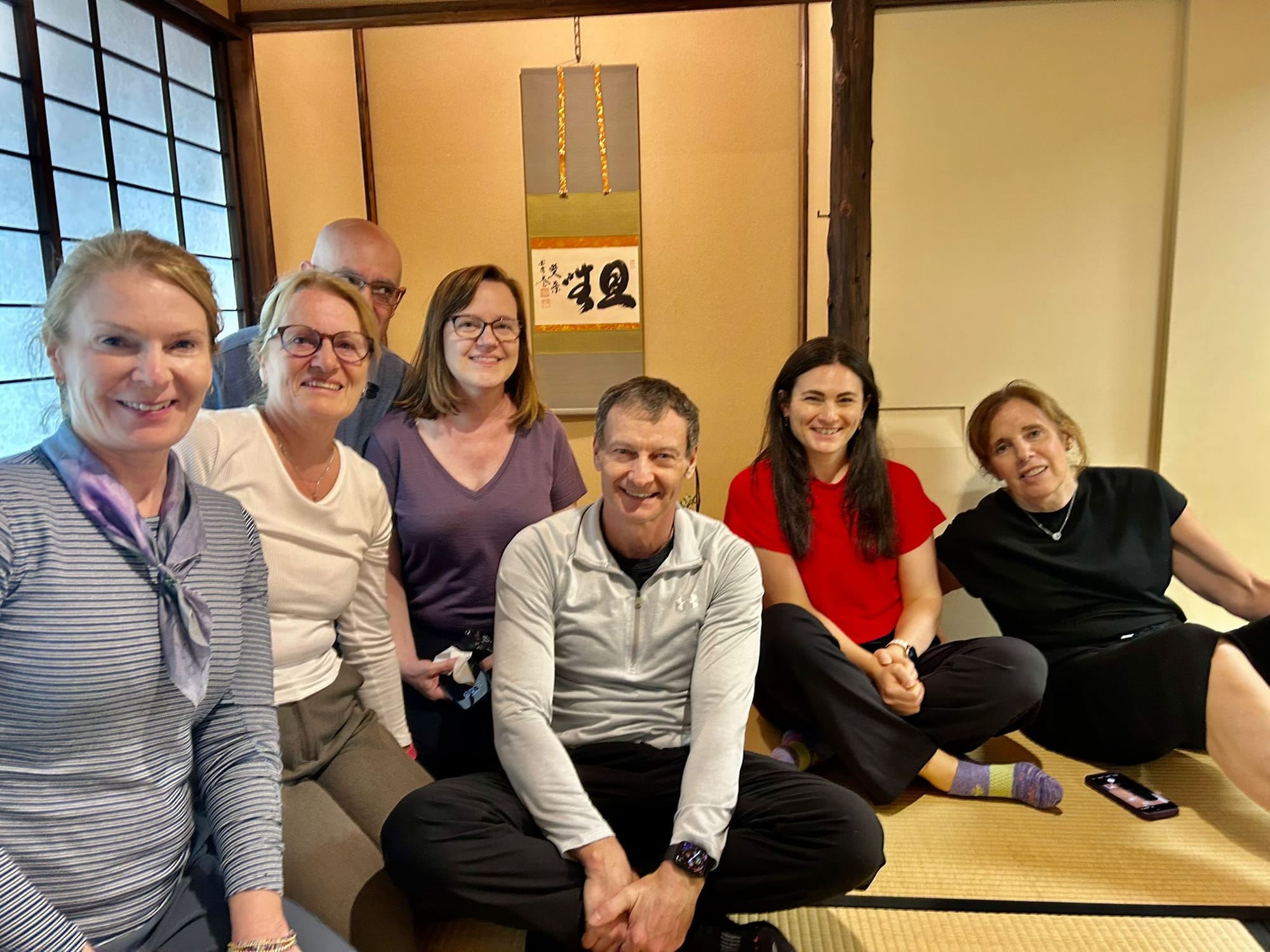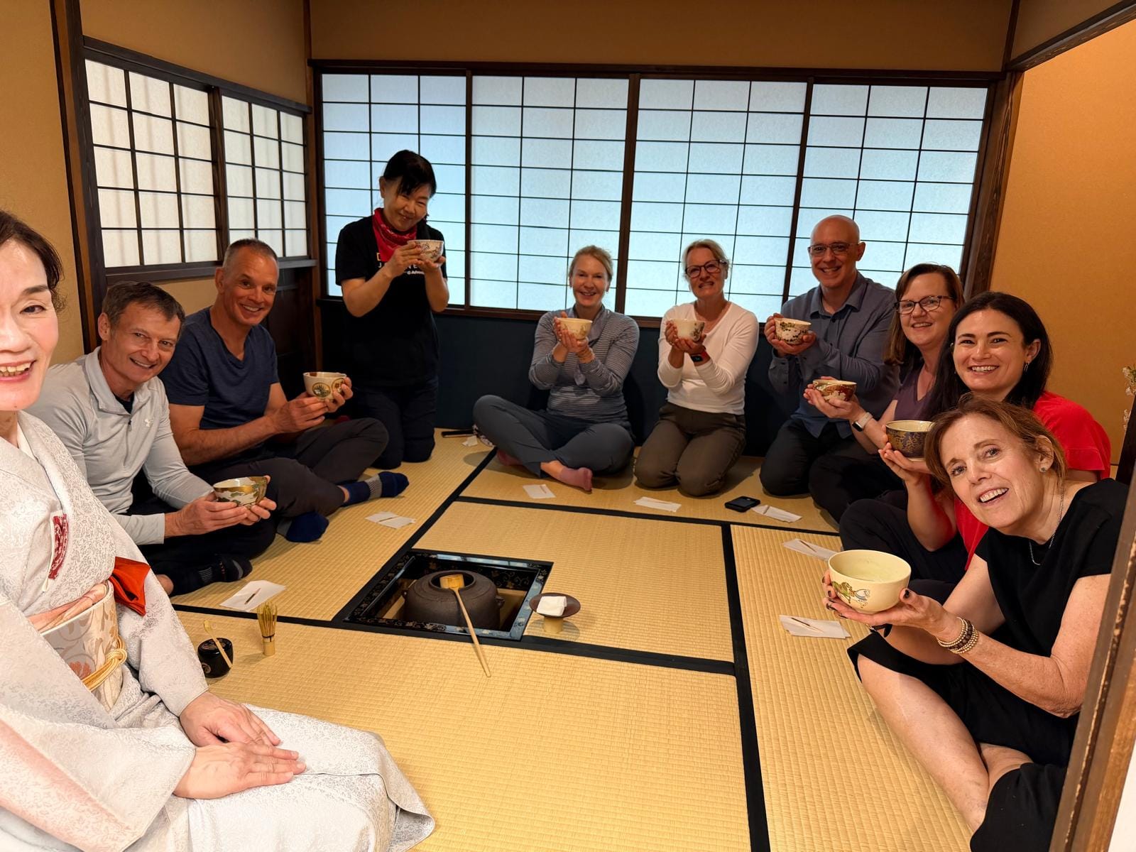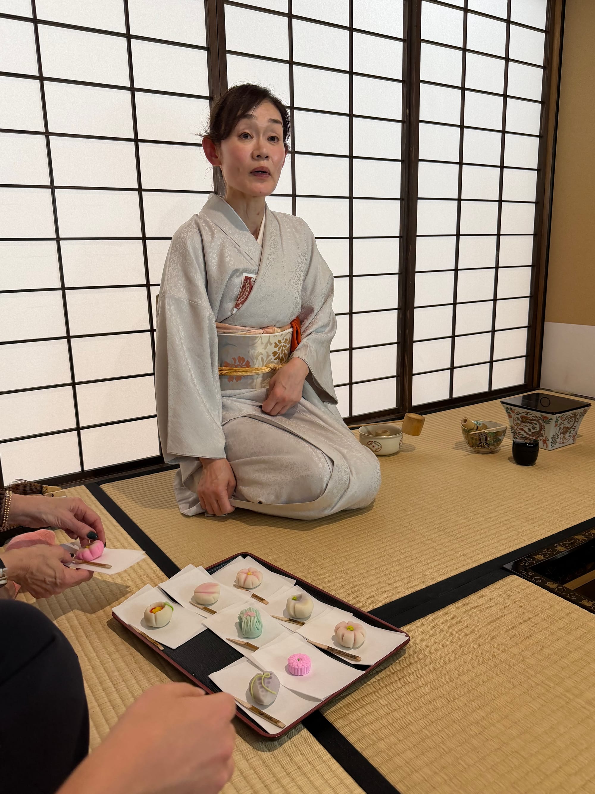 Each of us in the group booked a private tea ceremony experience. We were taught the history of the tea ceremony, how matcha tea is grown and made, as well as a quick try at grinding some matcha ourselves. After the introduction, we were taken into the small tea room for the ceremony itself. The entrance door to the tea room is about 60 cm x 65 cm (23.6 in x 26.5 in). The door is small to imply that everyone is equal and to prove that the samurais who enter the room do not have weapons. Everyone who enters the room is an equal once in the room, no matter their social status outside of the room.