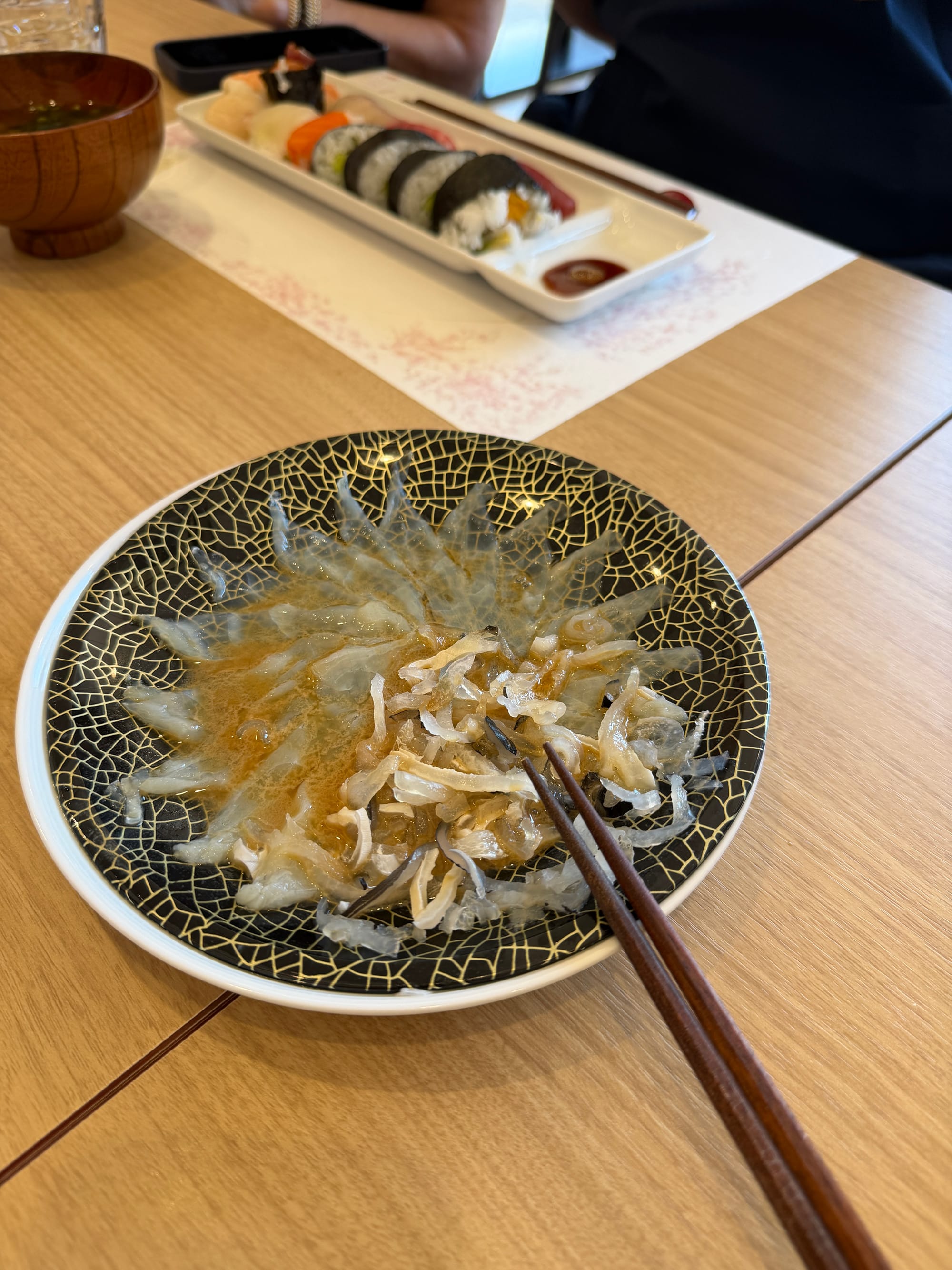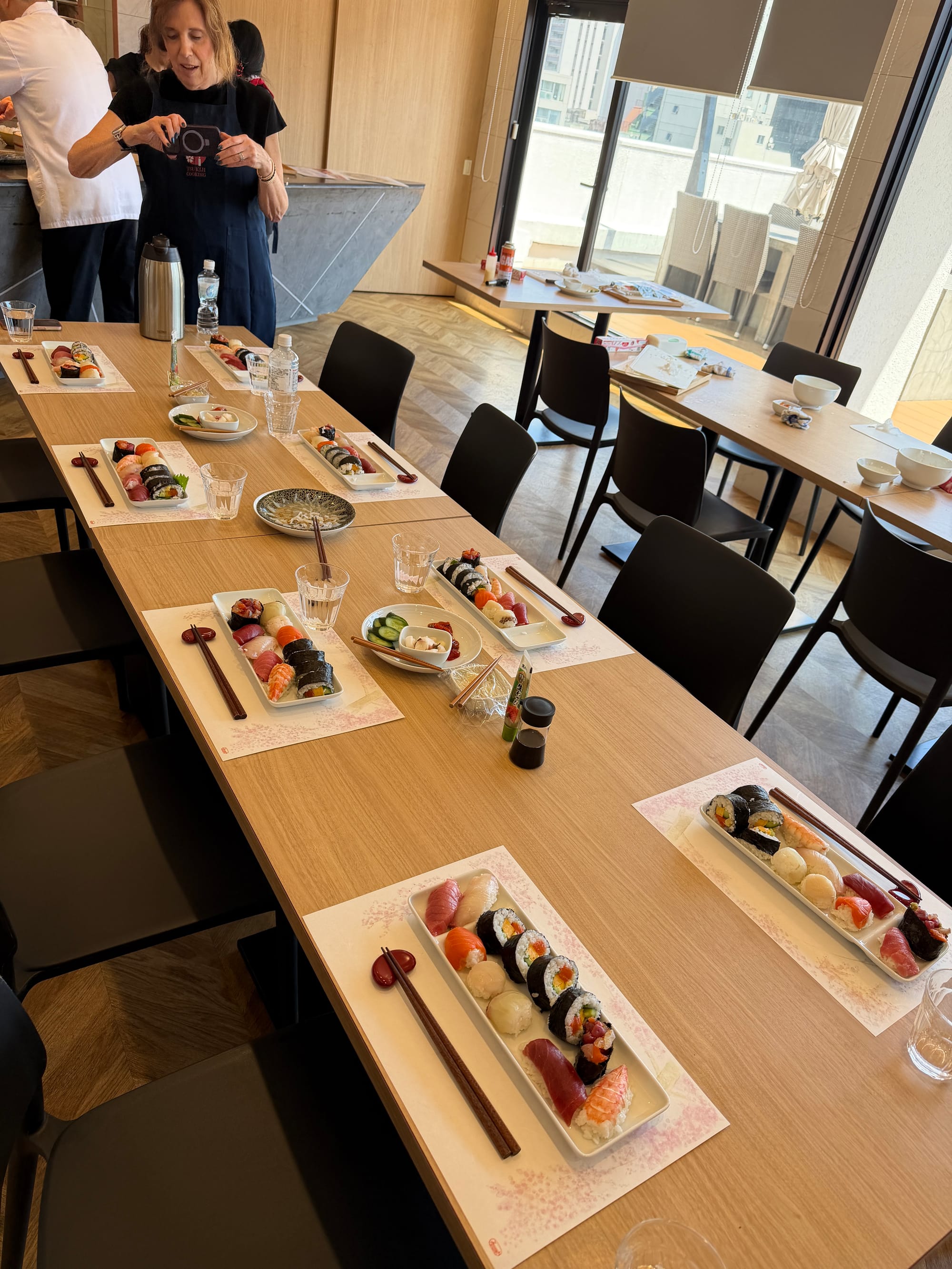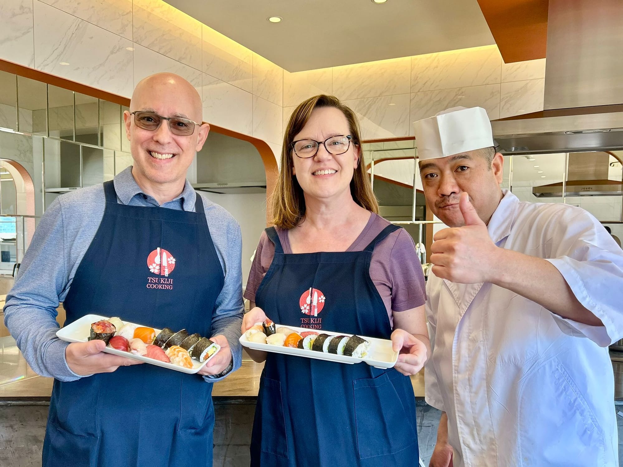 This morning our planned event was sushi making. We were taken back to the market for a guided walkthrough and purchased the fish and other ingredients we would use in our sushi making class. We were taught by a master sushi chef with 35 years experience and the translator. During the class, we learn about making miso soup, how to prepare the sushi rice, and the proper technique for cutting fish for different sushi preparations. We were given step-by-step instructions while making four different styles of sushi. They also provided us with pickles we selected in the market and some blow fish we found at one of the vendors. We asked how poisonous the blow fish is if the poisonous part was eaten. After some back and forth with the vendor the only thing our guide would say was, “Just don’t!” Though Laurie is not a fan of any type of seafood, she did a great job eating some of the sushi she made.