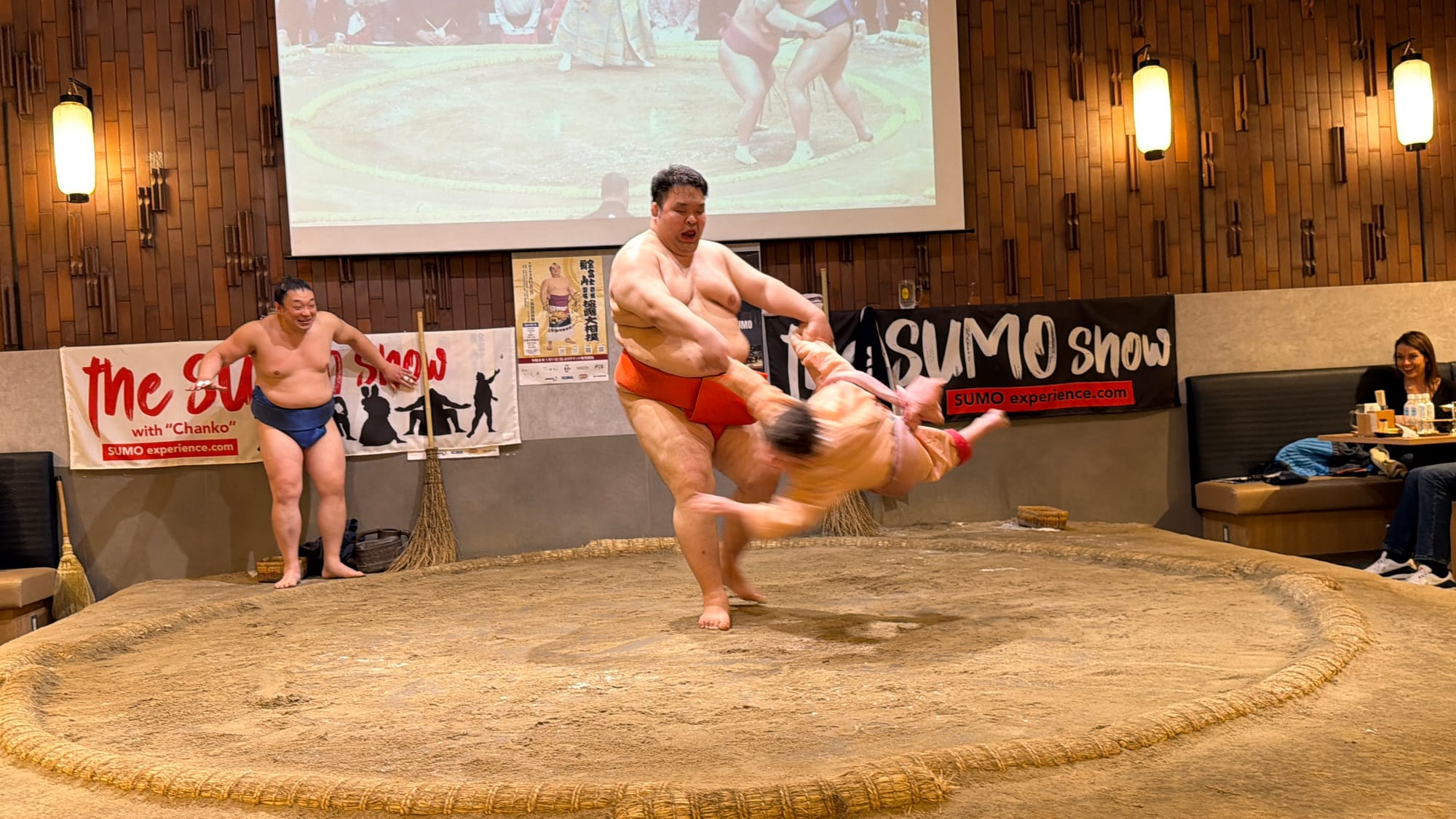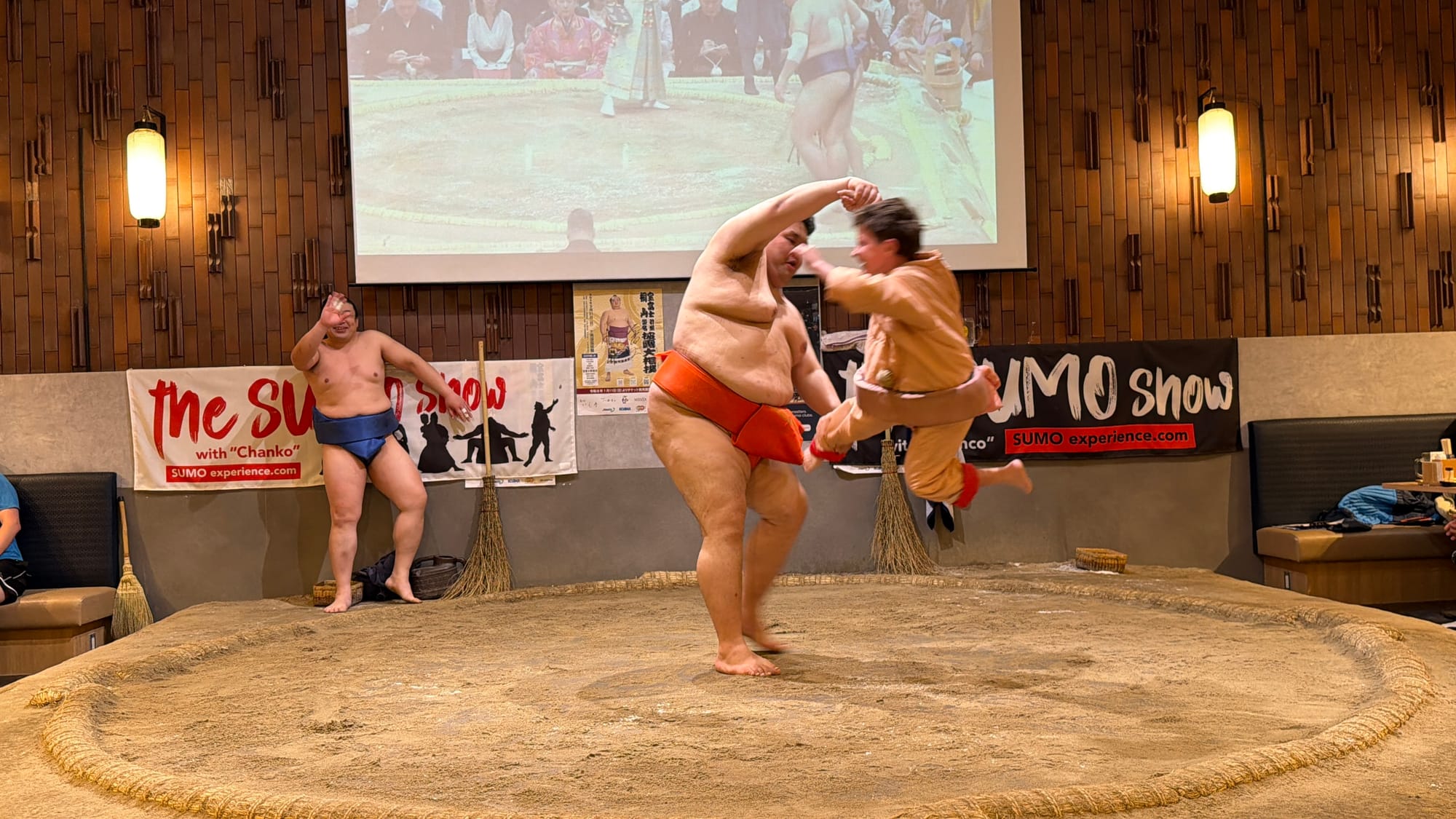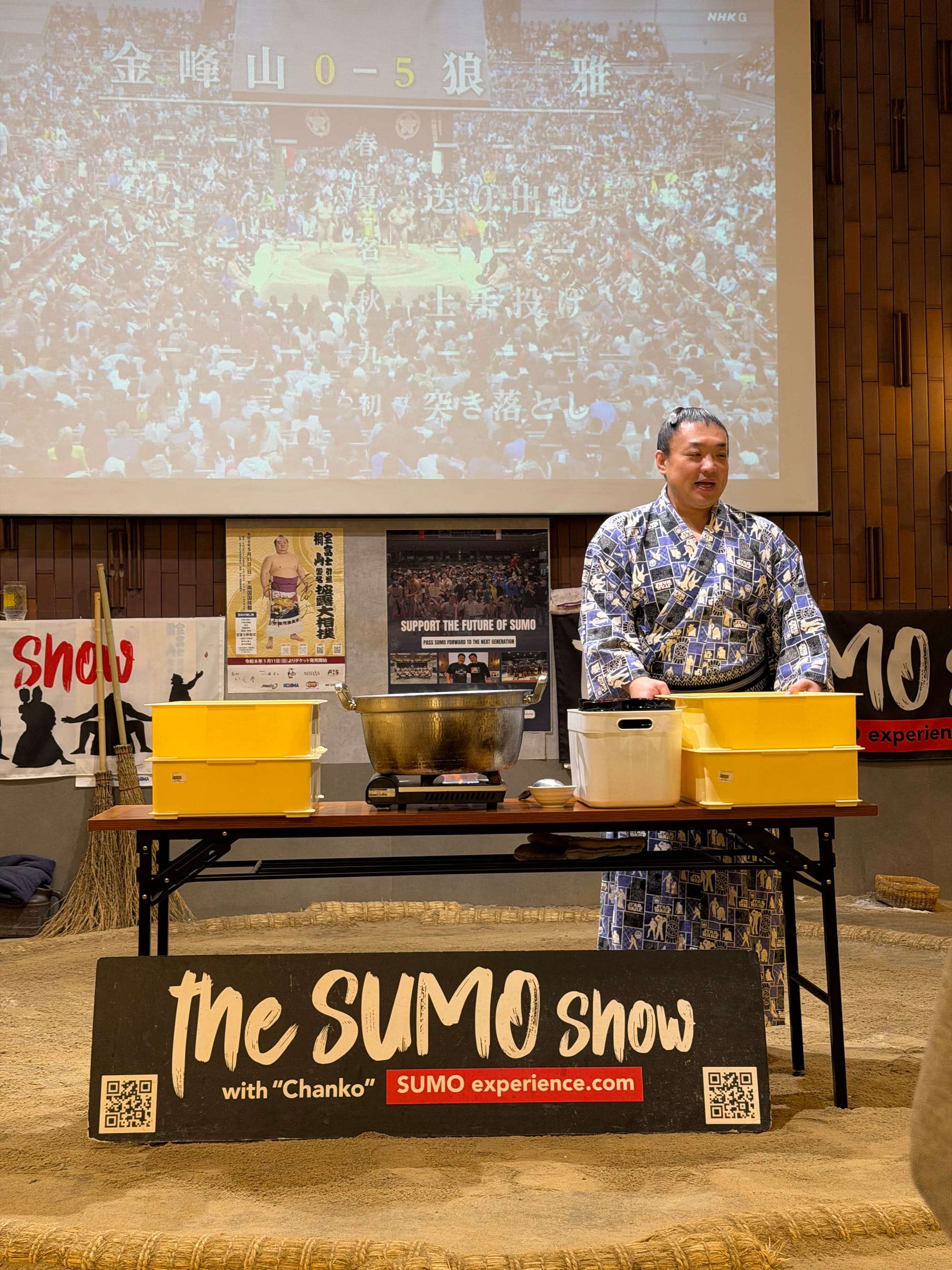 Our entire group booked a sumo show separately. It was kind of touristy, but fun. They served us a small dinner with Chanko, a one-pot dish commonly eaten in vast quantities by sumo wrestlers while trying to gain weight, prepared by a retired sumo wrestler. We were given an overview of the rules of sumo, an overview and demonstration of their daily workout, and some of the most common techniques used during a match. During a major competition, a wrestler will only have one match so it is very important he is prepared. Each bout normally only lasts for a few seconds, though can go longer if the competitors are closely matched. If the bout takes more than 4 minutes the referee asks for a break.