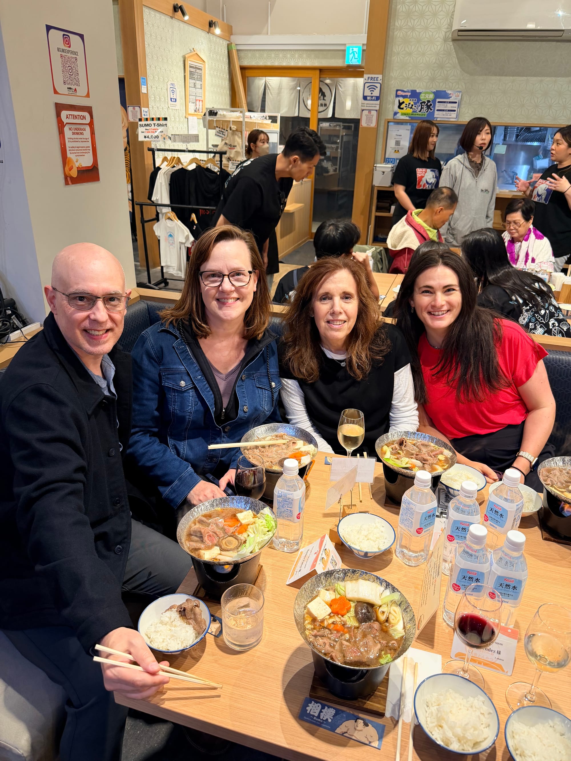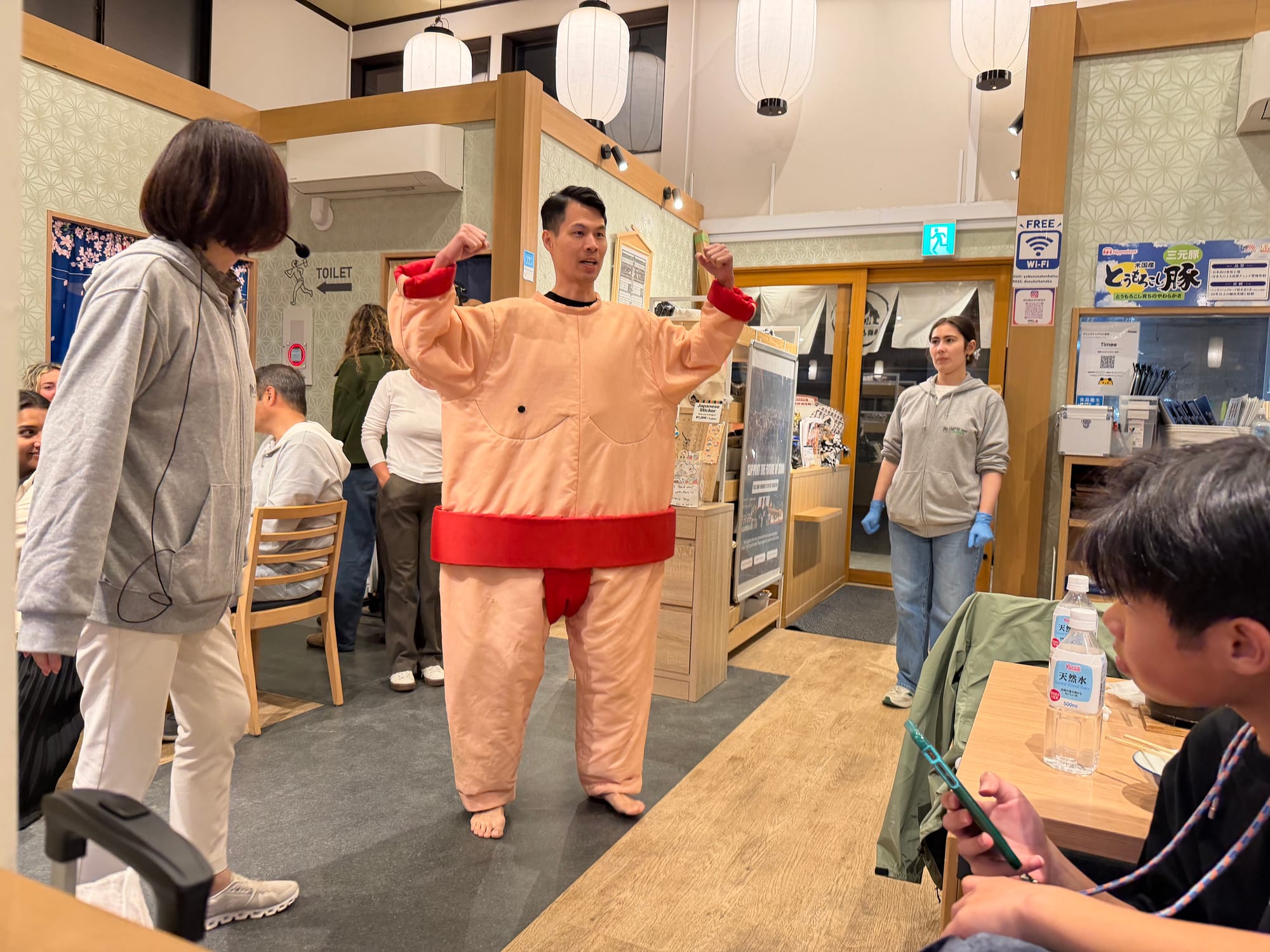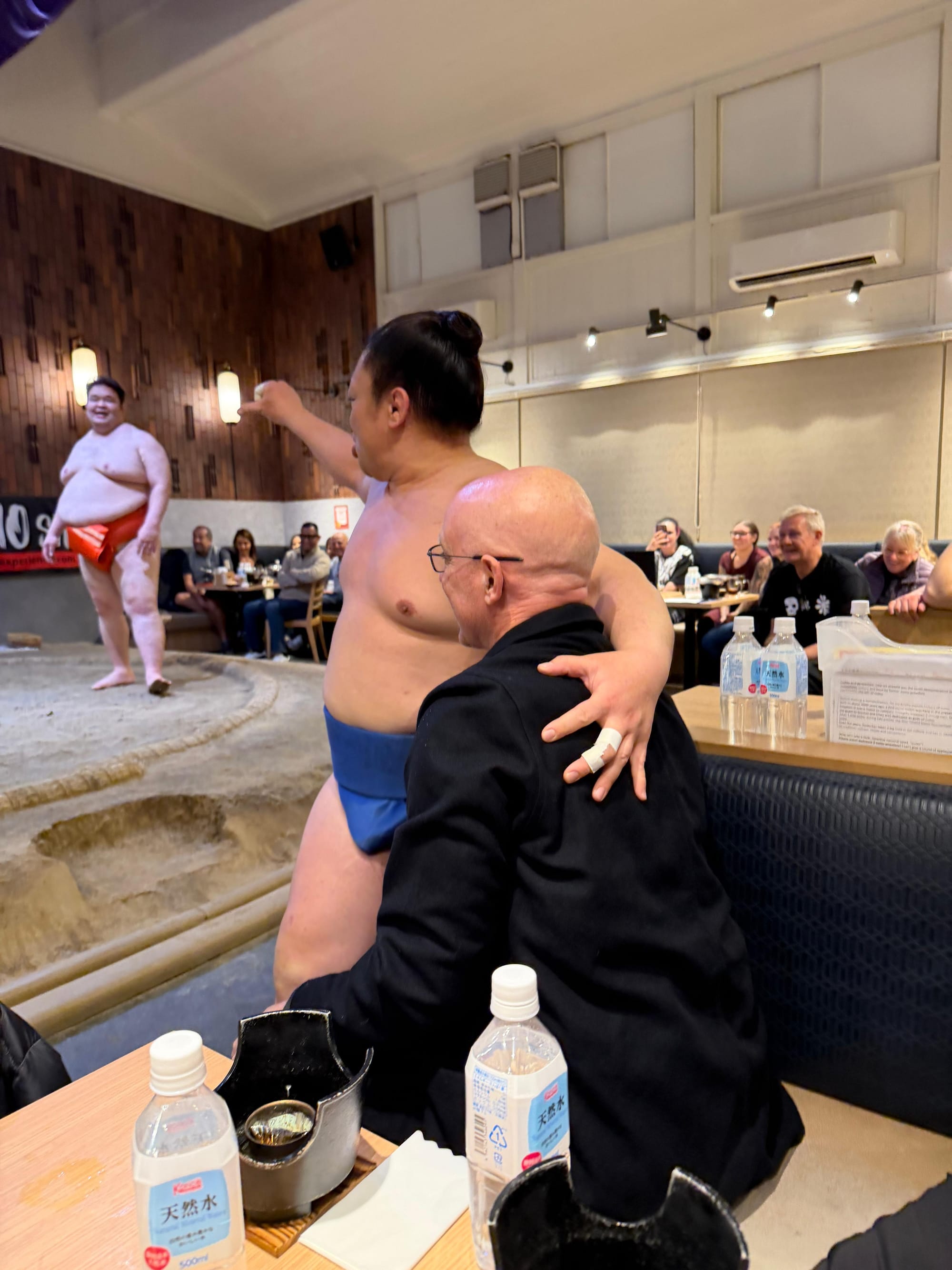 Our entire group booked a sumo show separately. It was kind of touristy, but fun. They served us a small dinner with Chanko, a one-pot dish commonly eaten in vast quantities by sumo wrestlers while trying to gain weight, prepared by a retired sumo wrestler. We were given an overview of the rules of sumo, an overview and demonstration of their daily workout, and some of the most common techniques used during a match. During a major competition, a wrestler will only have one match so it is very important he is prepared. Each bout normally only lasts for a few seconds, though can go longer if the competitors are closely matched. If the bout takes more than 4 minutes the referee asks for a break.