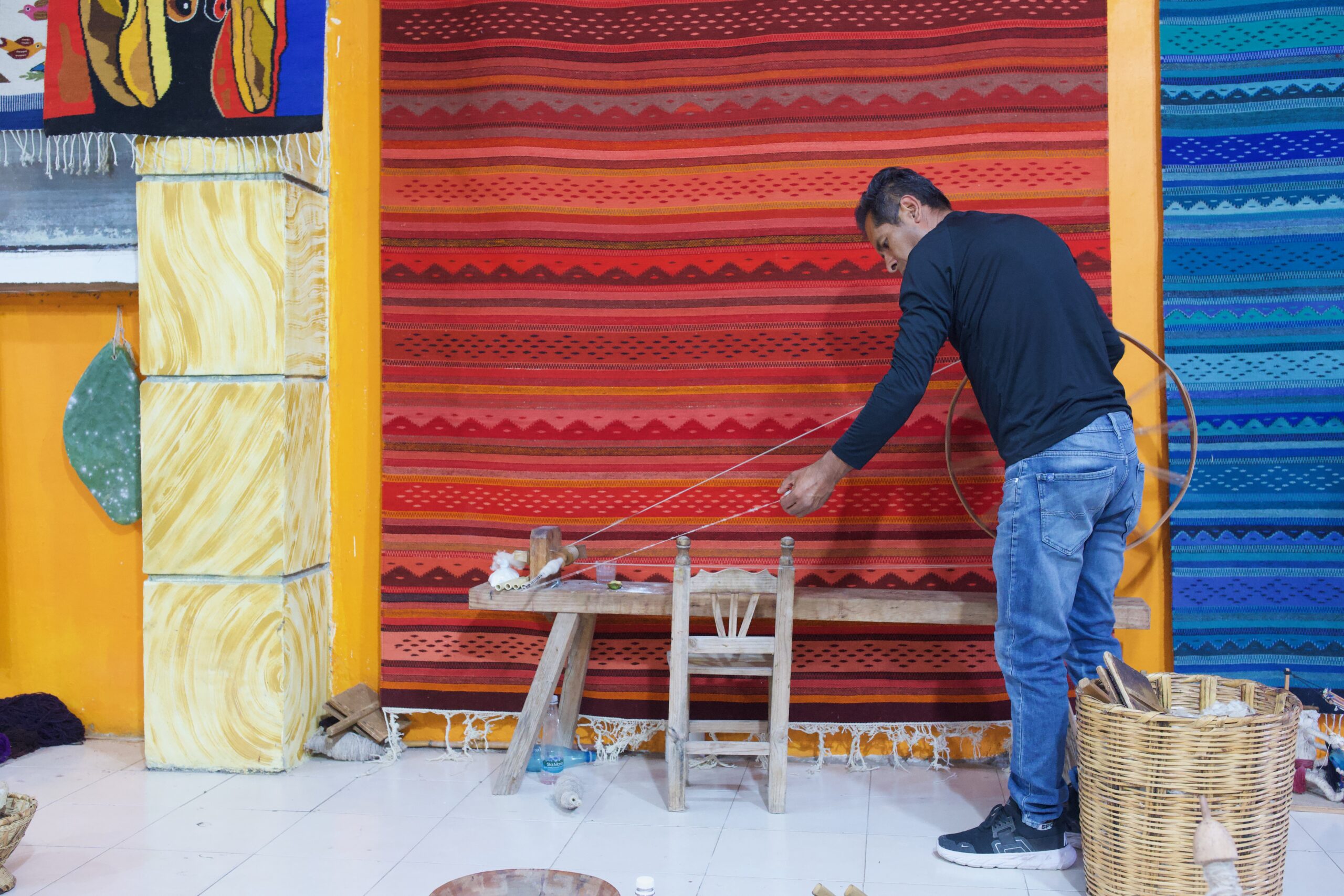 In the afternoon we headed a short distance out of town for a demonstration on how to make tortillas and visit a local family that weaves rugs. We were able to try and make tortillas and then enjoyed soup, meats, and some mezcal experiments with our homemade tortillas. After a quick bite to eat, we were shown a quick demonstration of the rug making process using natural dyes and a hand weaver.