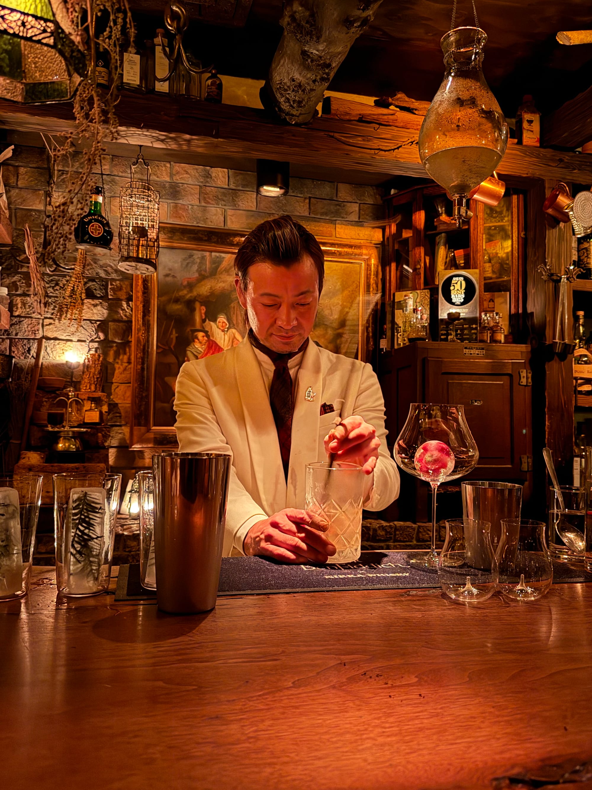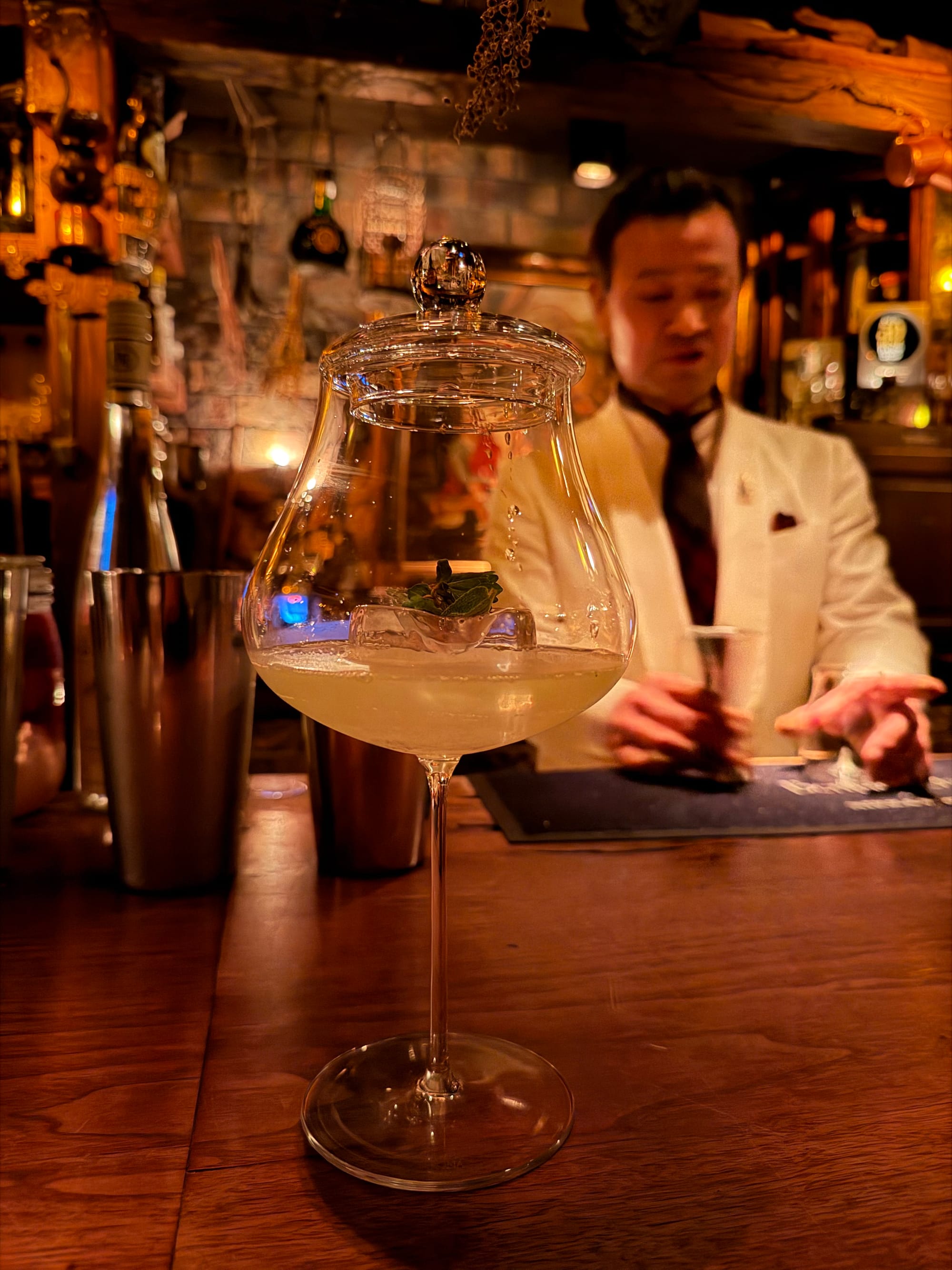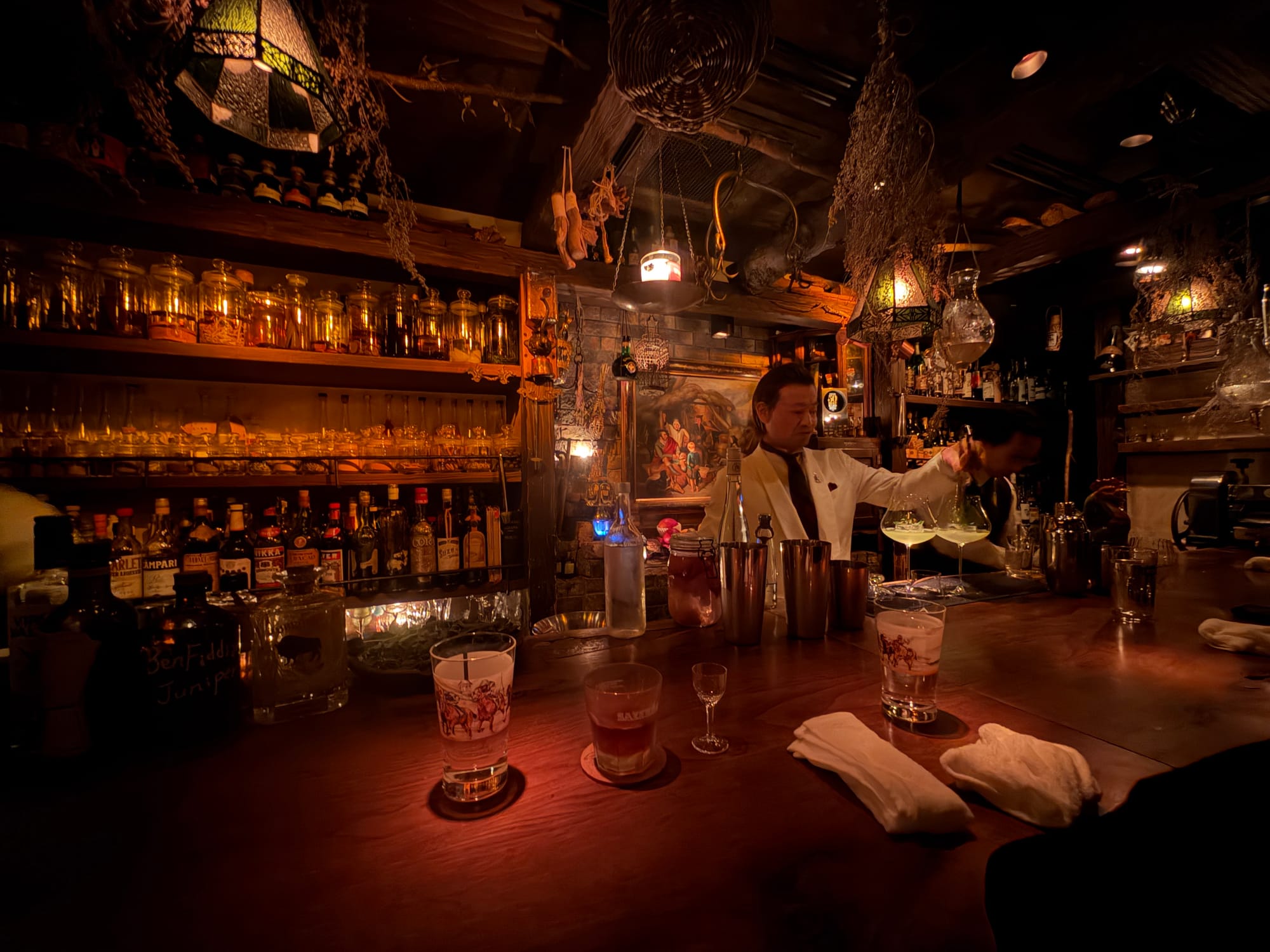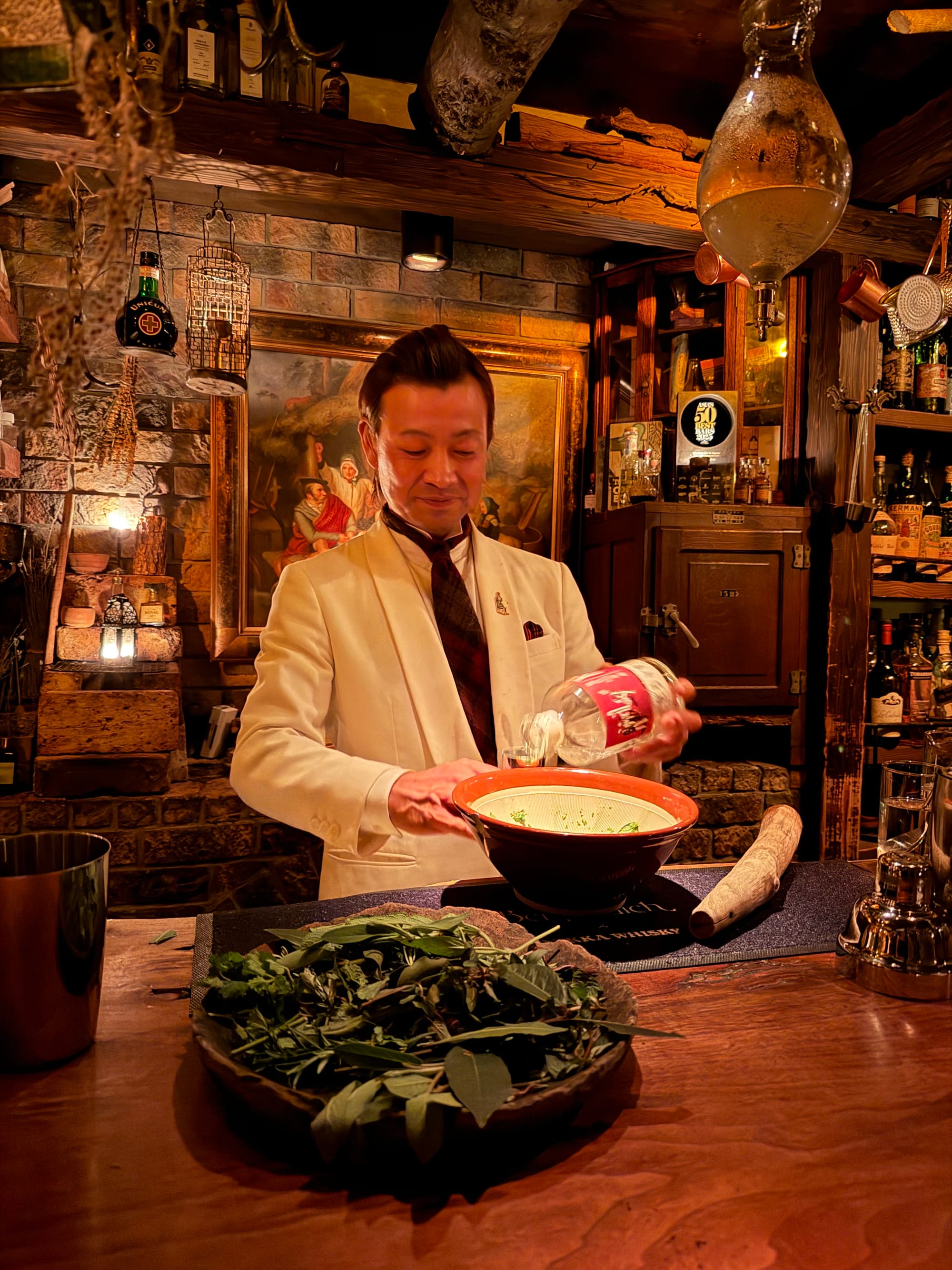 Most drinks contain something from the farm. Twigs snapped fresh from mizunara or juniper trees might be used to stir a drink. Kayama might take a splash of honey water from one of the absinthe drippers hanging above the bar, or he might reach for one of his many bottles whose labels fell off decades ago. We sat at the walnut counter facing those bottles, some of which are global classics, others his own work, including a farm-distilled absinthe, fresh fruit and herbs, inventive infusions, and a painting of an illicit Highland distilling operation.