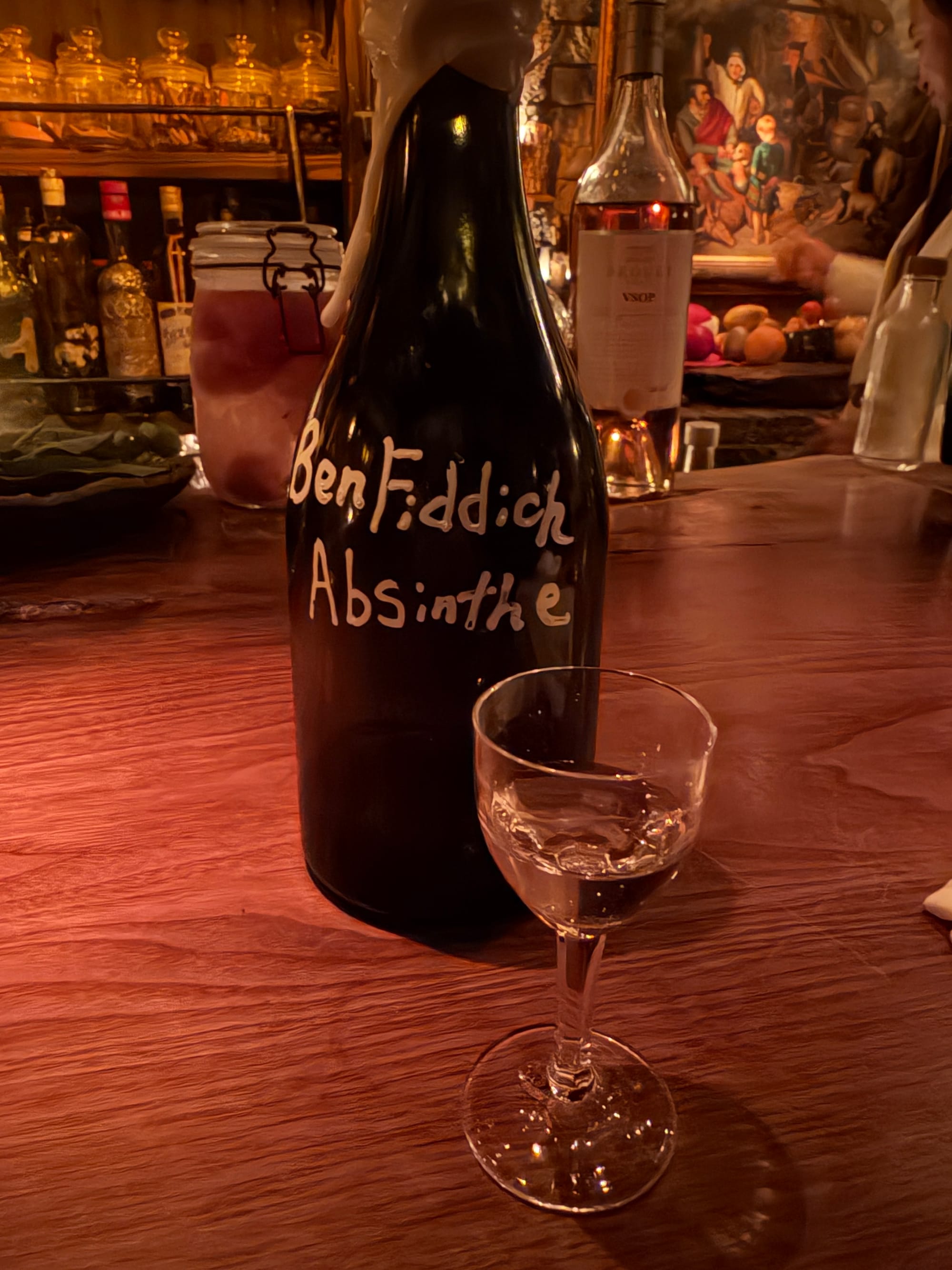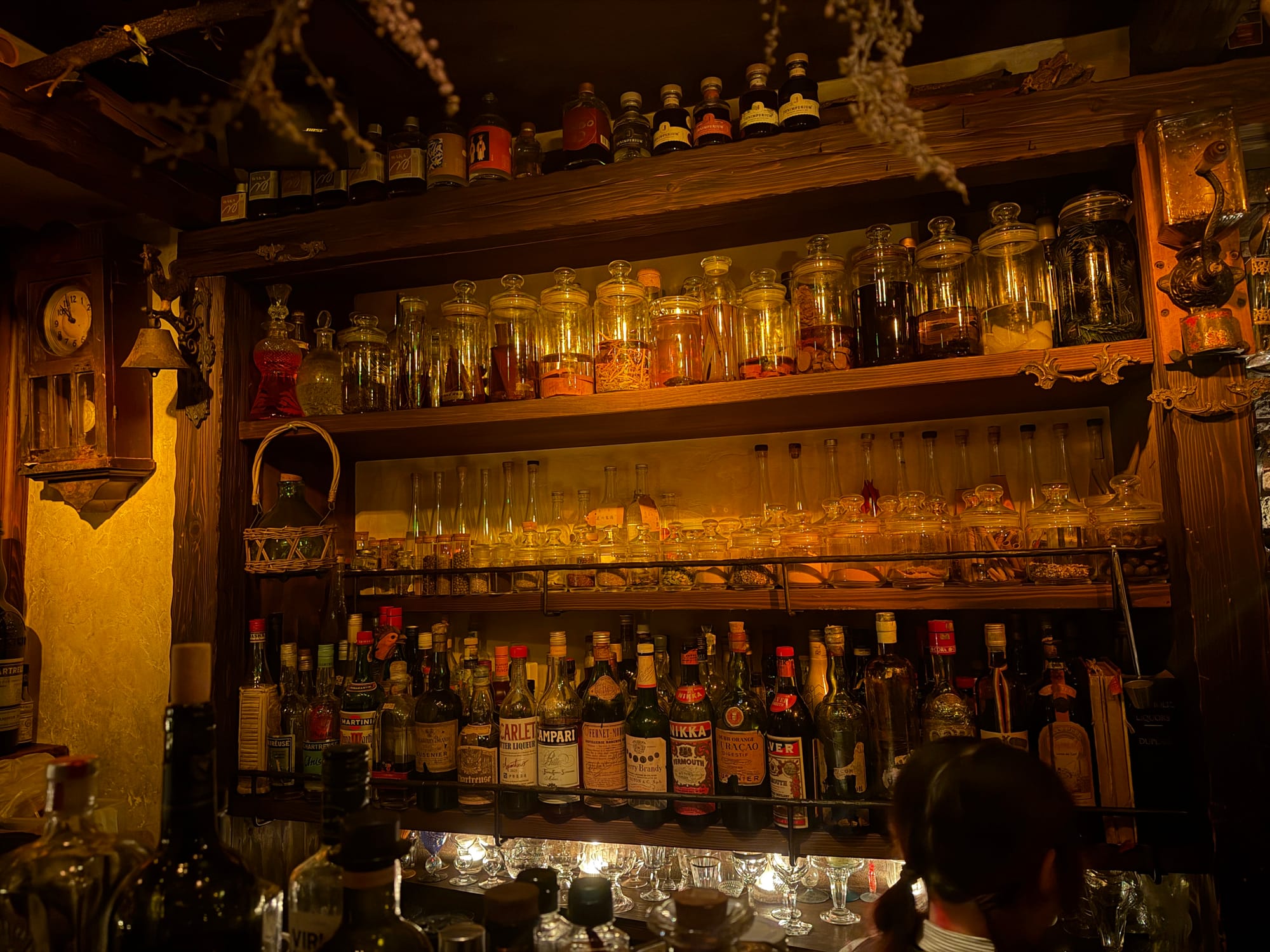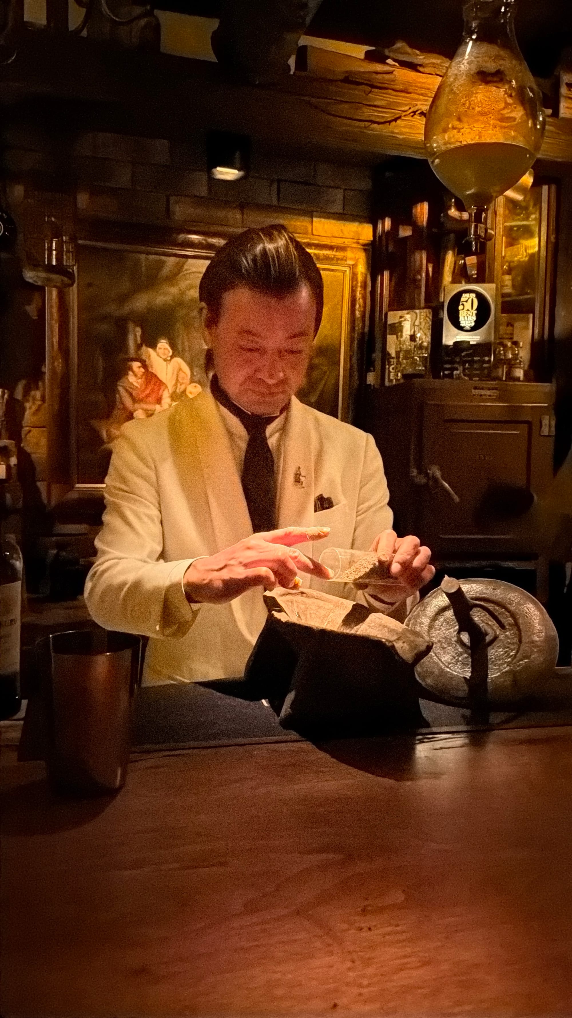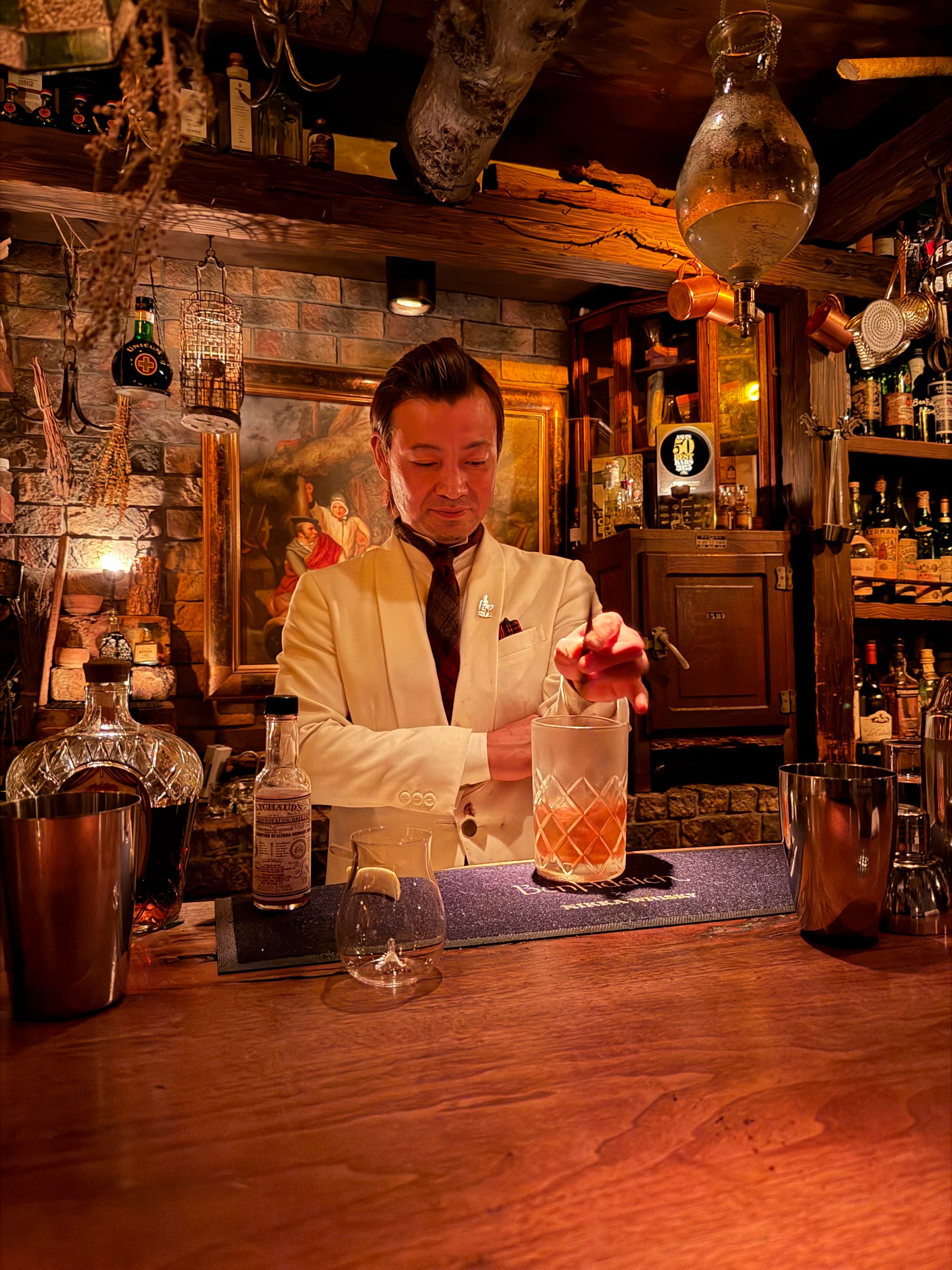 Most drinks contain something from the farm. Twigs snapped fresh from mizunara or juniper trees might be used to stir a drink. Kayama might take a splash of honey water from one of the absinthe drippers hanging above the bar, or he might reach for one of his many bottles whose labels fell off decades ago. We sat at the walnut counter facing those bottles, some of which are global classics, others his own work, including a farm-distilled absinthe, fresh fruit and herbs, inventive infusions, and a painting of an illicit Highland distilling operation.