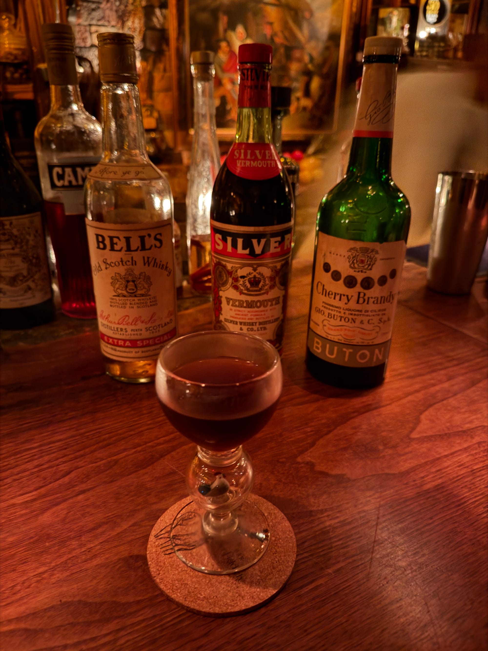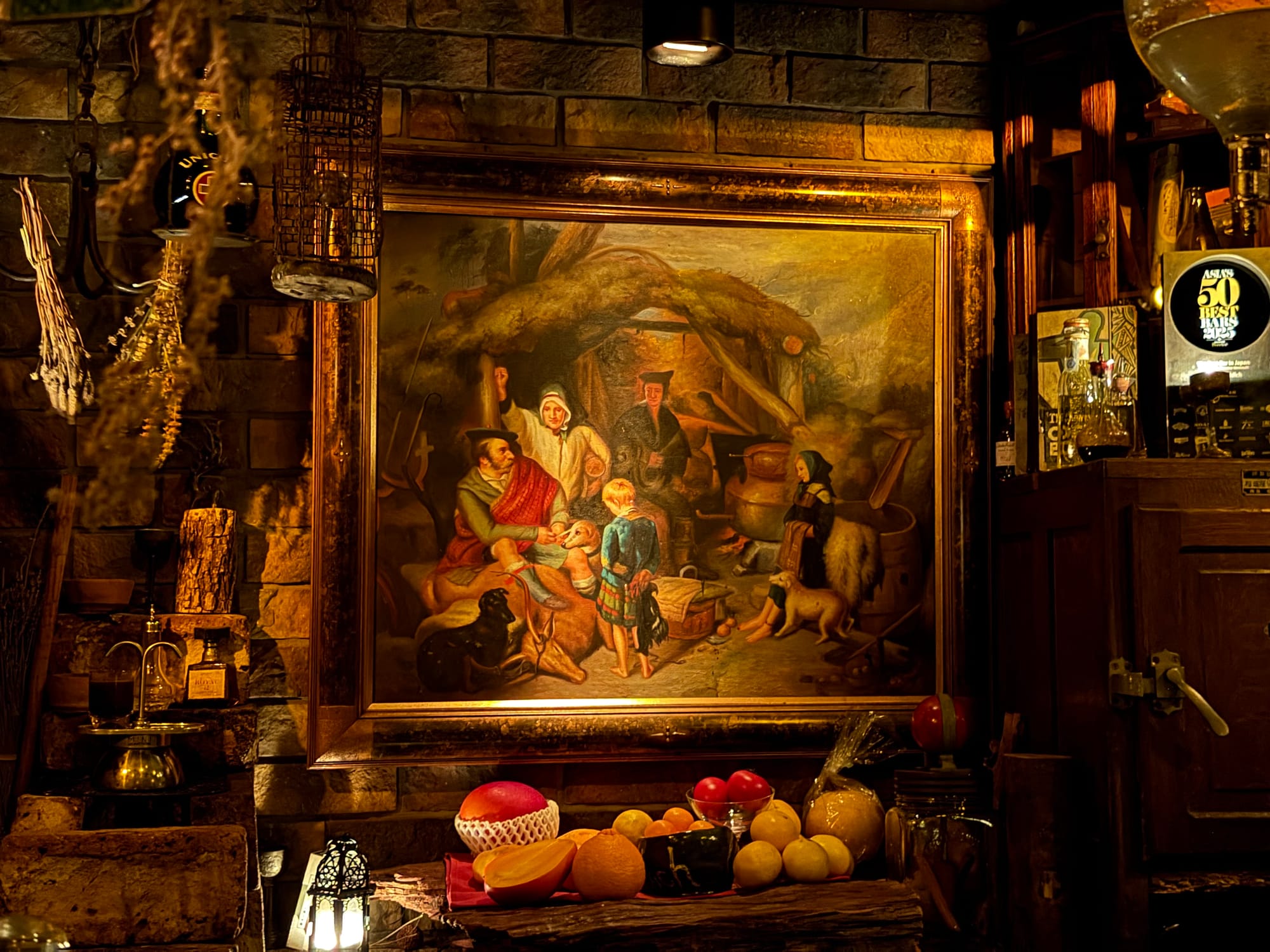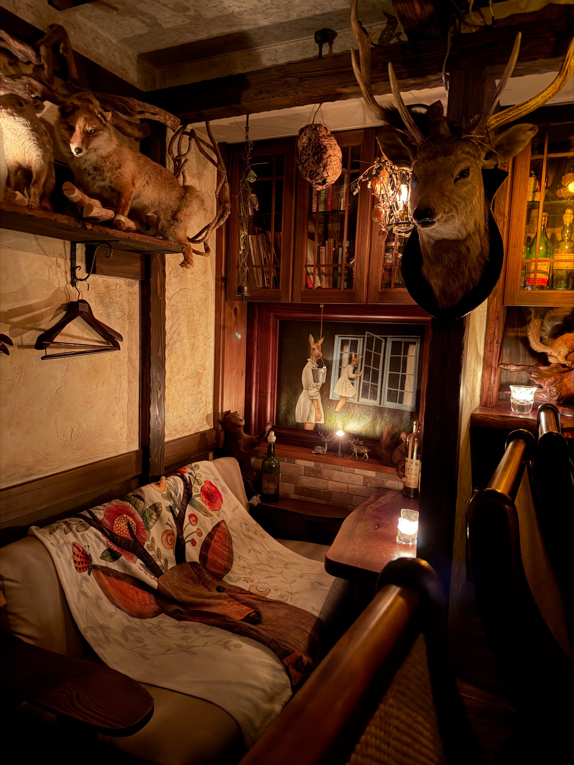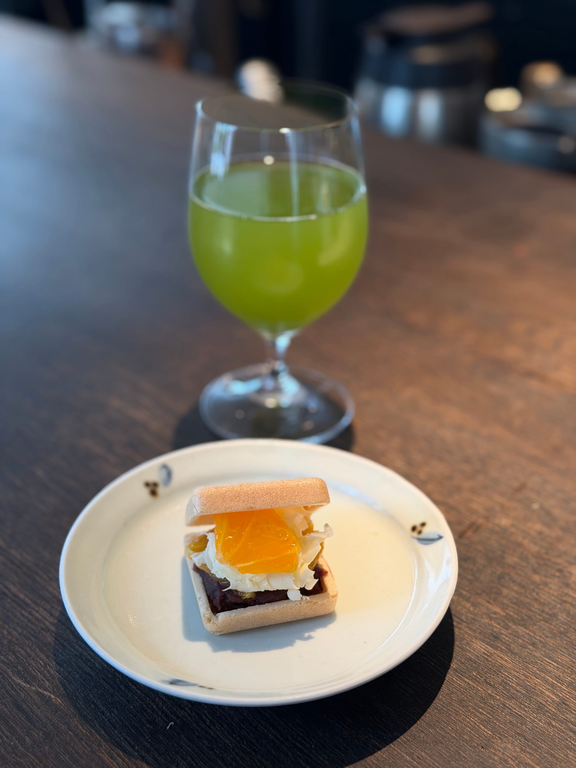 Most drinks contain something from the farm. Twigs snapped fresh from mizunara or juniper trees might be used to stir a drink. Kayama might take a splash of honey water from one of the absinthe drippers hanging above the bar, or he might reach for one of his many bottles whose labels fell off decades ago. We sat at the walnut counter facing those bottles, some of which are global classics, others his own work, including a farm-distilled absinthe, fresh fruit and herbs, inventive infusions, and a painting of an illicit Highland distilling operation.