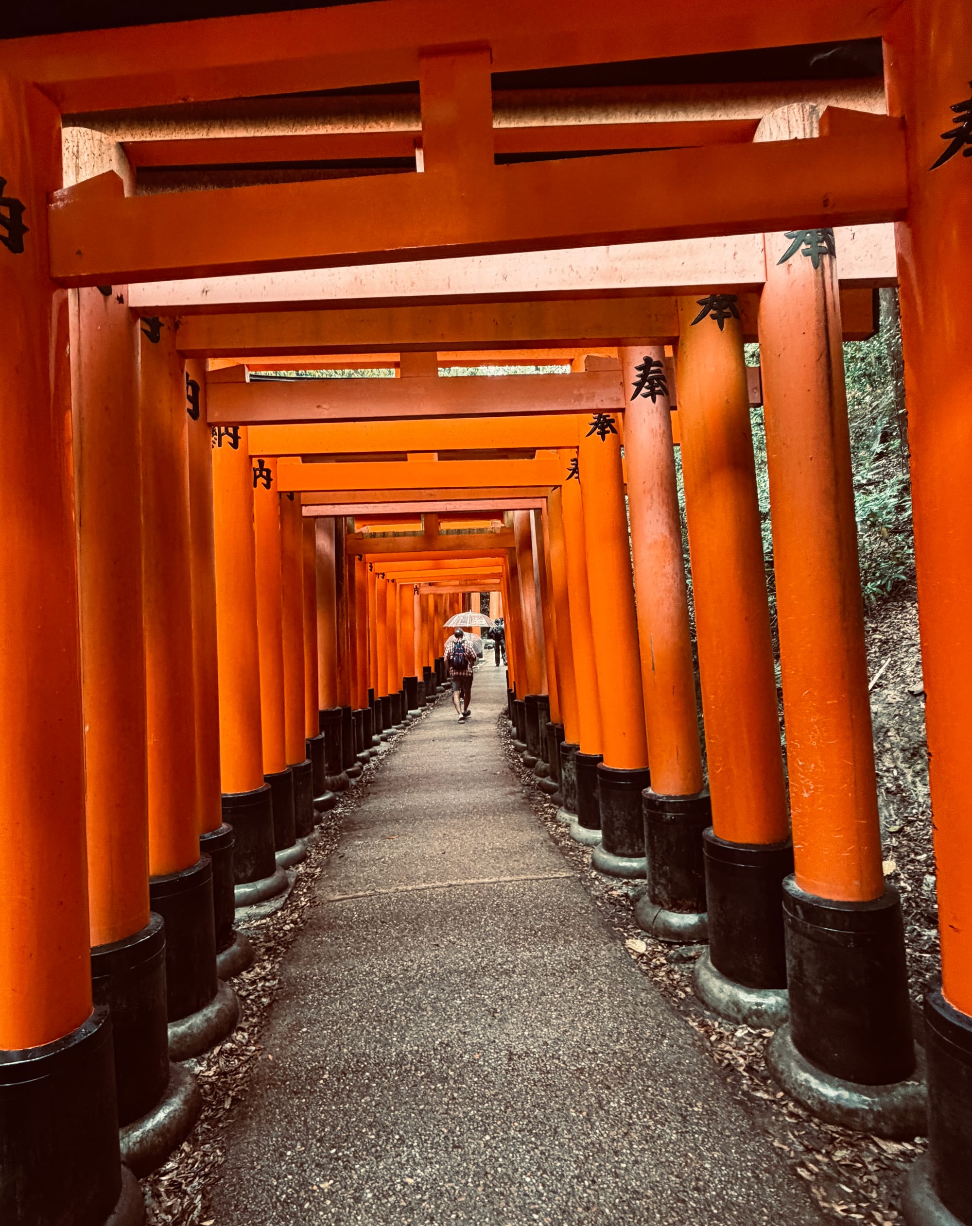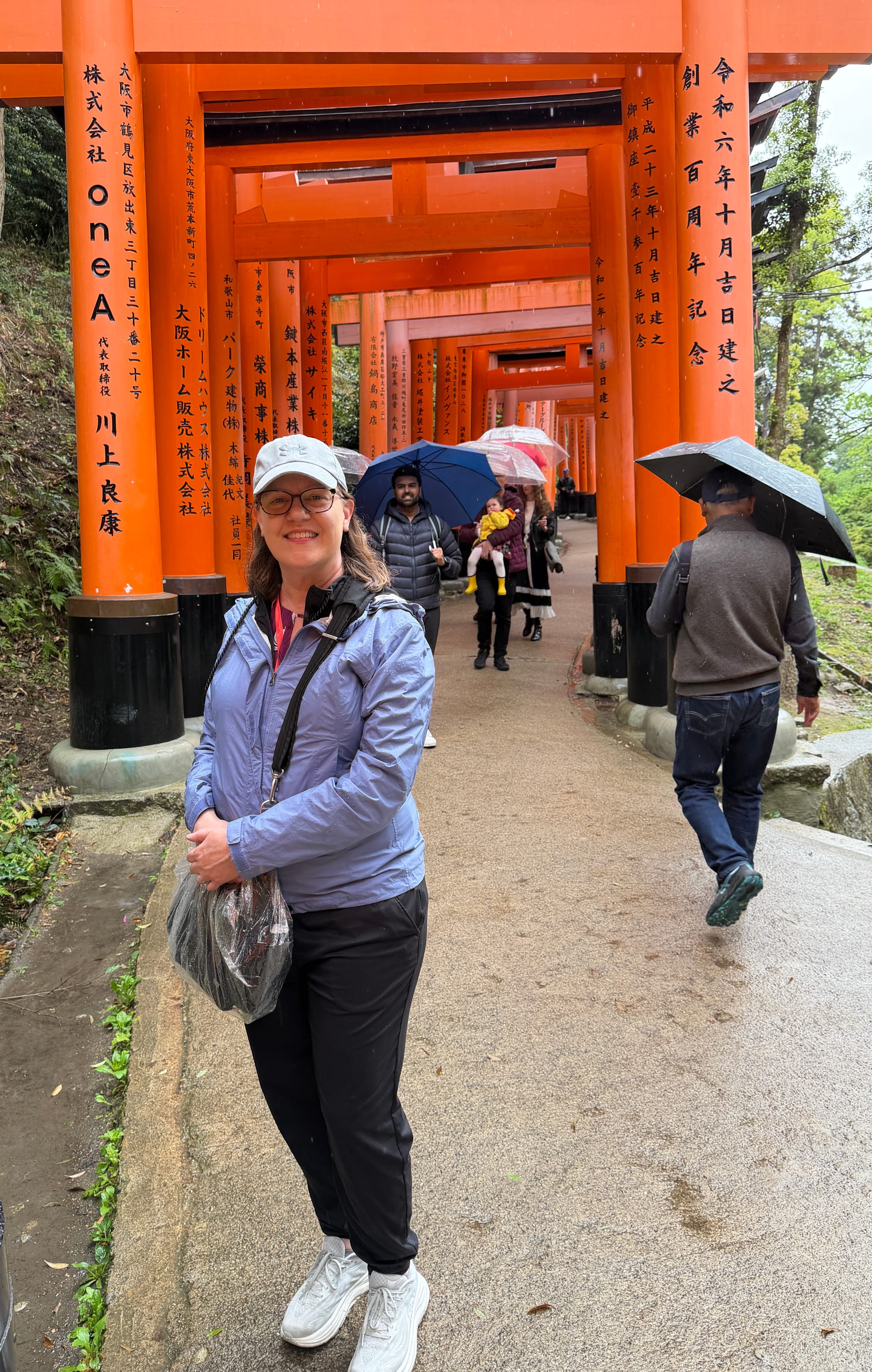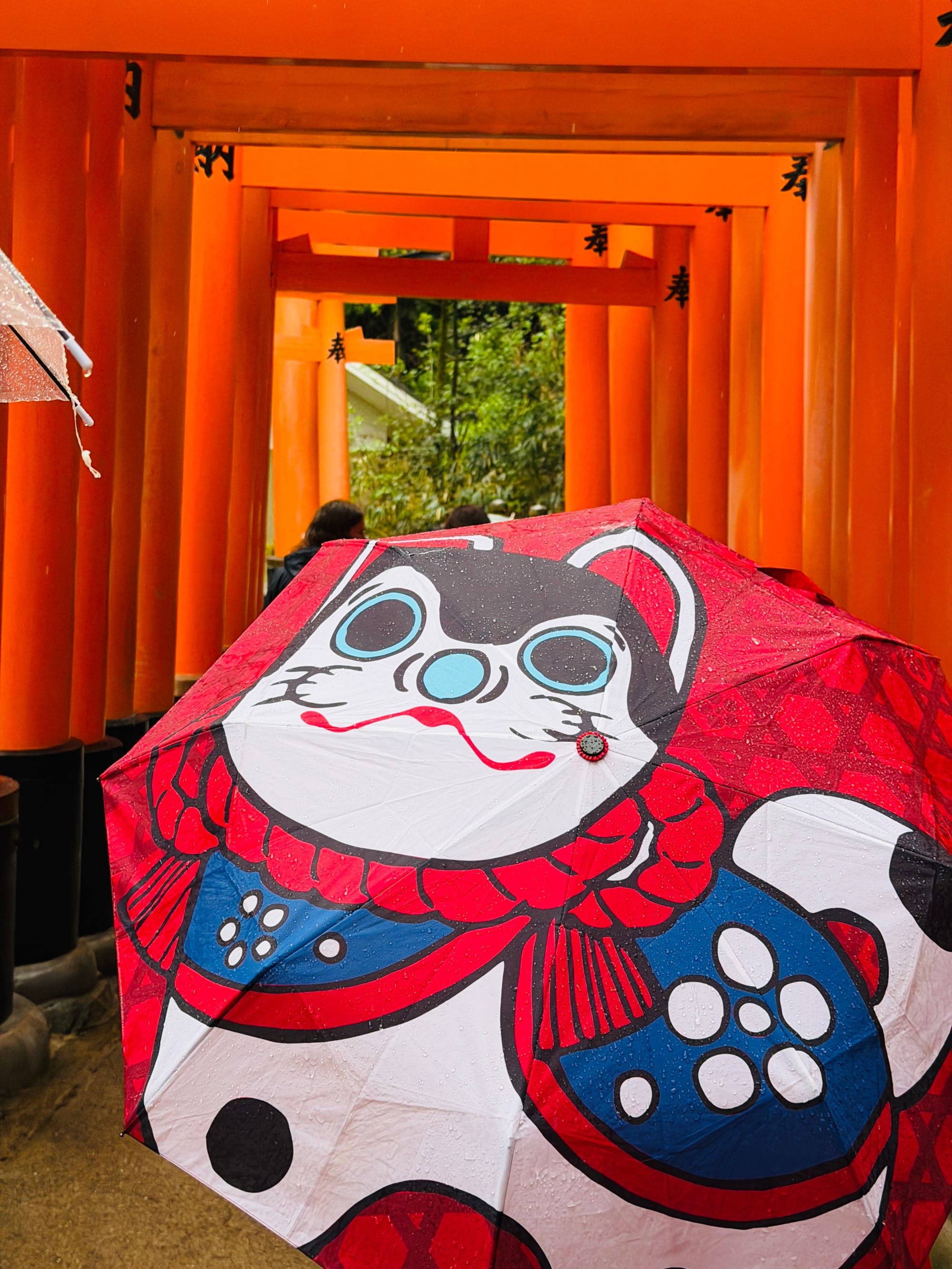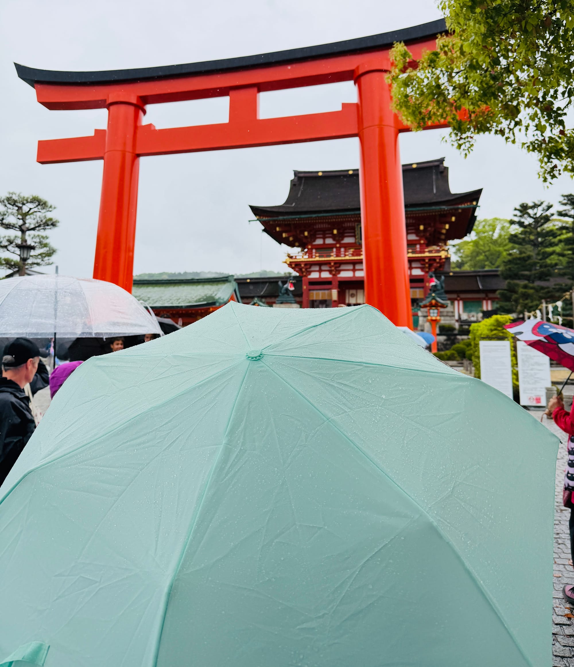 Rain or shine, the show must go on. We knew it would be a pretty wet day and were prepared for it. Our first stop of the morning was the Fushimi Inari Taisha Shrine. This is an important Shinto Shrine in southern Kyoto. It is famous for its thousands of vermilion torii gates, which straddle a network of trails behind its main buildings.
