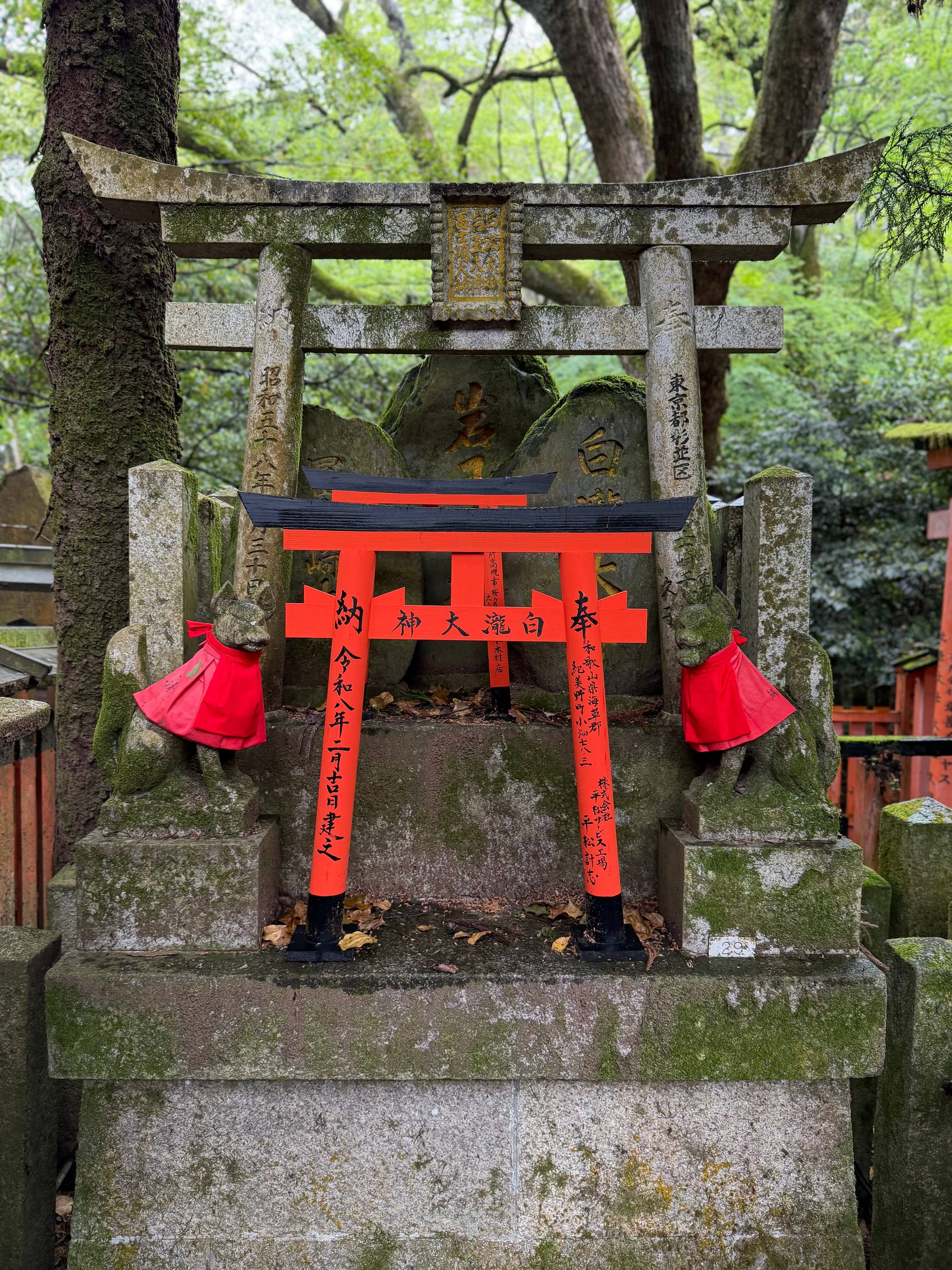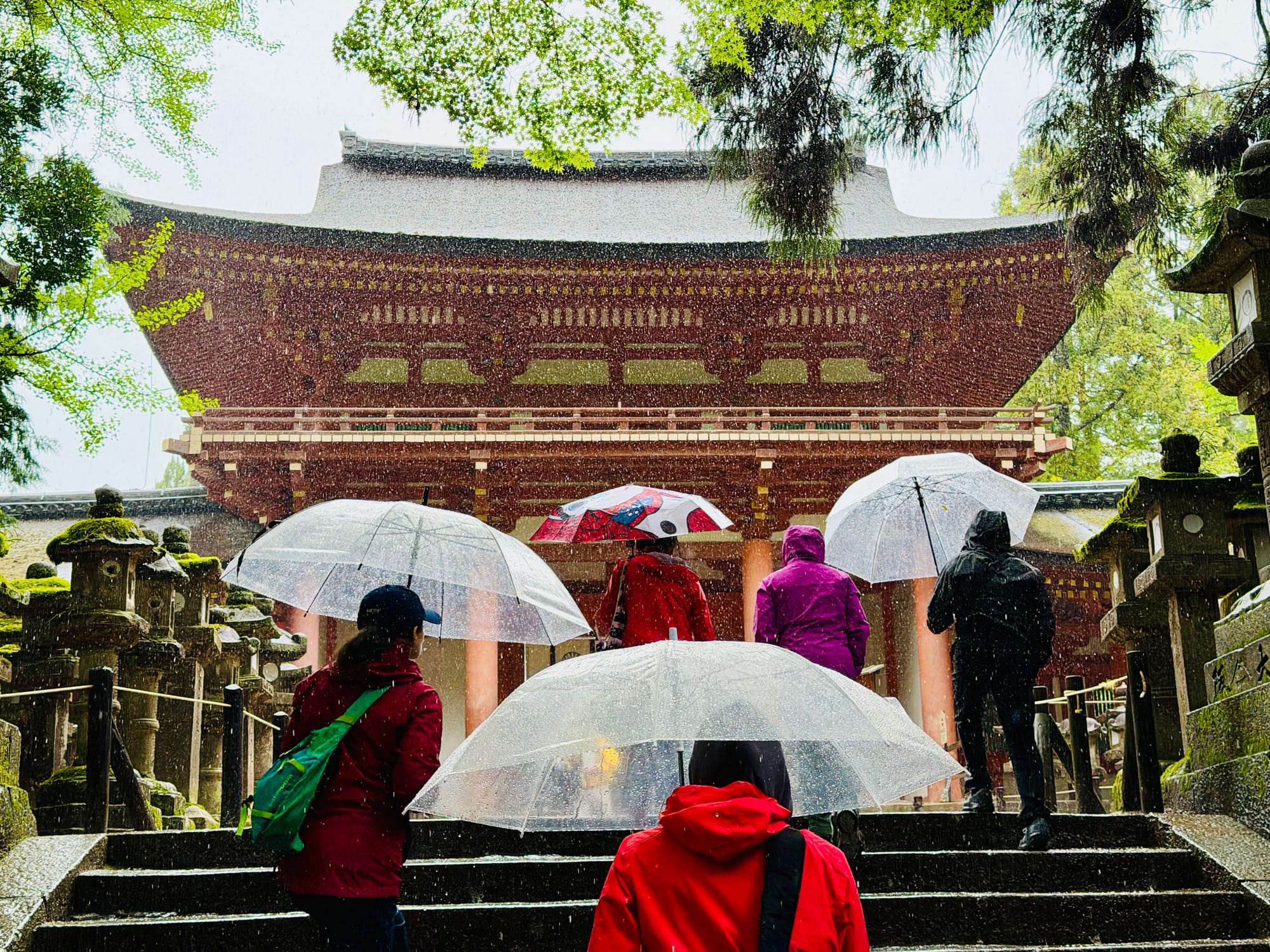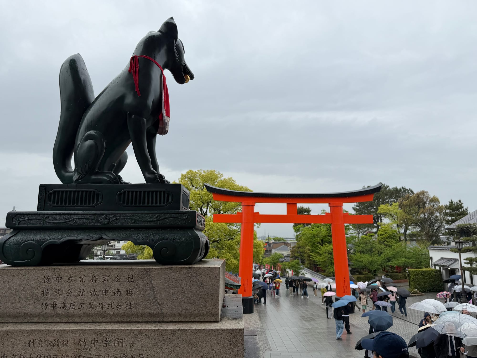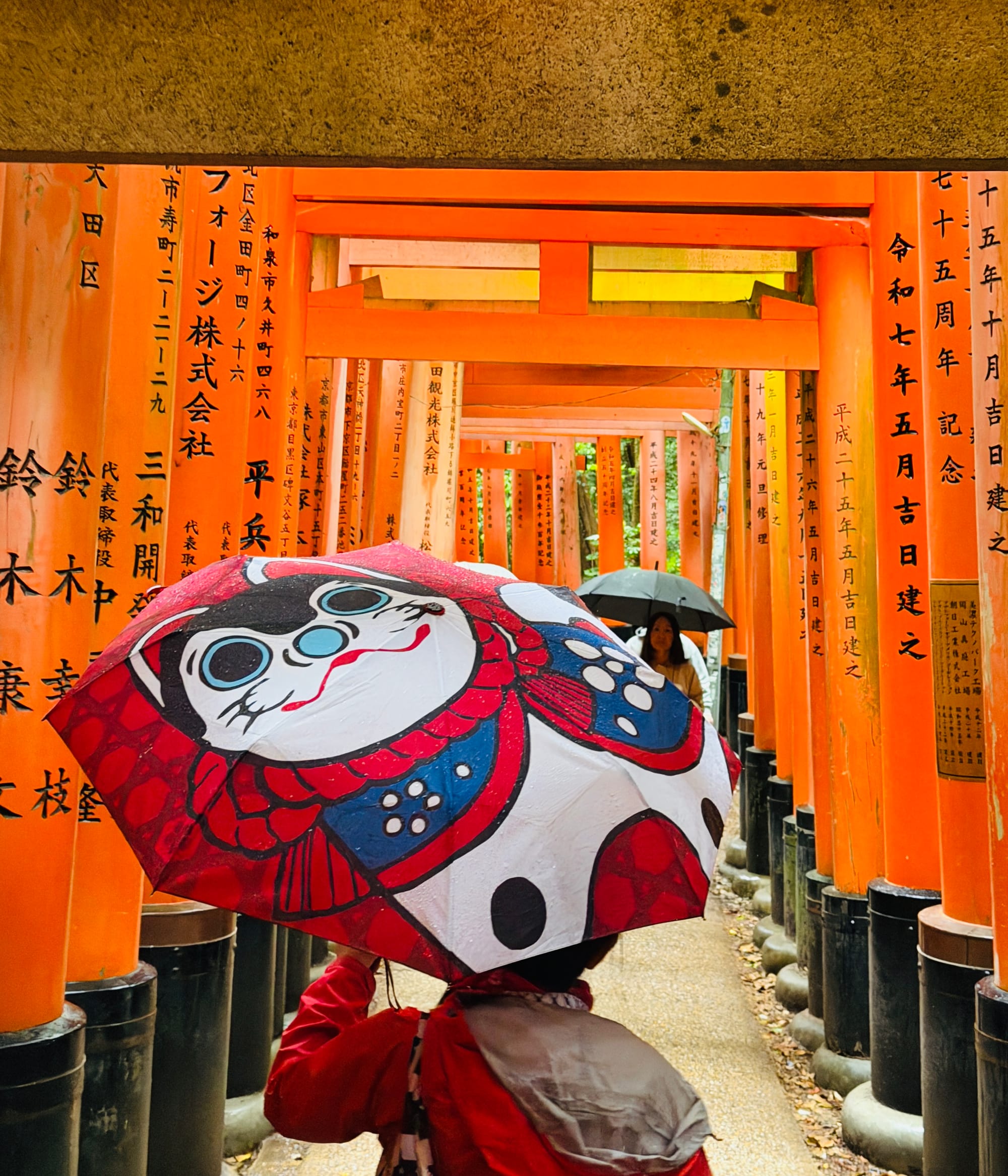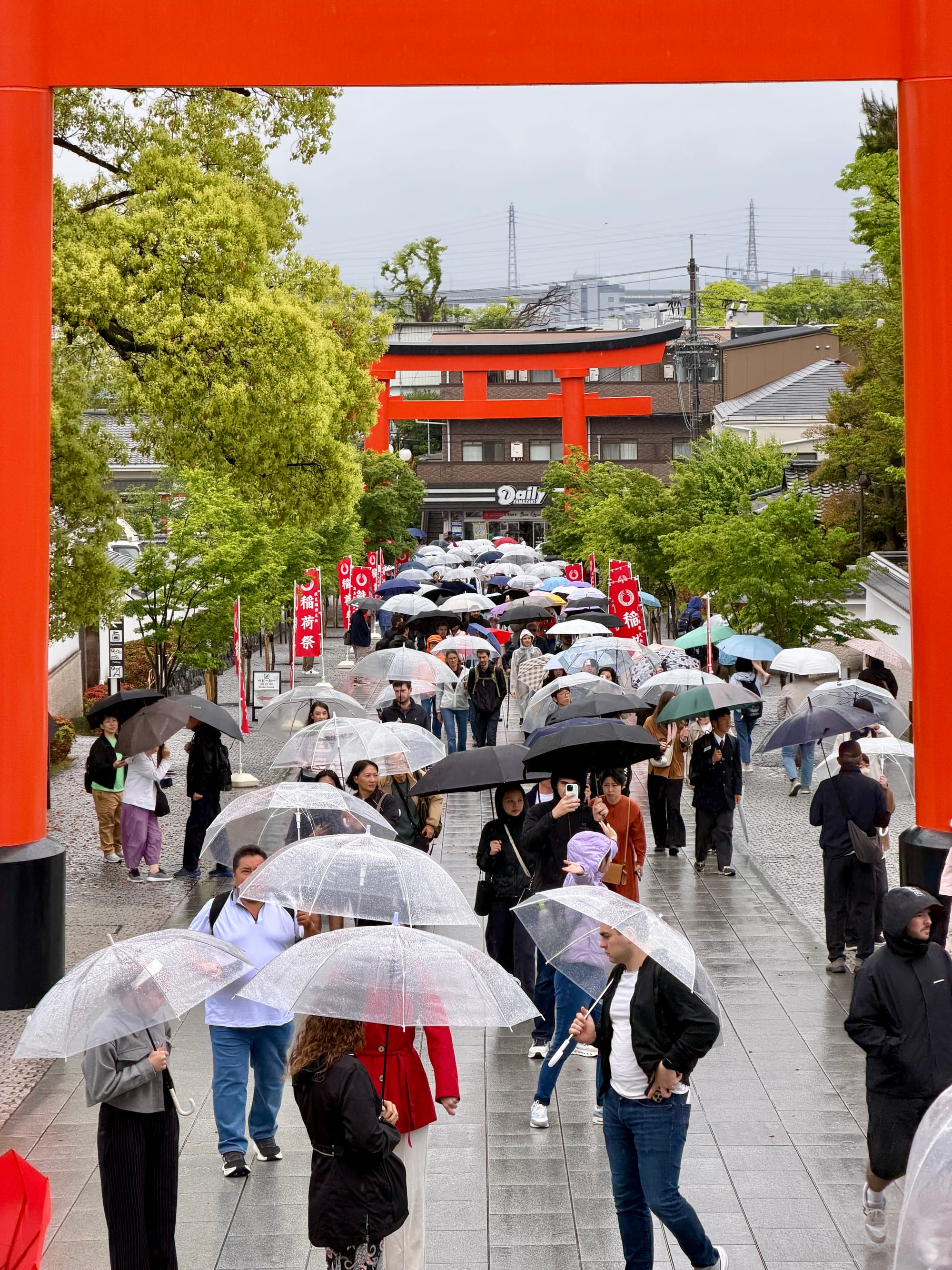 Rain or shine, the show must go on. We knew it would be a pretty wet day and were prepared for it. Our first stop of the morning was the Fushimi Inari Taisha Shrine. This is an important Shinto Shrine in southern Kyoto. It is famous for its thousands of vermilion torii gates, which straddle a network of trails behind its main buildings.