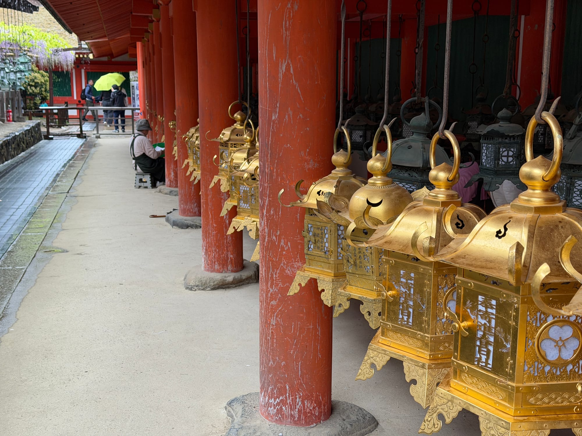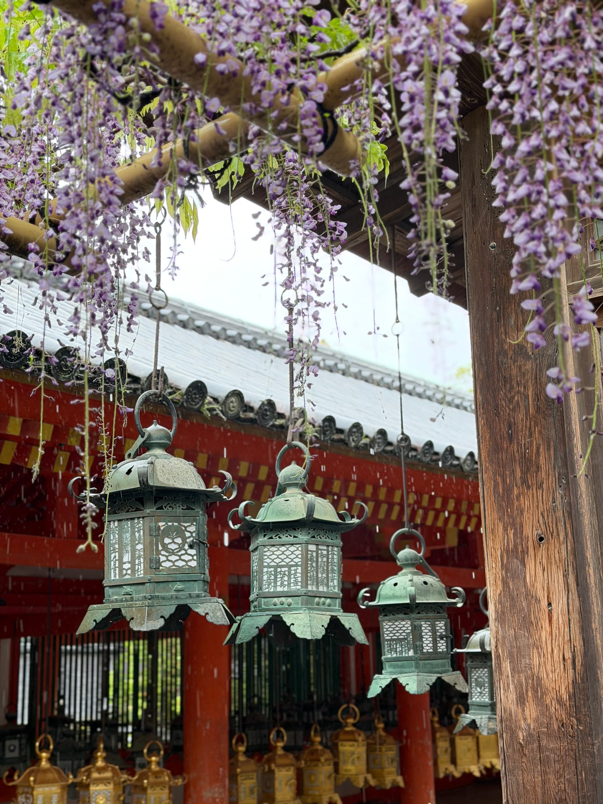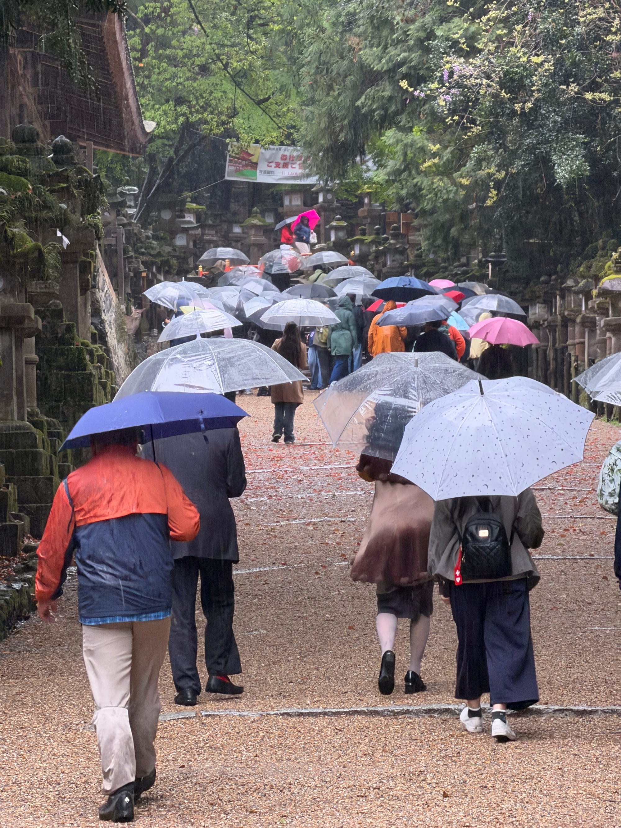 We hopped back on the subway, stopped for lunch in the station, and then made our way to Nara Park. Nara Park is known for its free-roaming deer and world famous temples. The deer are sacred here and have been trained to bow to ask for deer crackers that are sold throughout the park. The rain didn’t stop the deer from coming out to meet and greet those of us that braved the weather. In the park there are also a few other attractions. The first one we visited was the Shrine. The vermillion and white shrine buildings are festooned with beautiful brass lanterns, lit twice a year in winter and summer. The shrine is also famous for wisteria flowers that bloom in May.