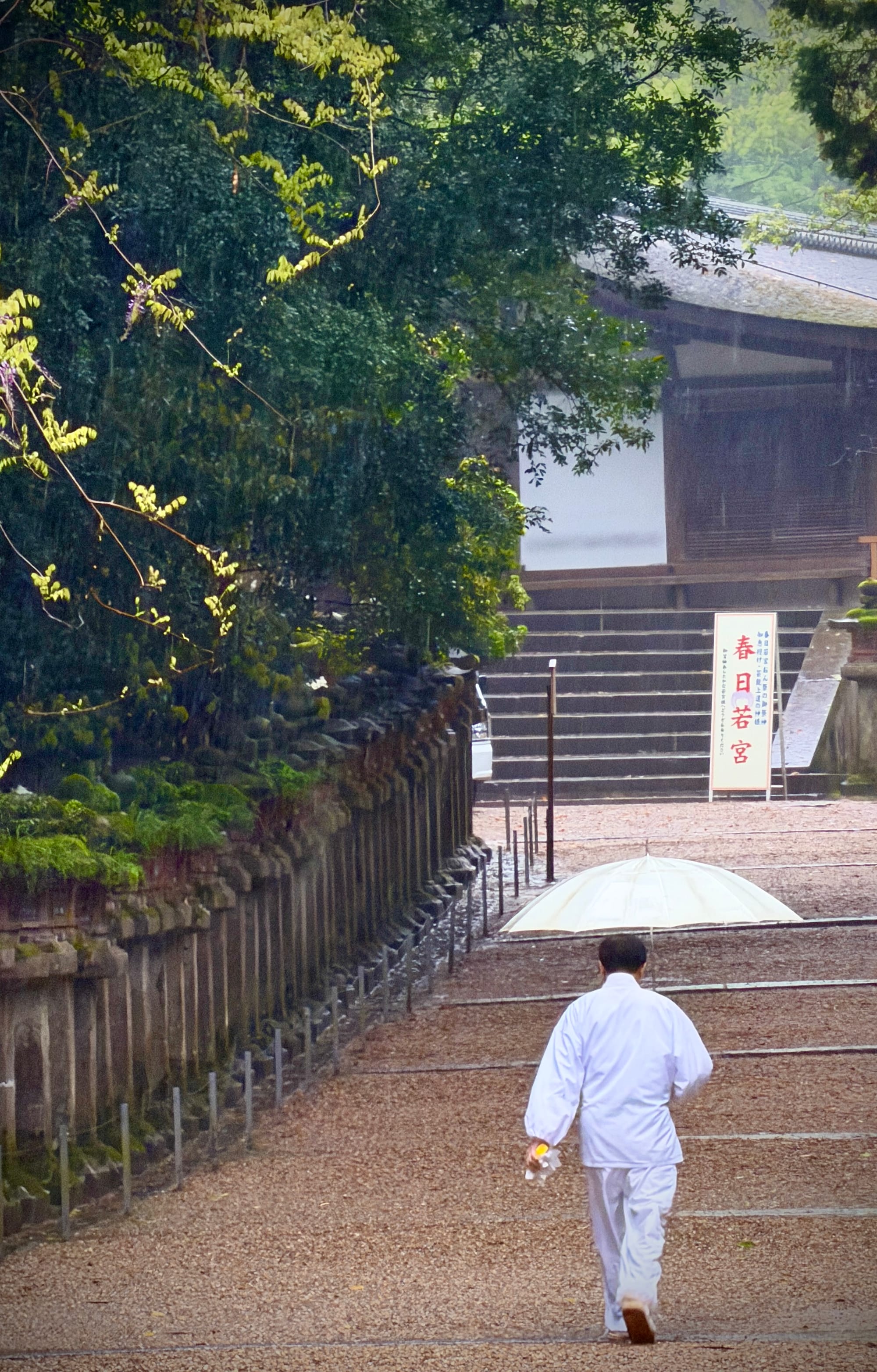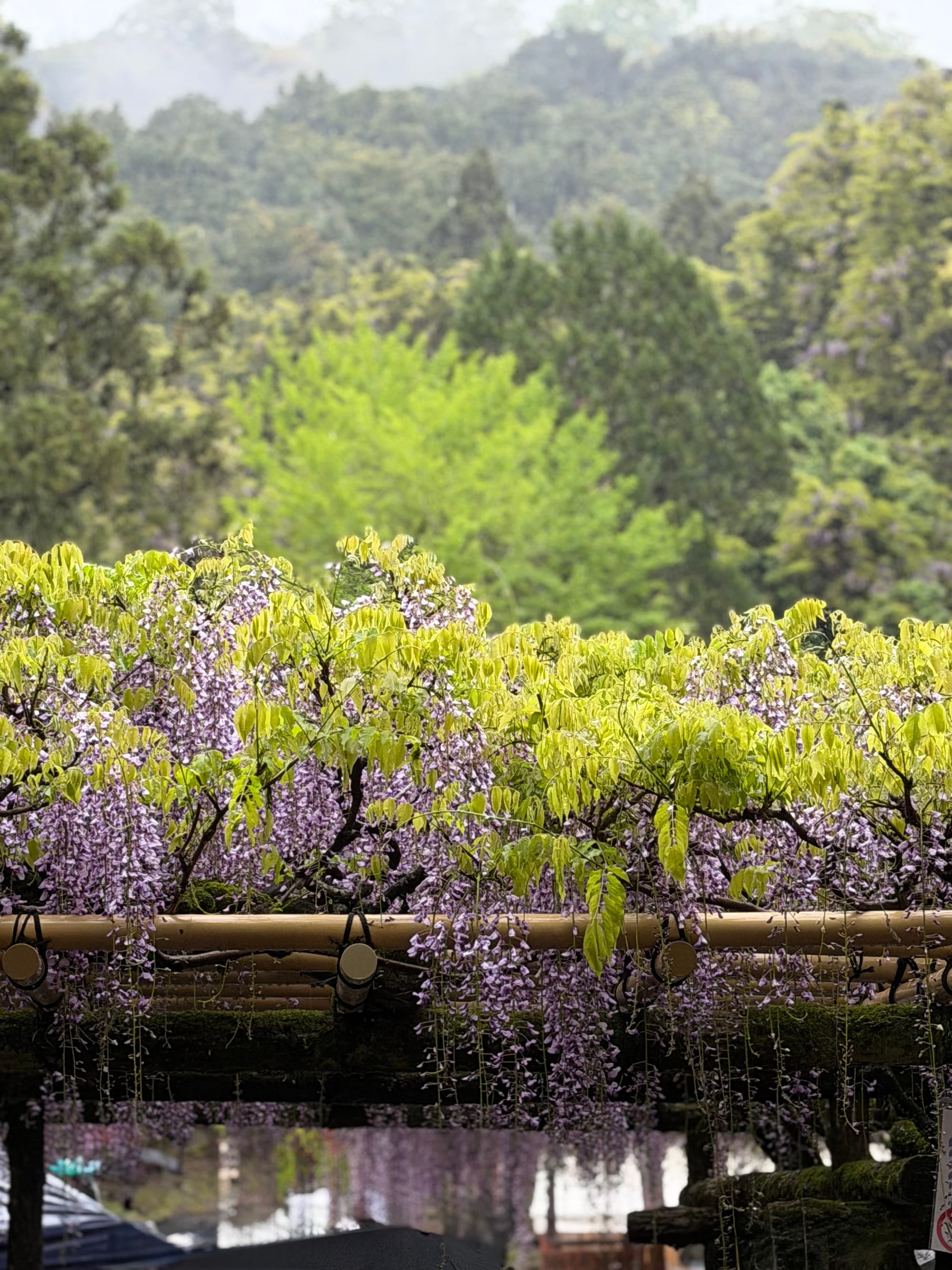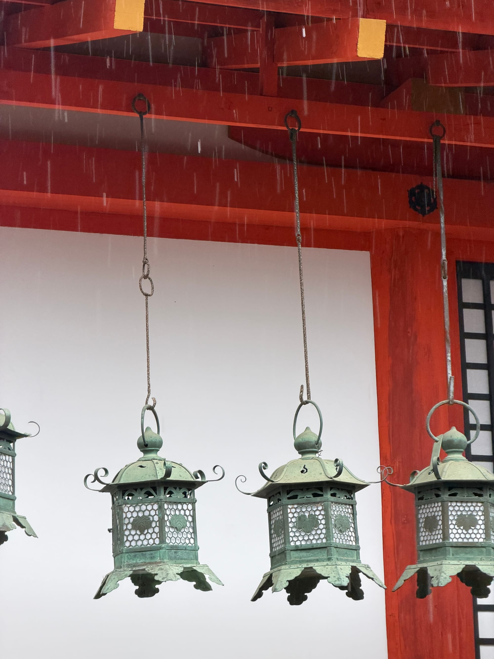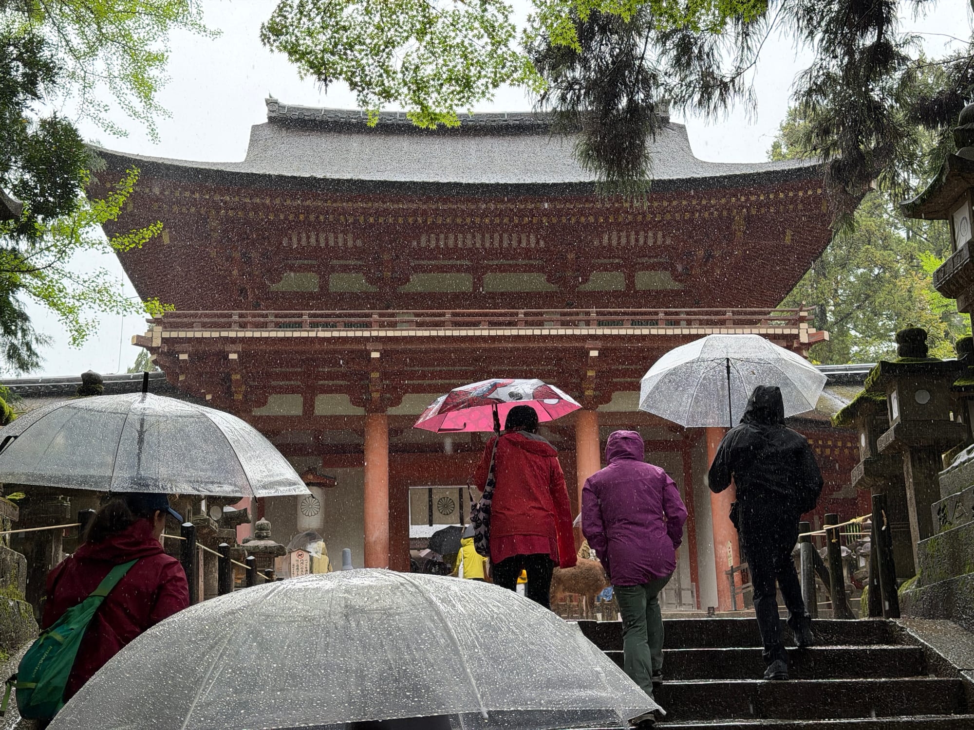 We hopped back on the subway, stopped for lunch in the station, and then made our way to Nara Park. Nara Park is known for its free-roaming deer and world famous temples. The deer are sacred here and have been trained to bow to ask for deer crackers that are sold throughout the park. The rain didn’t stop the deer from coming out to meet and greet those of us that braved the weather. In the park there are also a few other attractions. The first one we visited was the Shrine. The vermillion and white shrine buildings are festooned with beautiful brass lanterns, lit twice a year in winter and summer. The shrine is also famous for wisteria flowers that bloom in May.