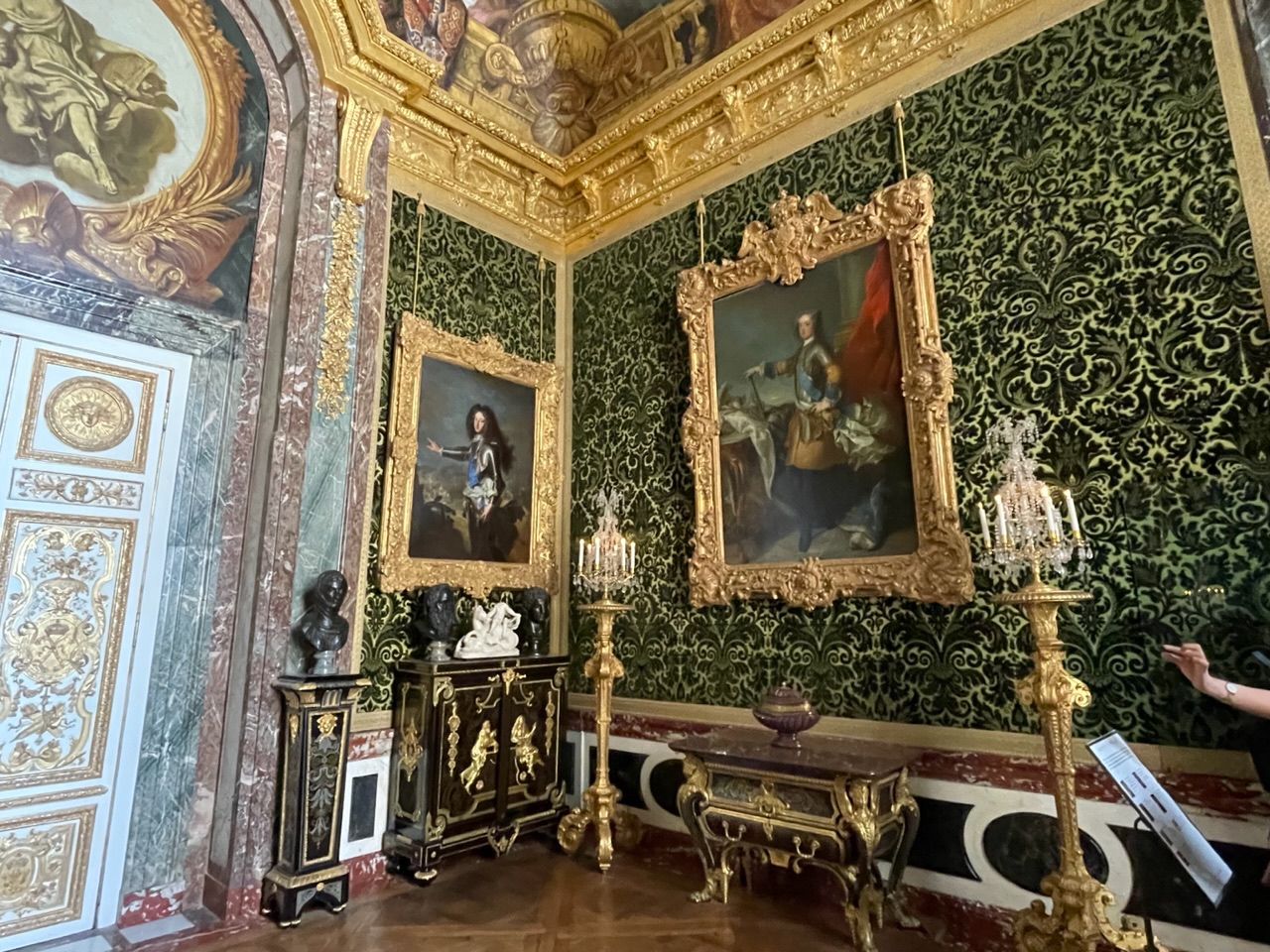 We had a little bit of time before our planned trip to Versailles, so we bought tickets again for Sainte Chapelle, a gothic-style royal chapel built in the 1200s. Our tickets included access to the Conciergerie, a former courthouse and prison. During the French Revolution, thousands of prisoners, including Marie-Antoinette, were imprisoned, tried, and sentenced at the Conciergerie, then sent to different sites to be executed by the guillotine. The Conciergerie offered a free tablet with an AR feature that showed how the space would have looked at the time.